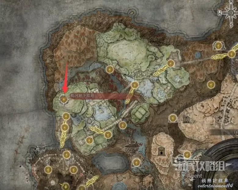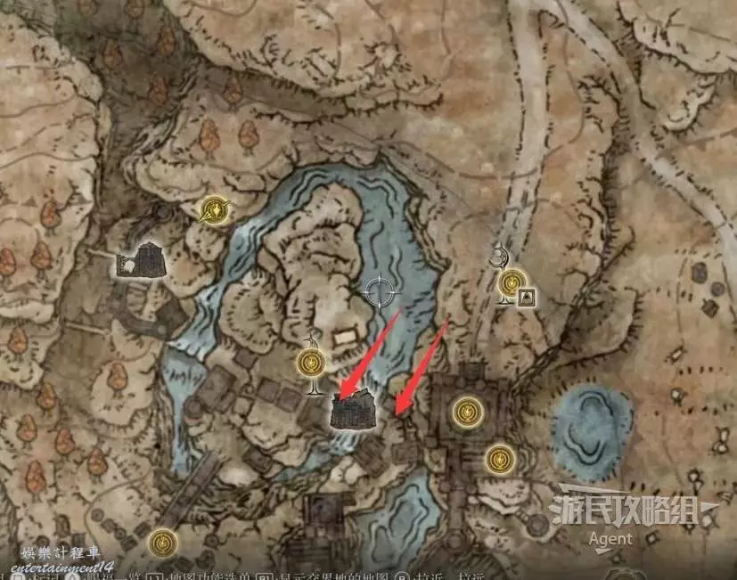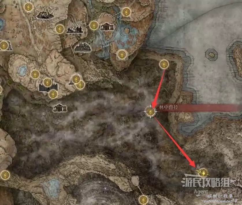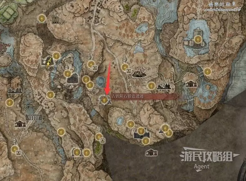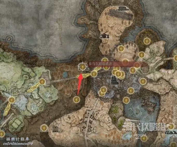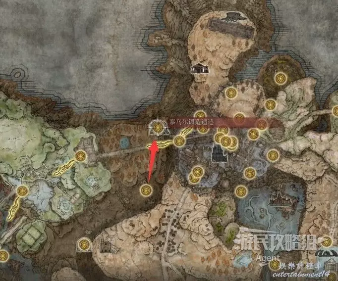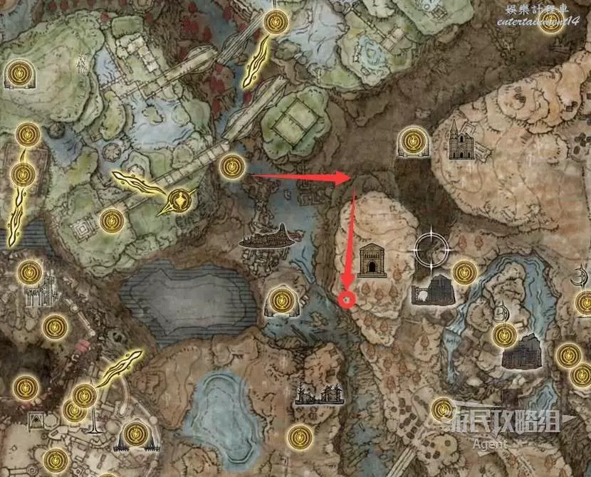 走過艾拉克大橋後,往南前往熔岩管鍛造遺跡。(下圖往東的箭頭是去毒池的路,不用管)