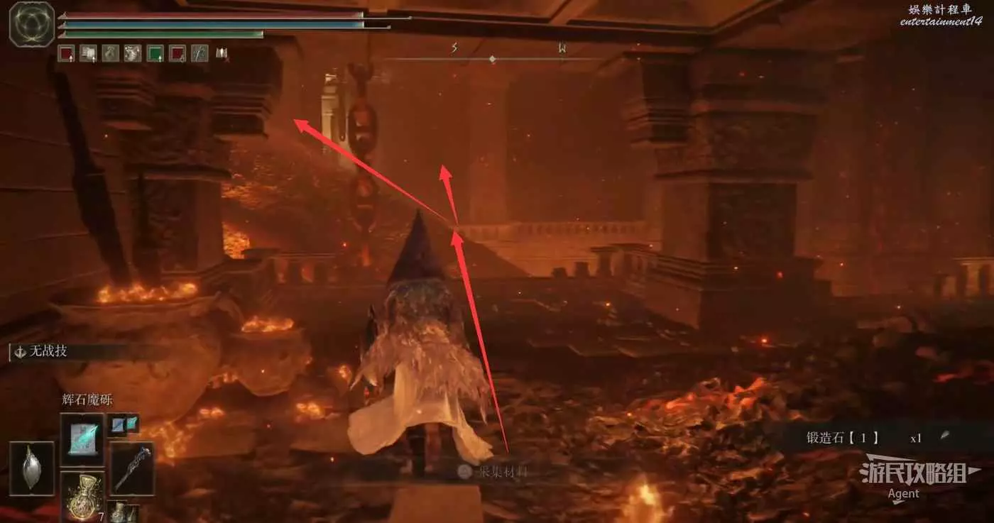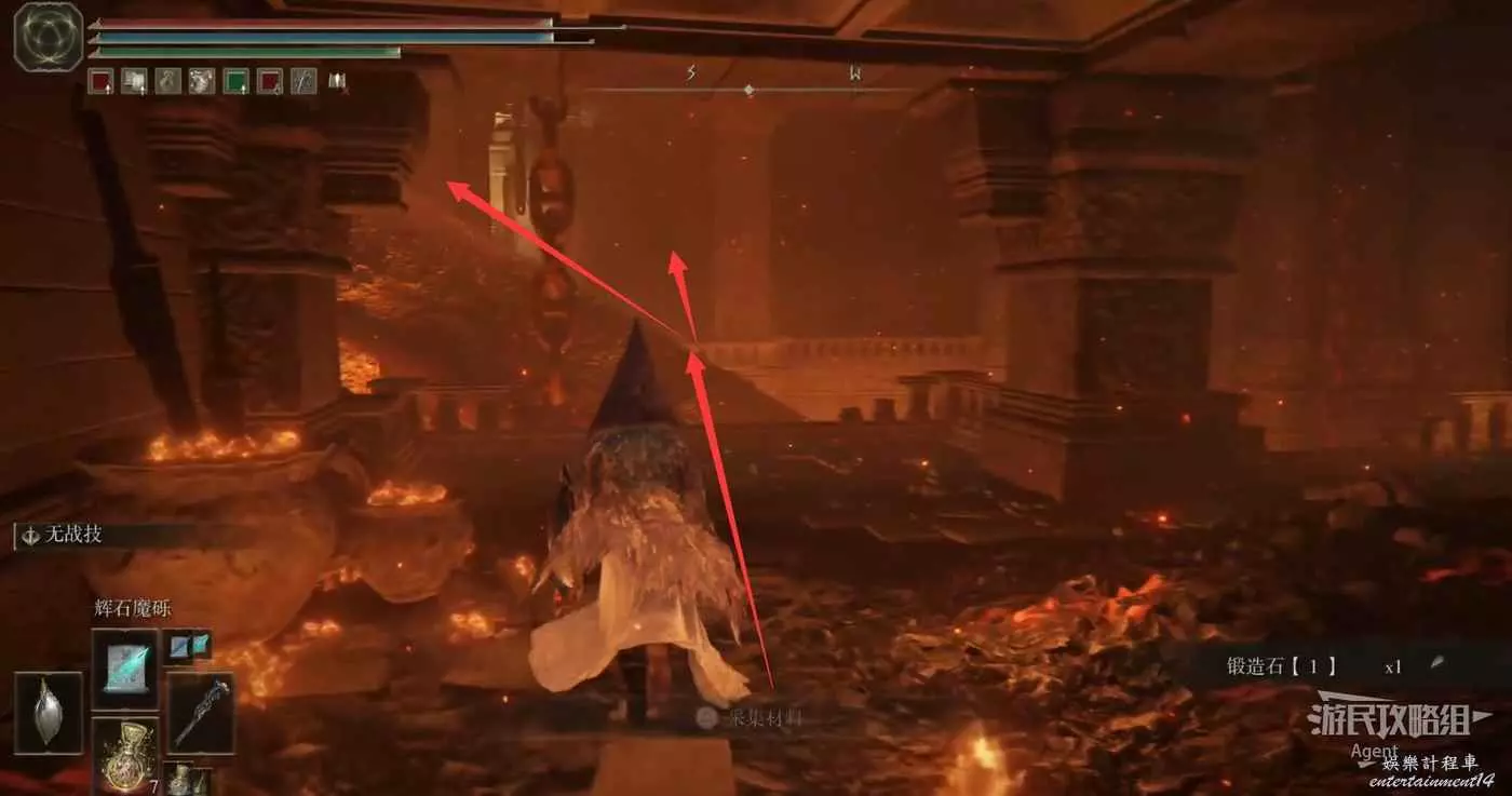 跳到大鐵棍上,先跳到對面撿到【武器】流紋大槌。然後回來沿著大鐵棍往上走,刷遺跡裡的大個子怪物,概率掉落【武器】魔像拳頭。