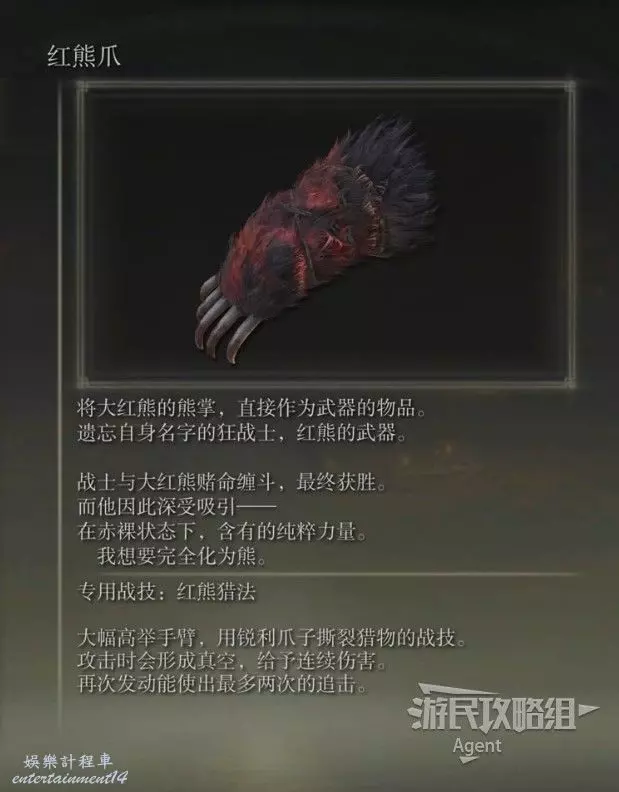 進入北方無名靈廟,擊敗紅熊得到【武器】紅熊爪、【防具】鐵鉚釘套裝。