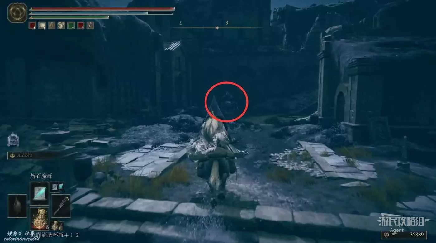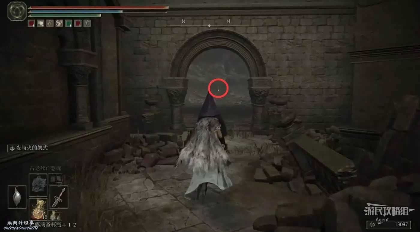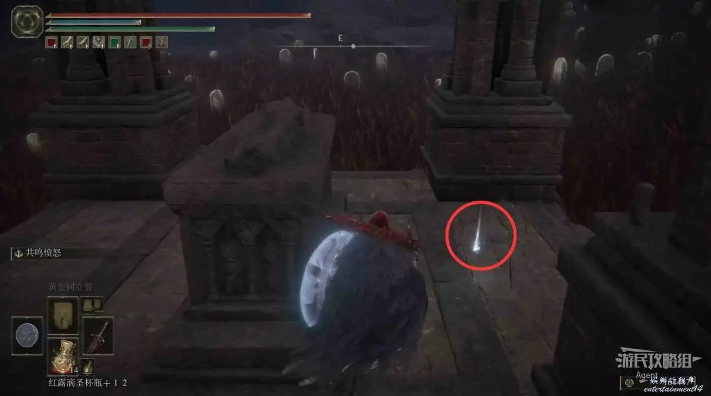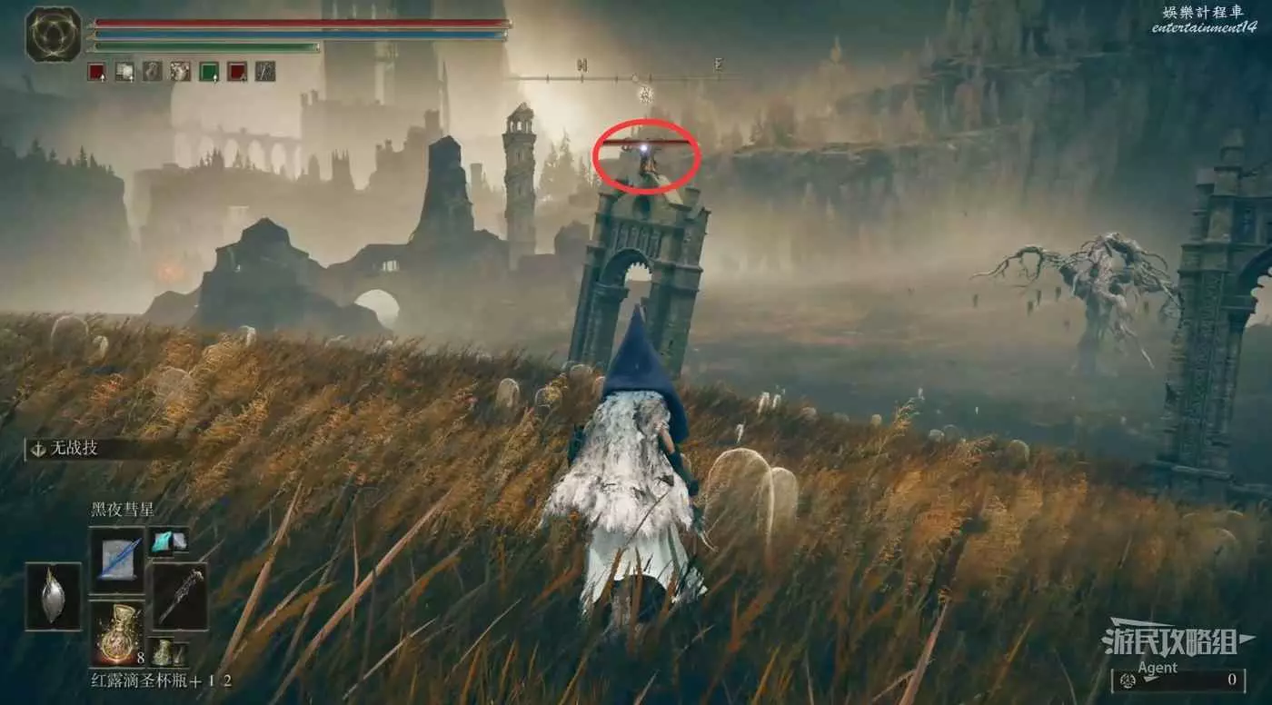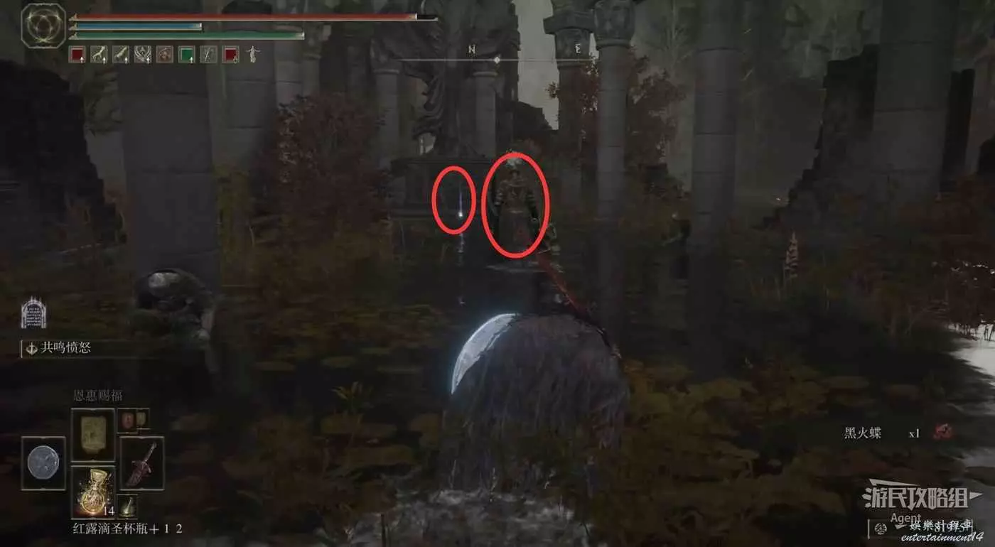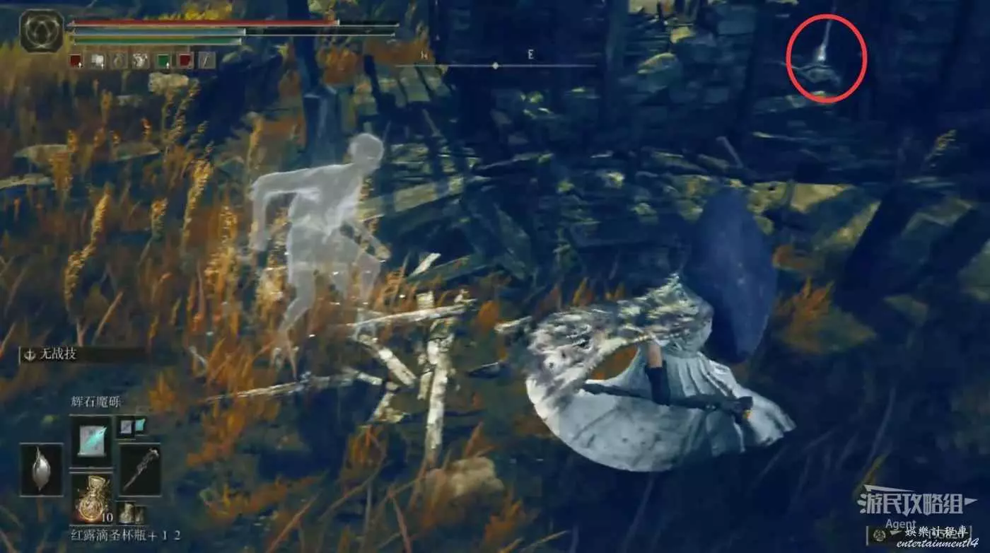 從“古遺跡下方”賜福點出發,小心路上有兩個魔像,到下圖圈出位置摧毀石碓解鎖風柱,然後就可以利用風柱跳上高地,來到北方無名靈廟。