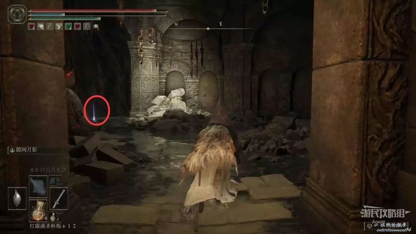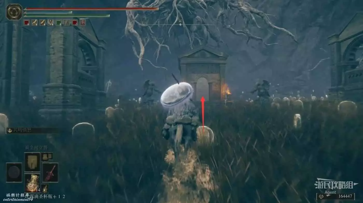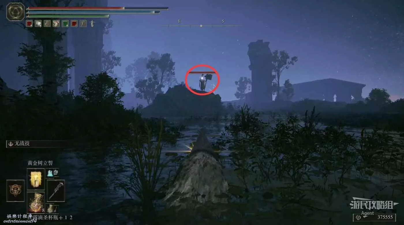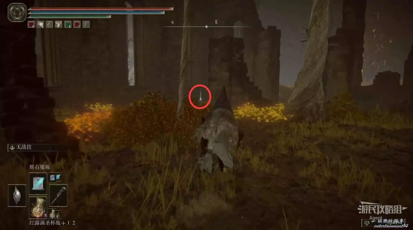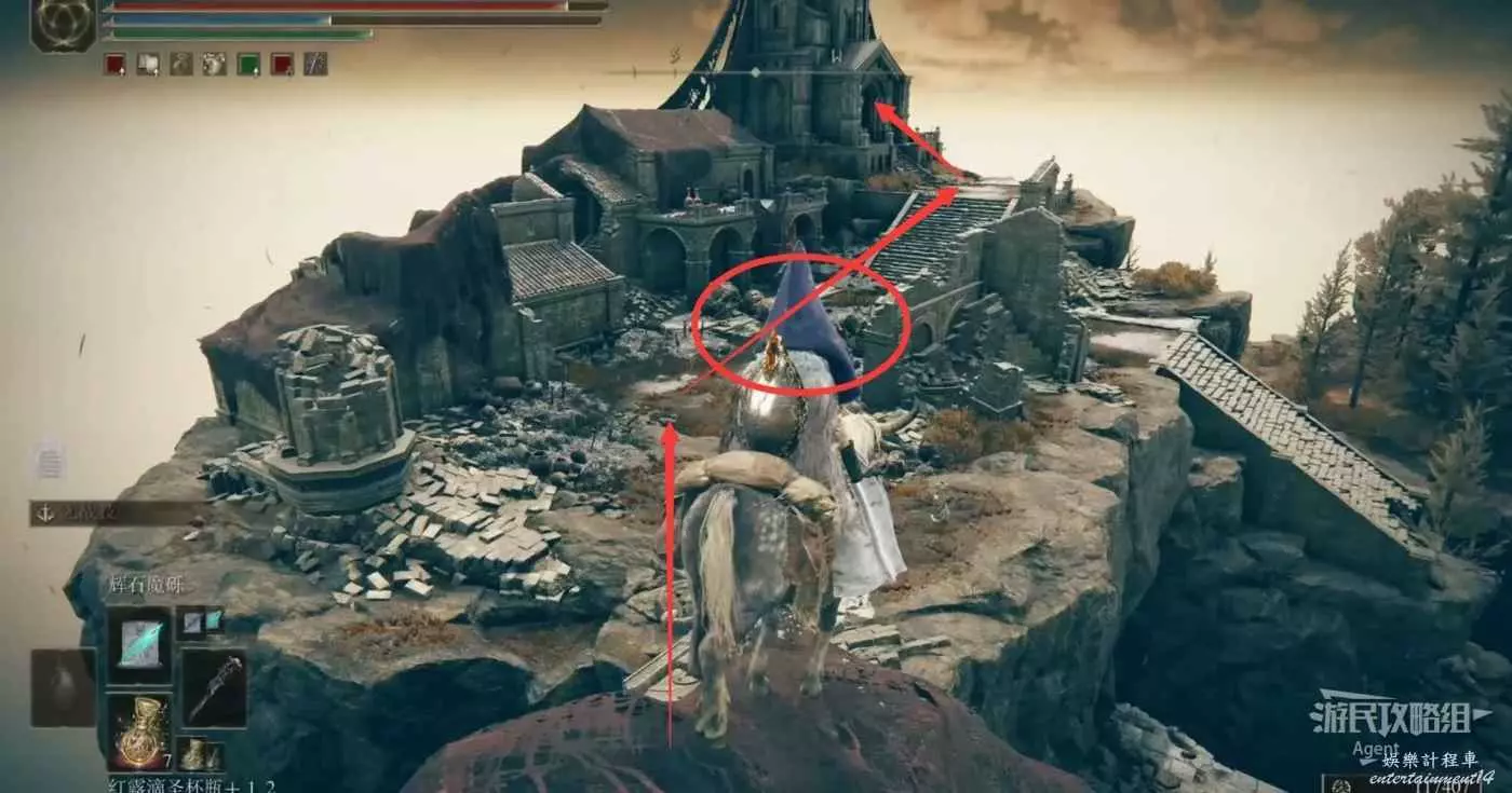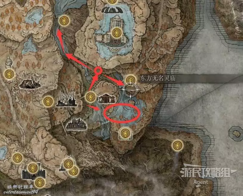 從“古遺跡下方”賜福點出發,小心路上有兩個魔像,到下圖圈出位置摧毀石碓解鎖風柱,然後就可以利用風柱跳上高地,來到北方無名靈廟。
