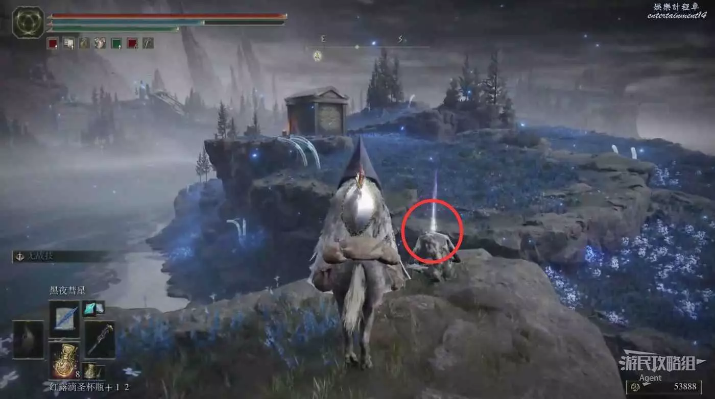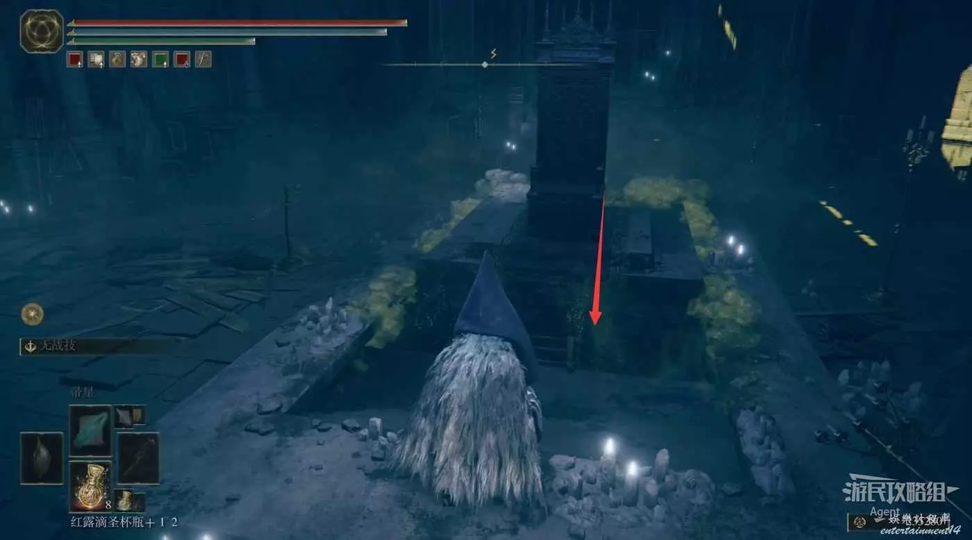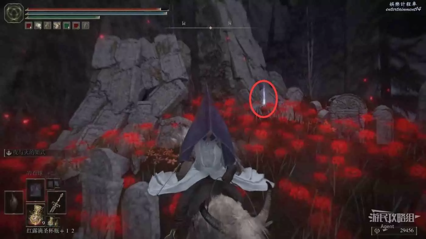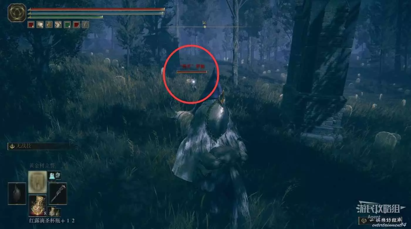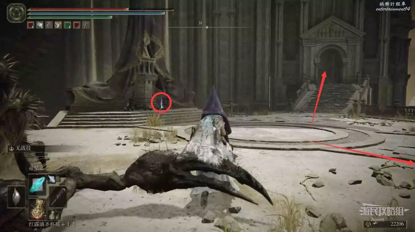 從“古遺跡下方”賜福點出發,小心路上有兩個魔像,到下圖圈出位置摧毀石碓解鎖風柱,然後就可以利用風柱跳上高地,來到北方無名靈廟。
