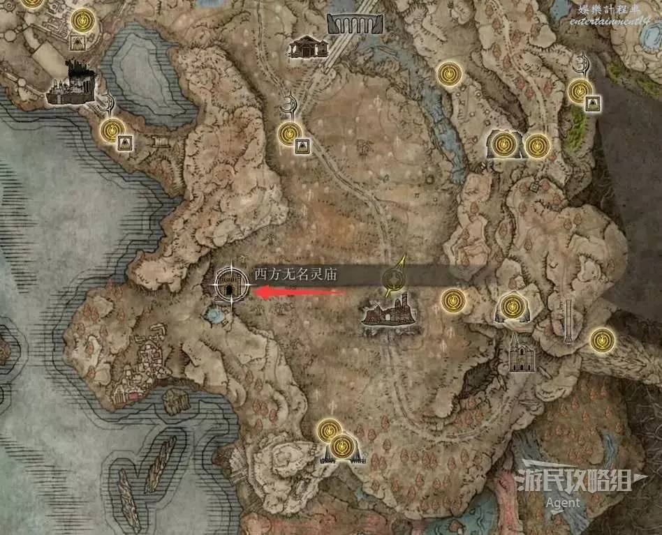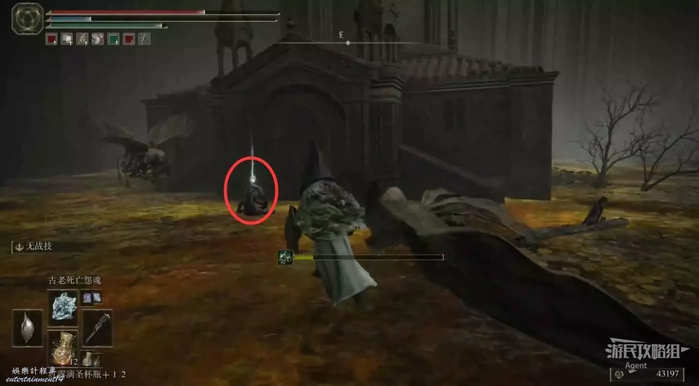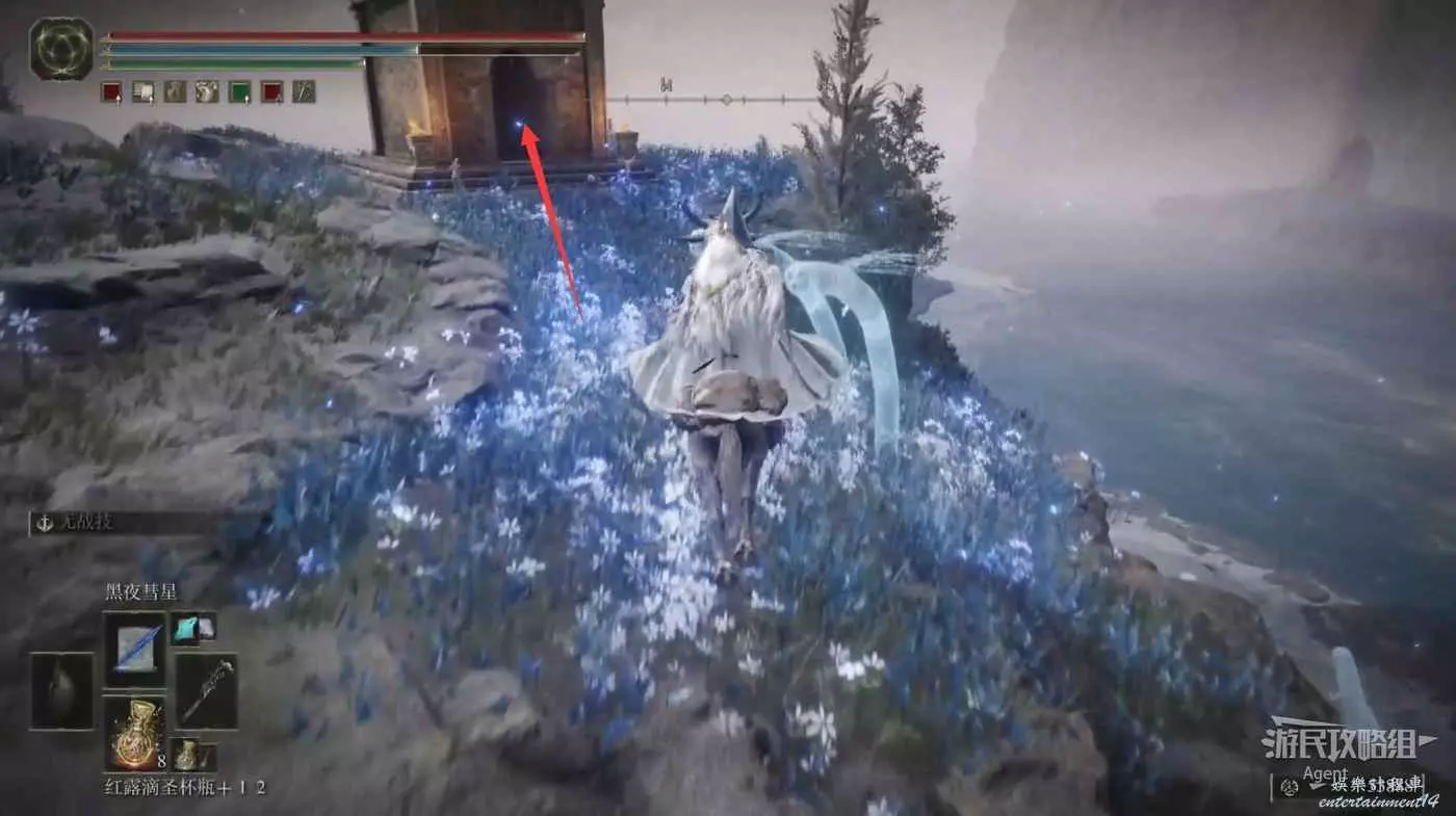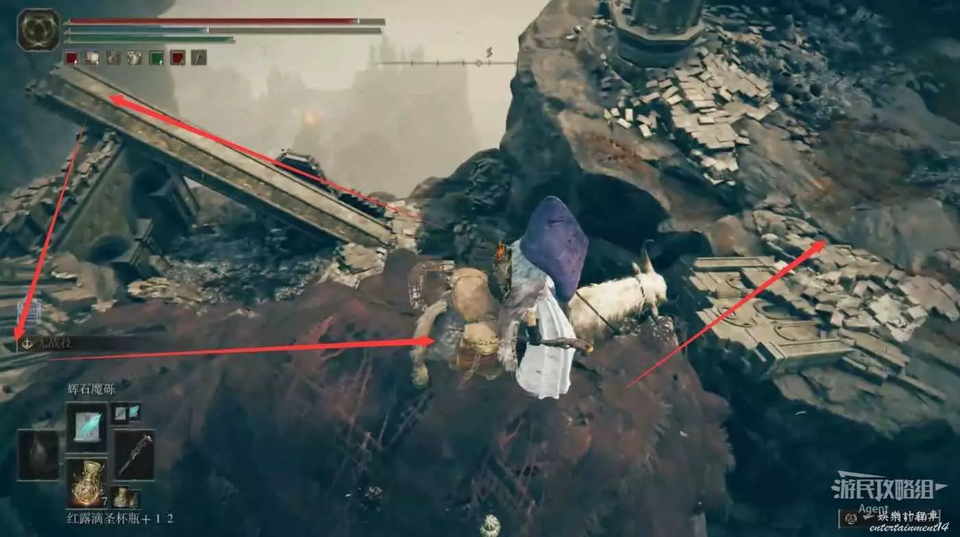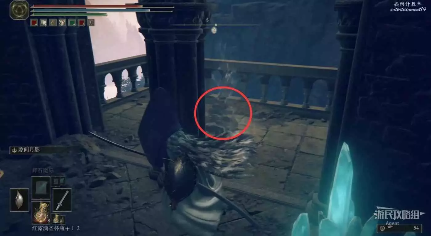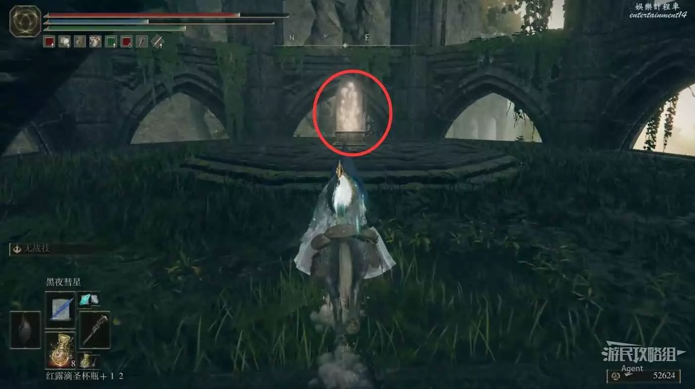 從“古遺跡下方”賜福點出發,小心路上有兩個魔像,到下圖圈出位置摧毀石碓解鎖風柱,然後就可以利用風柱跳上高地,來到北方無名靈廟。