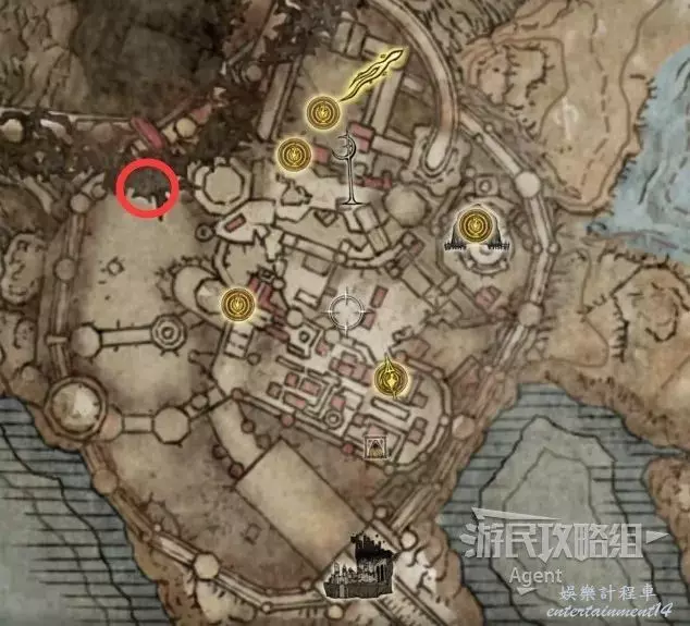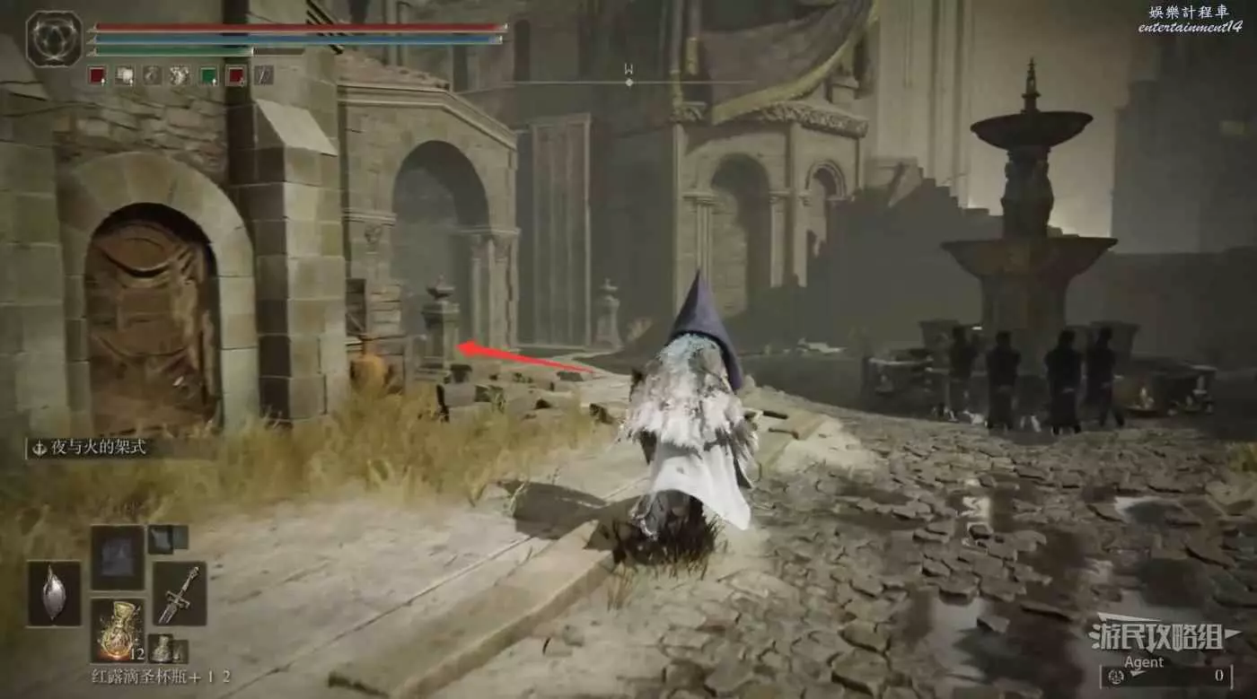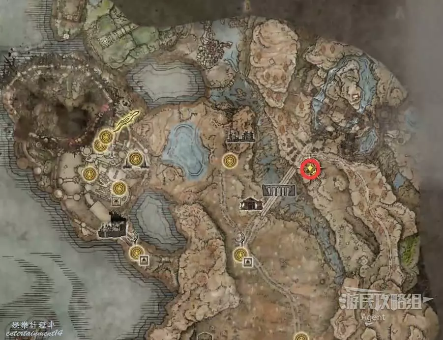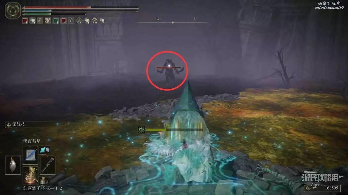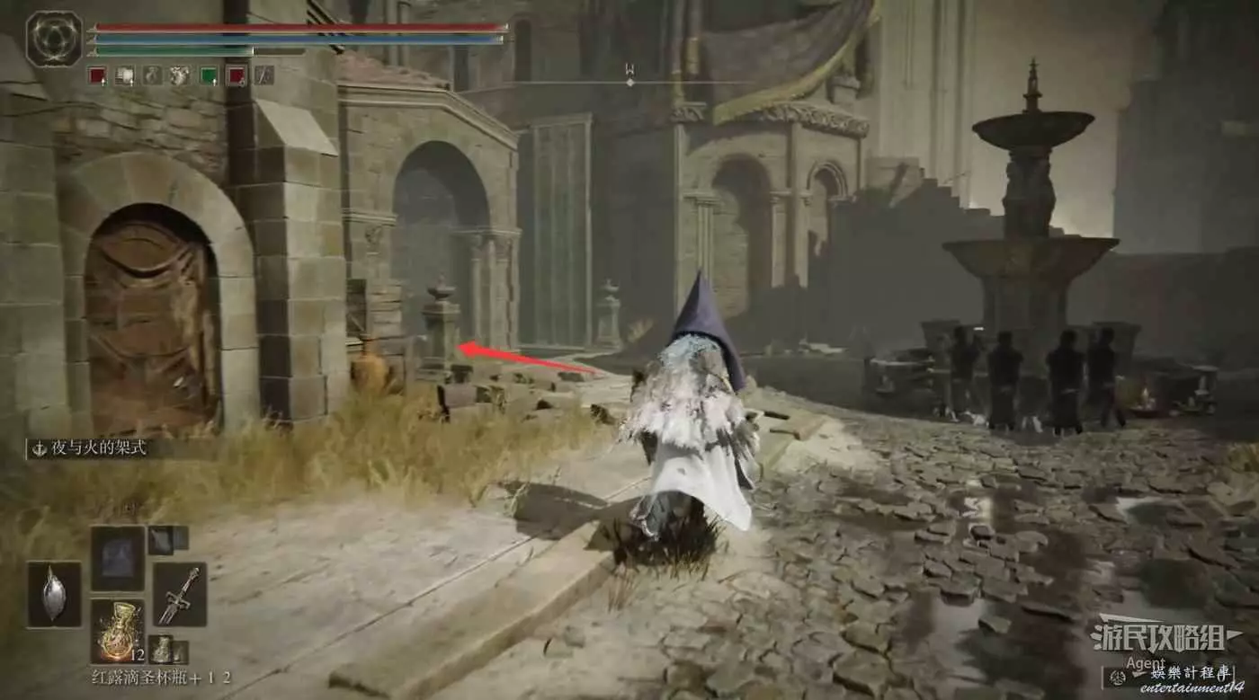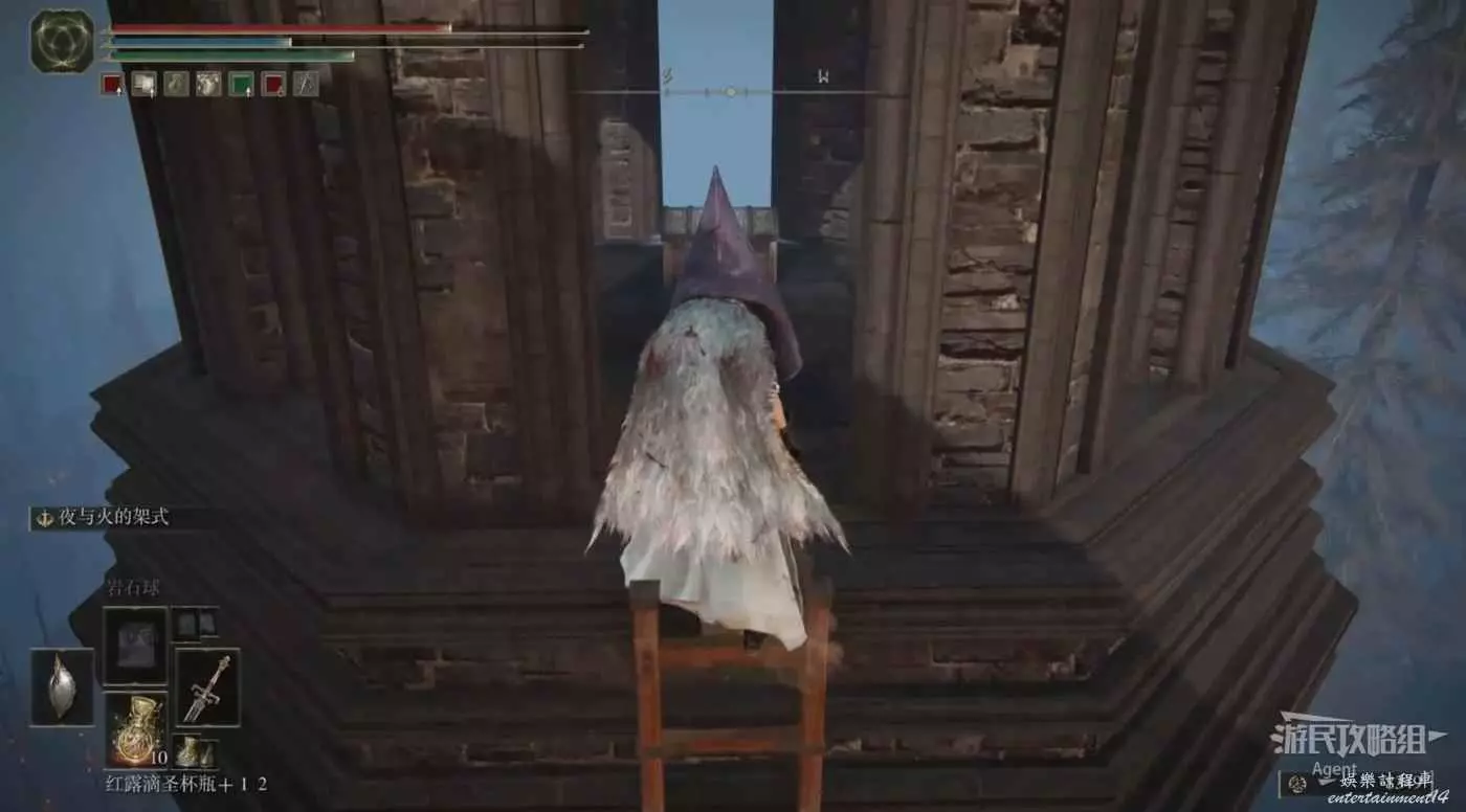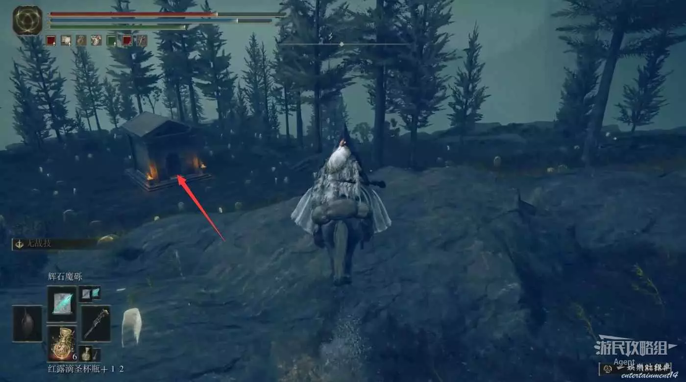 從“古遺跡下方”賜福點出發,小心路上有兩個魔像,到下圖圈出位置摧毀石碓解鎖風柱,然後就可以利用風柱跳上高地,來到北方無名靈廟。