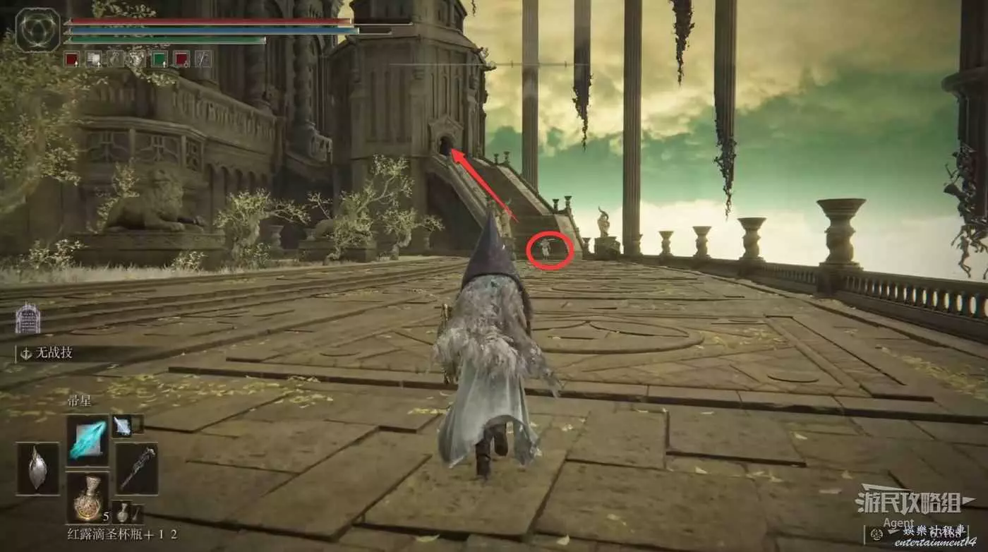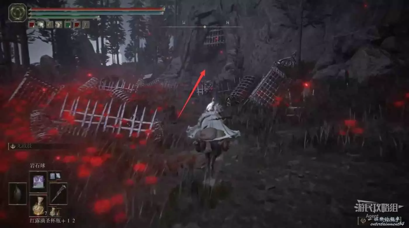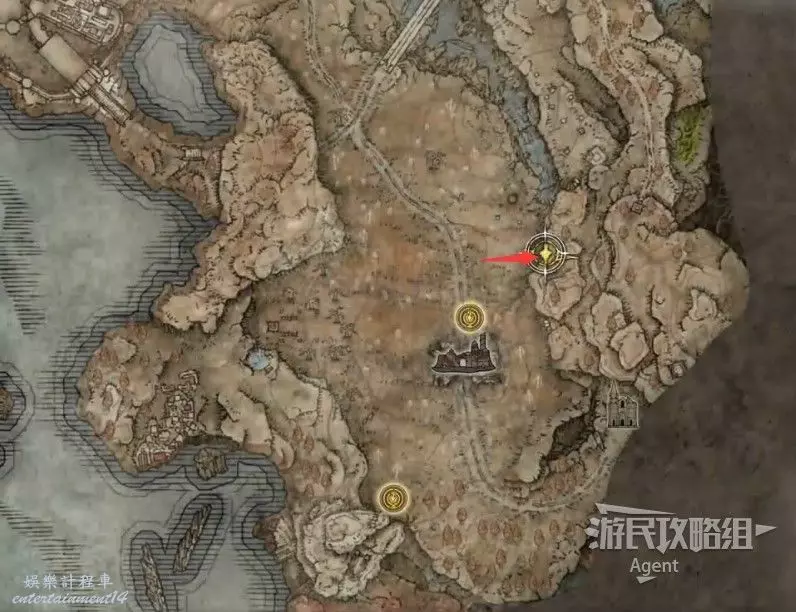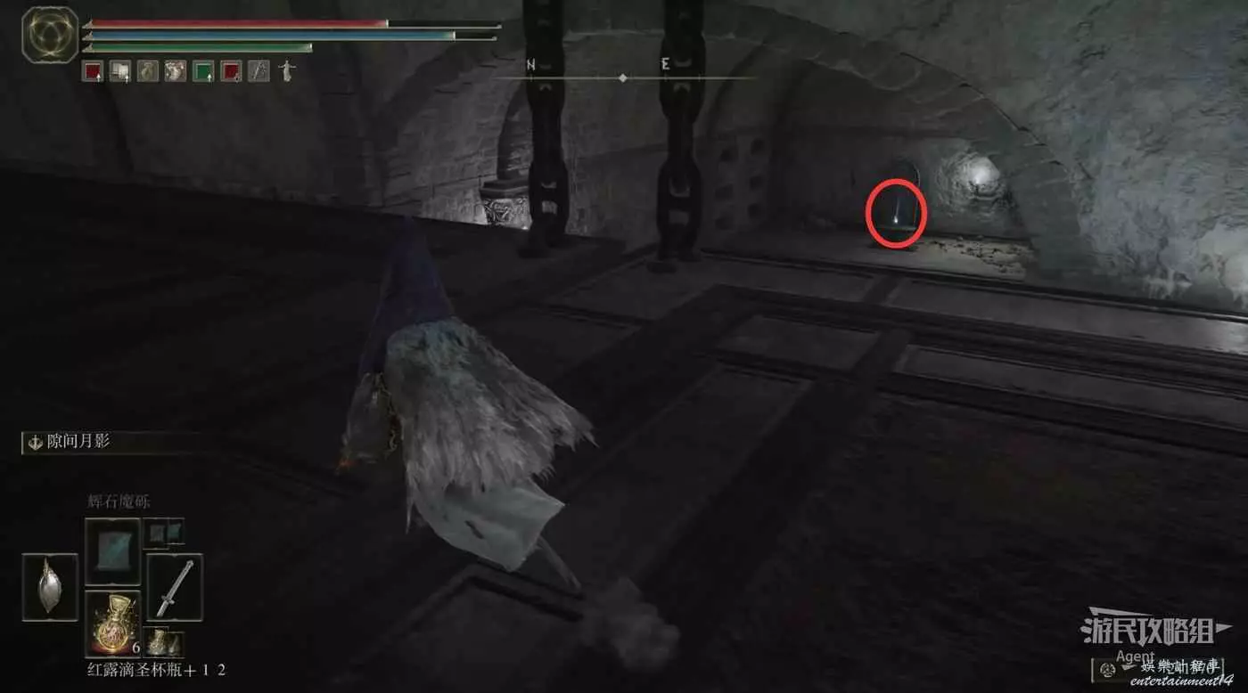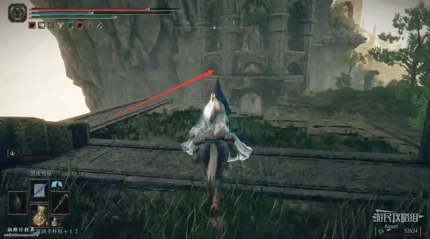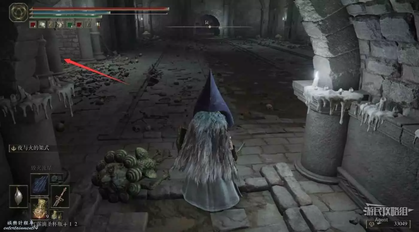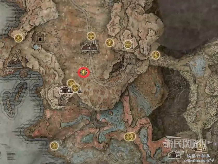 從“古遺跡下方”賜福點出發,小心路上有兩個魔像,到下圖圈出位置摧毀石碓解鎖風柱,然後就可以利用風柱跳上高地,來到北方無名靈廟。