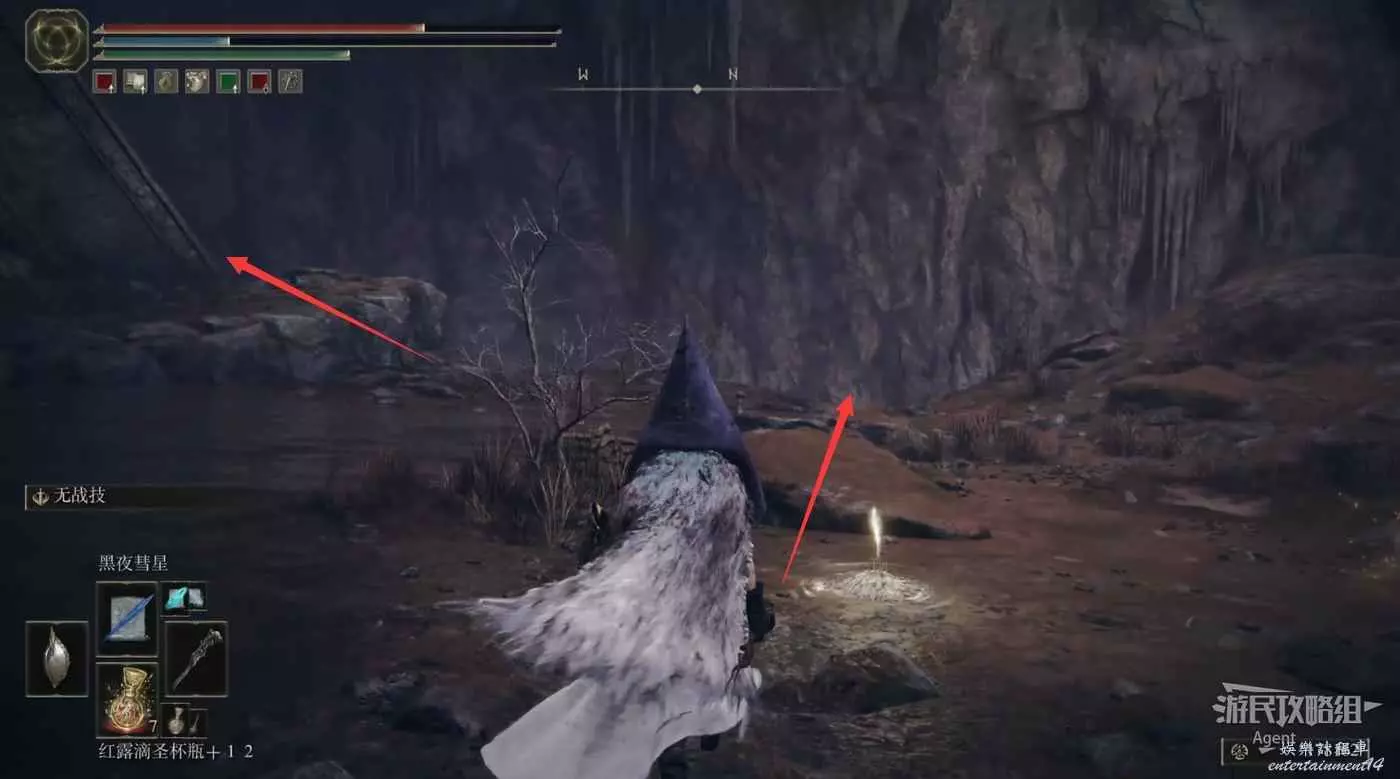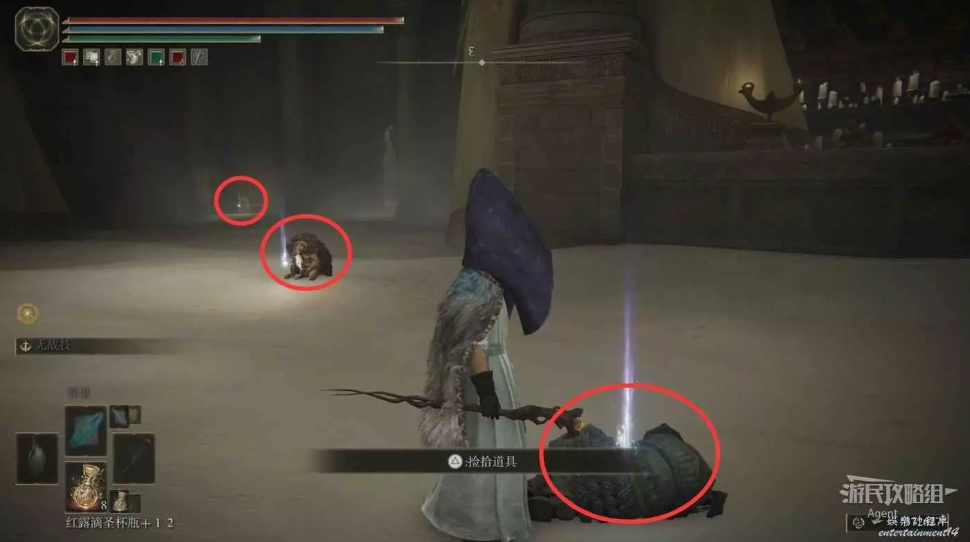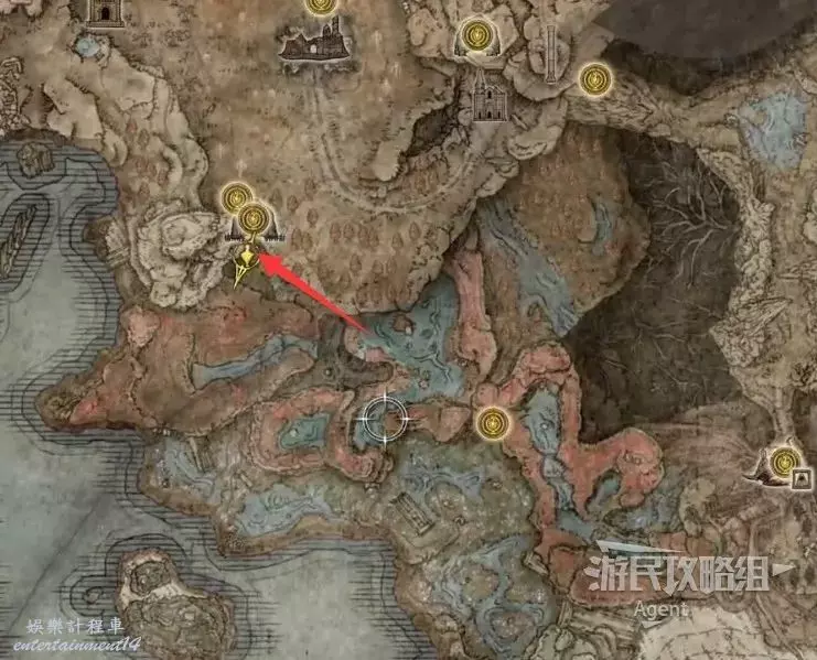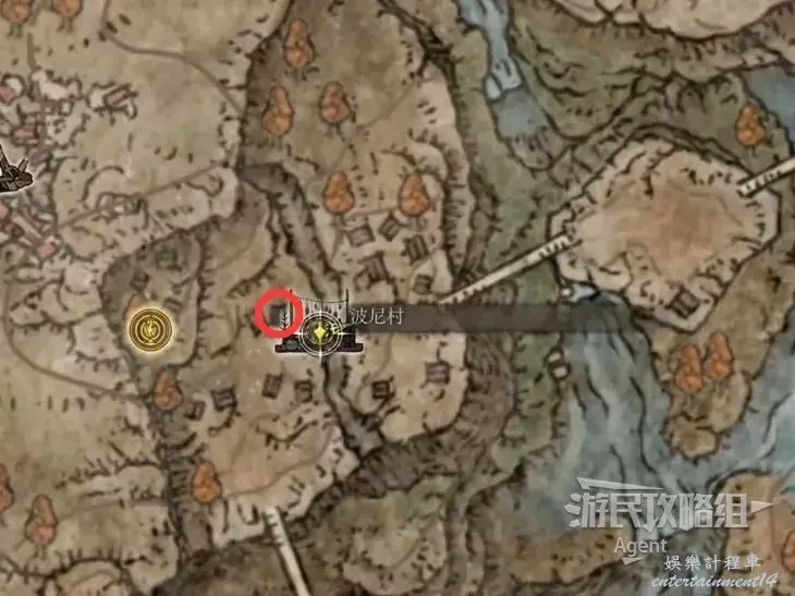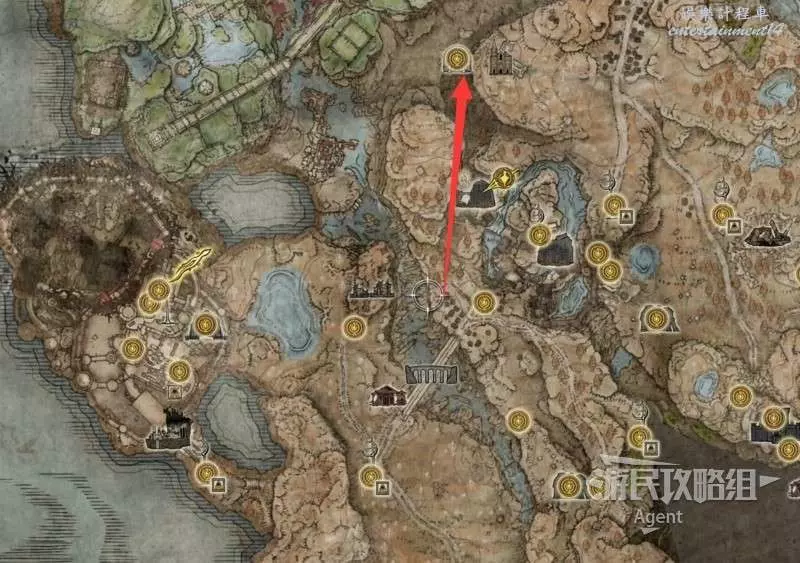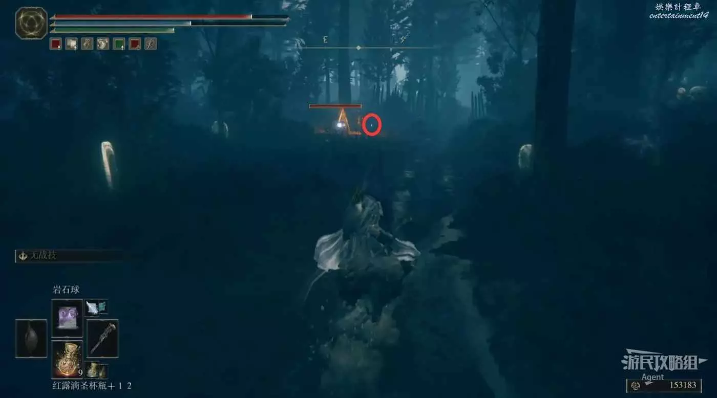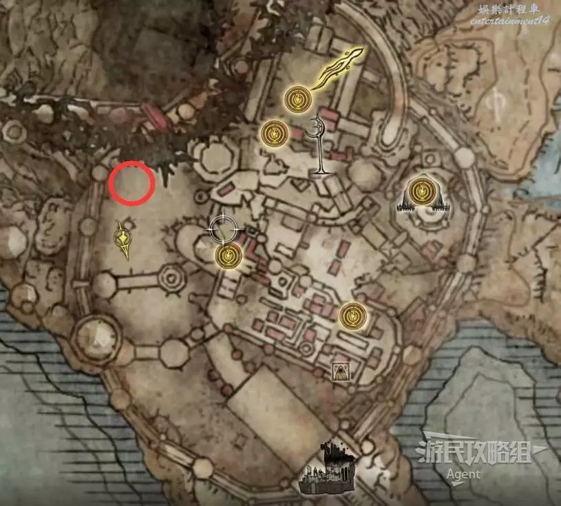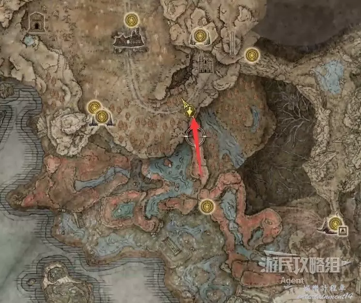 從“古遺跡下方”賜福點出發,小心路上有兩個魔像,到下圖圈出位置摧毀石碓解鎖風柱,然後就可以利用風柱跳上高地,來到北方無名靈廟。
