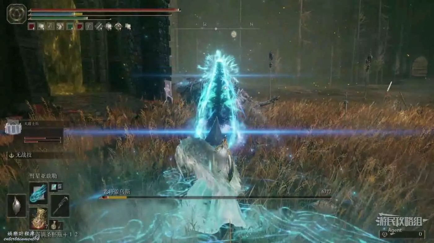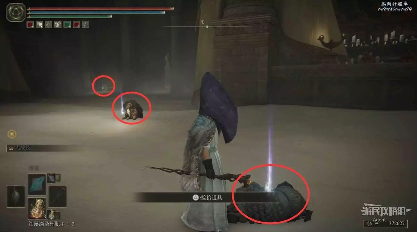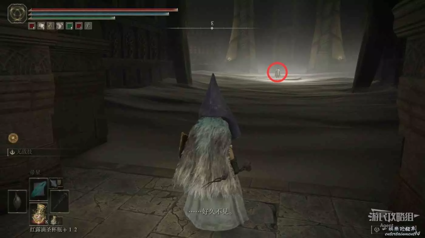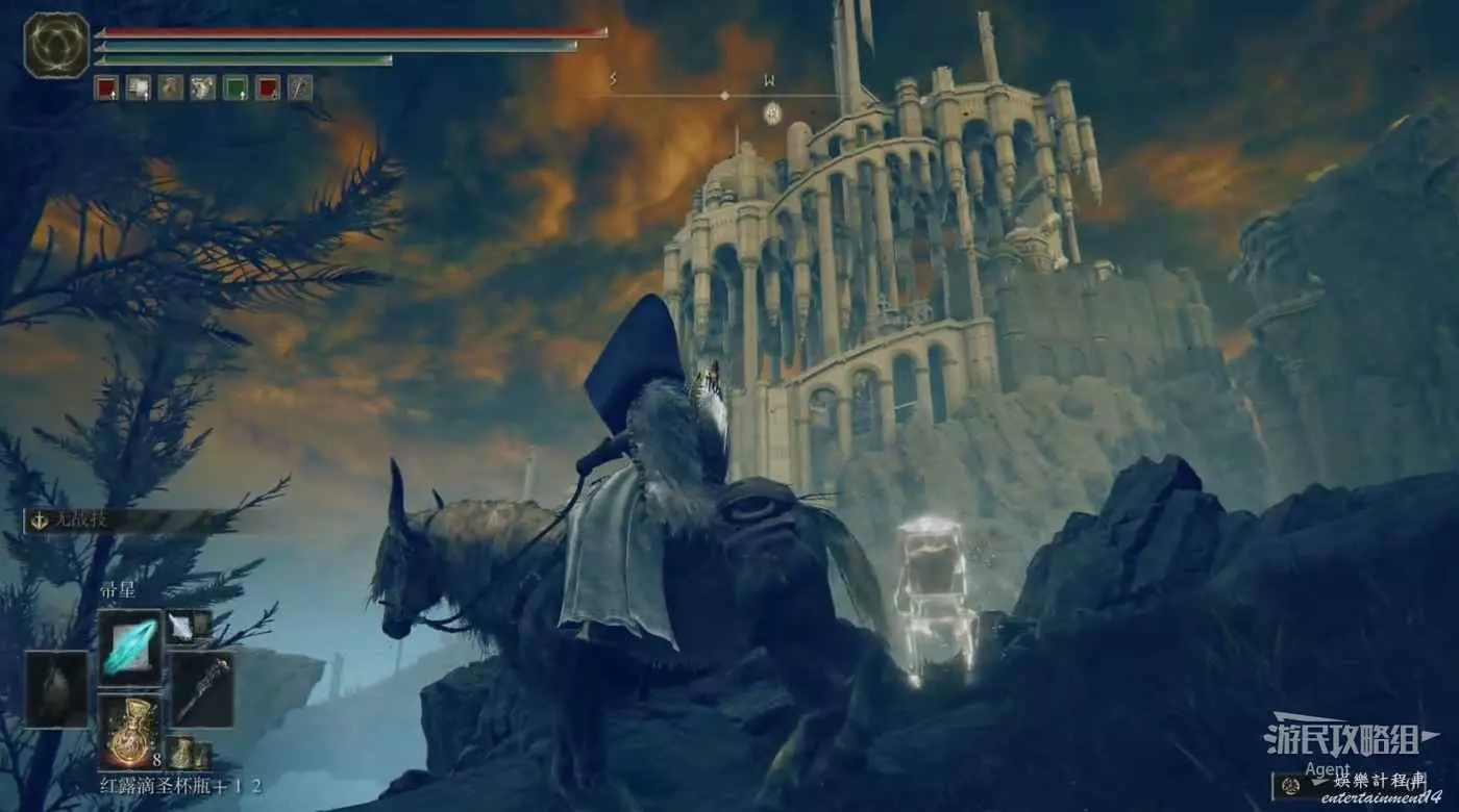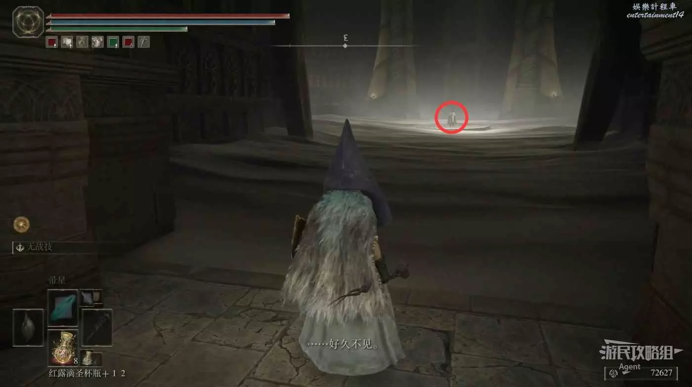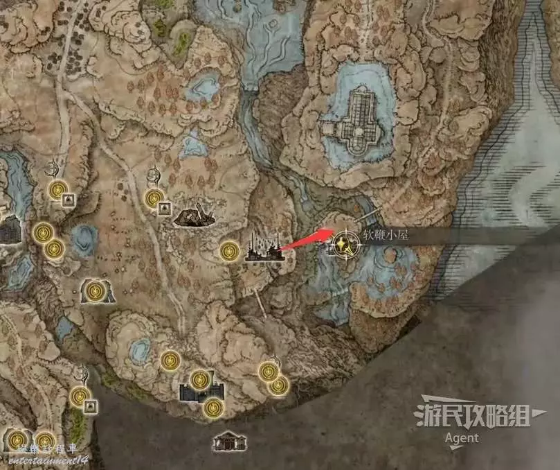 從“古遺跡下方”賜福點出發,小心路上有兩個魔像,到下圖圈出位置摧毀石碓解鎖風柱,然後就可以利用風柱跳上高地,來到北方無名靈廟。
