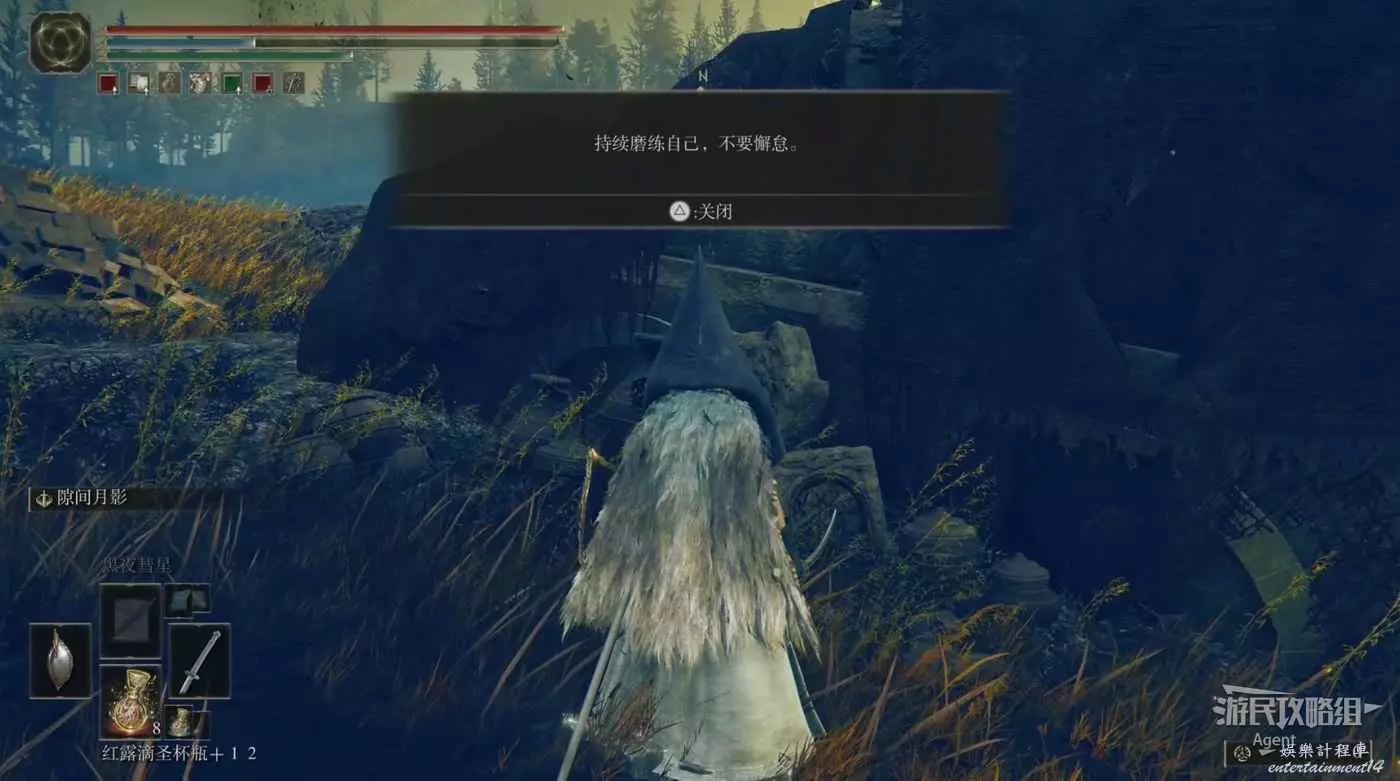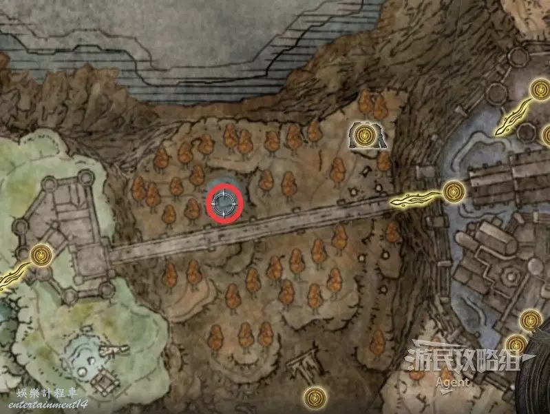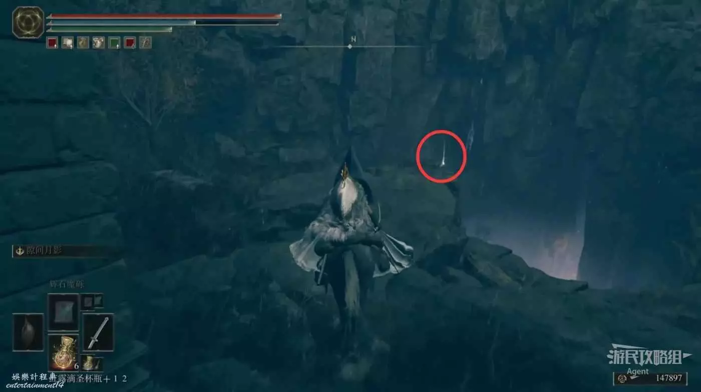 向北到下圖小圈位置,地上有提示讓你留意瀑布。地上的提示附近,到下面一層撿到【武器】落葉聖印記。旁邊的瀑布底部,撿到【防具】落葉派套裝。然後往北逆流而上,瀑布下撿到【幽影樹碎片】。
