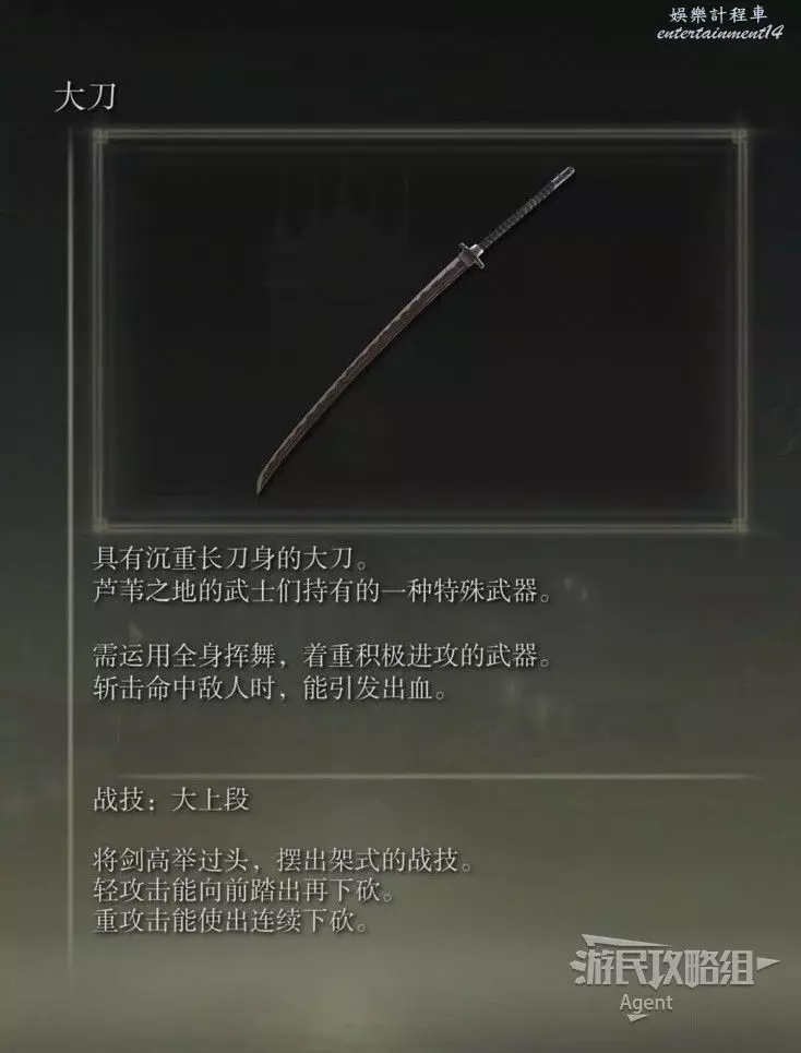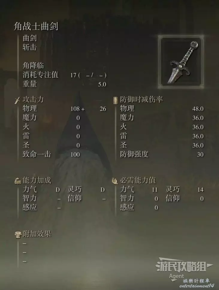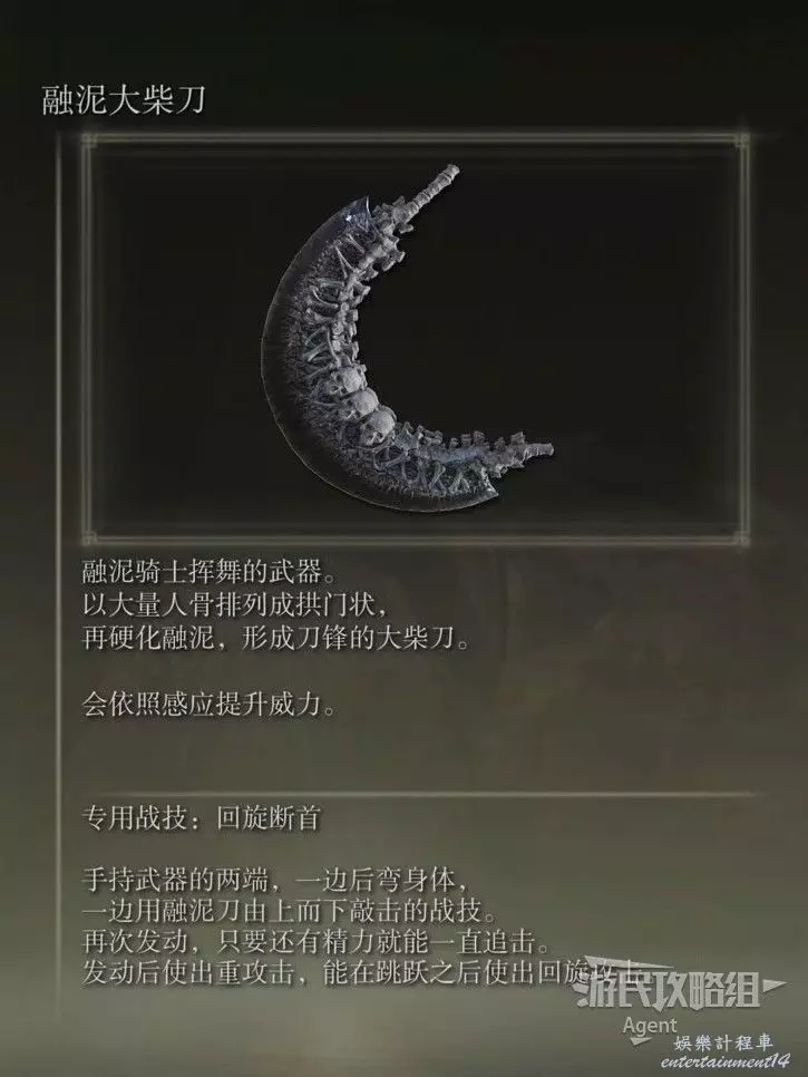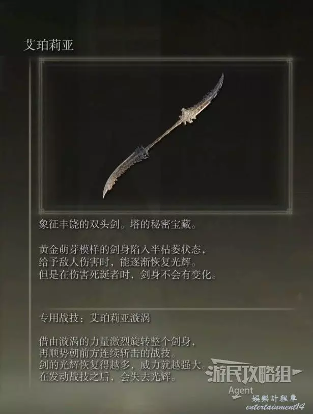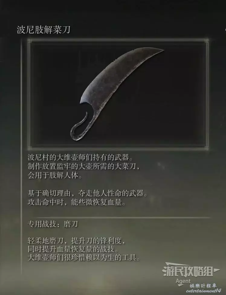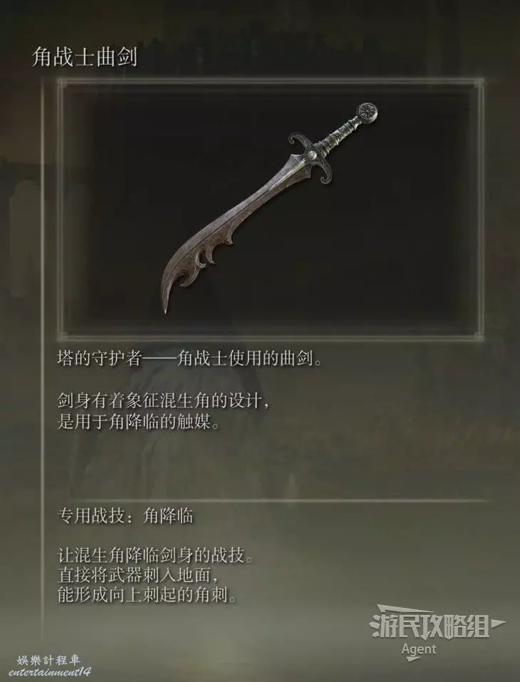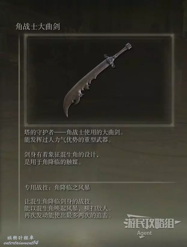 在艾尼爾·伊利姆,經過螺旋塔,前往淨身廳前室,路上擊敗精英敵人得到【武器】角戰士大麯劍。