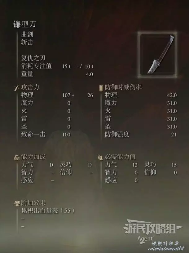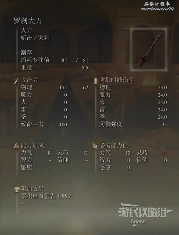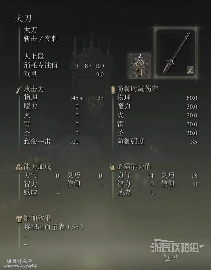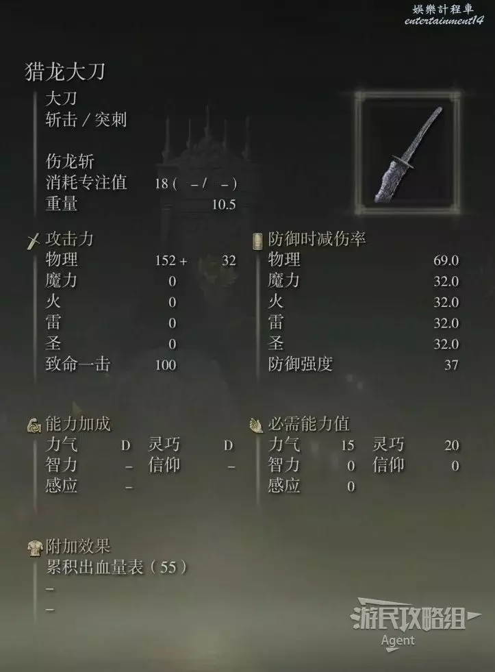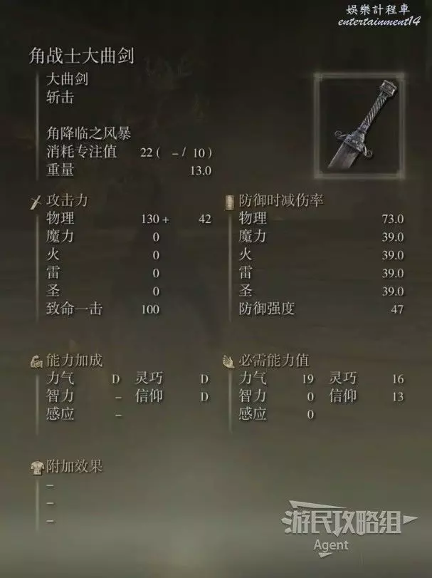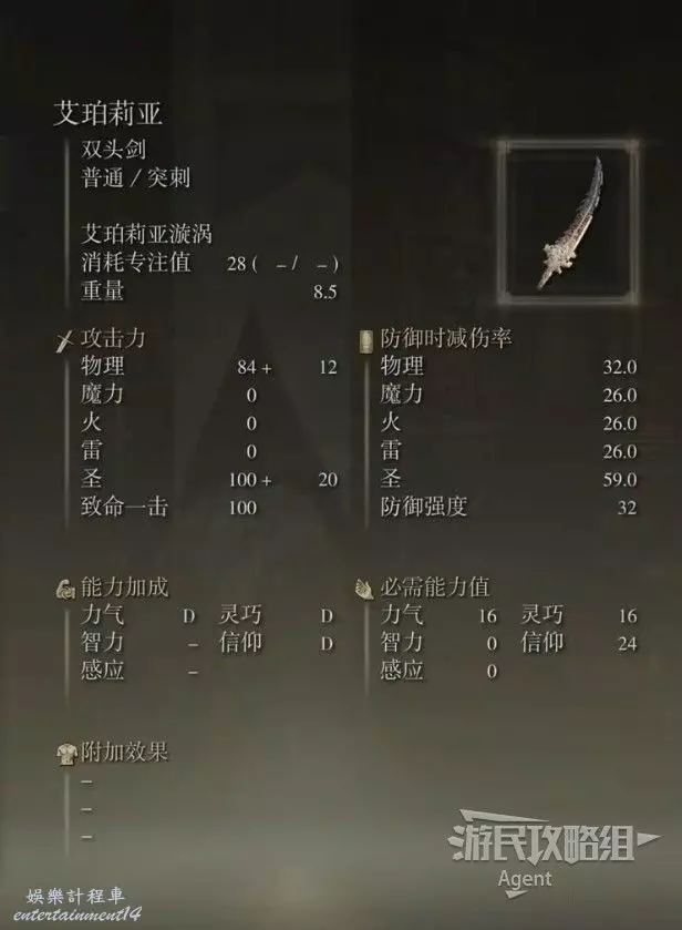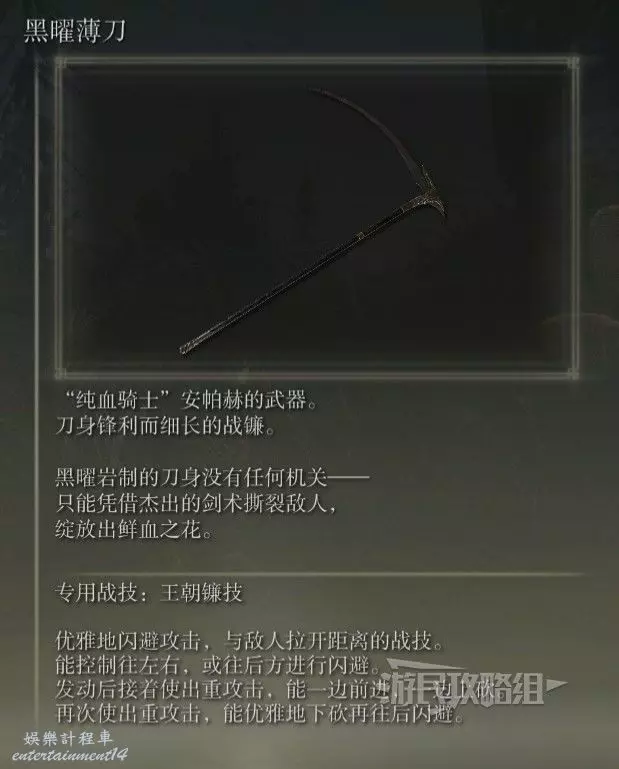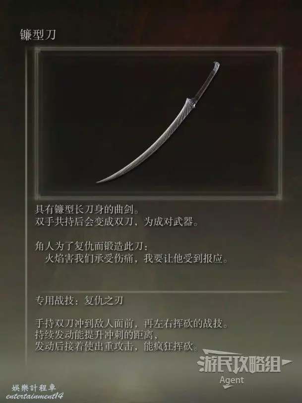 在艾尼爾·伊利姆,經過螺旋塔,前往淨身廳前室,路上擊敗精英敵人得到【武器】角戰士大麯劍。
