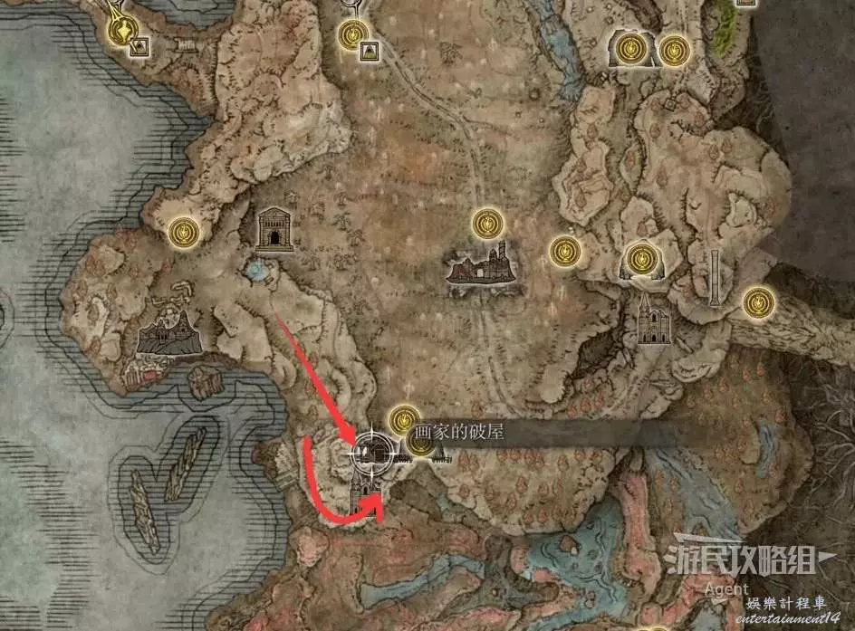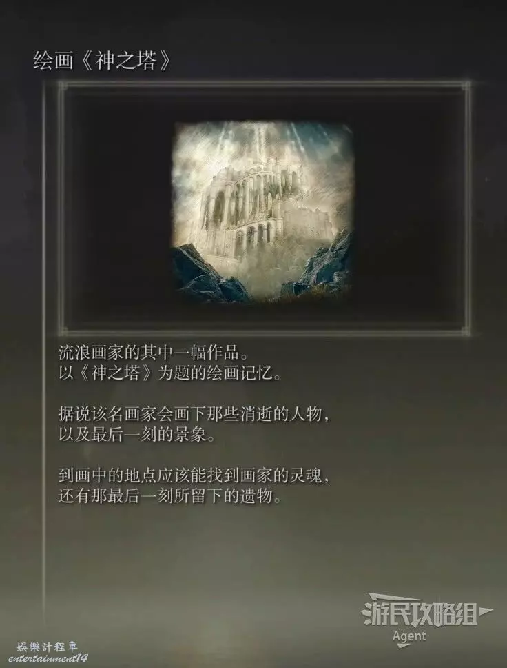 在勞弗古遺跡的花蕾教堂燒樹後,到北方無名靈廟所在的高地上,下圖圈出位置找到繪畫《神之塔》的藏寶地點,撿到【武器】螺旋樹聖印記。