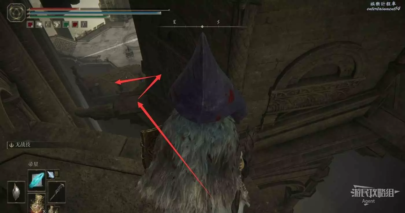 其中,從下圖左邊的箭頭處跳下去,可抵達恩希斯城關卡城門的樓上,開寶箱得到【武器】卡利亞魔法劍。