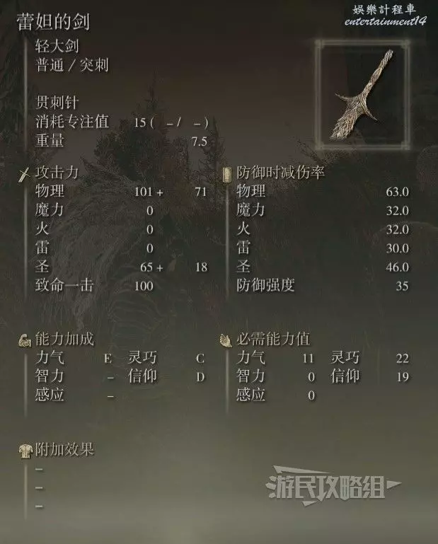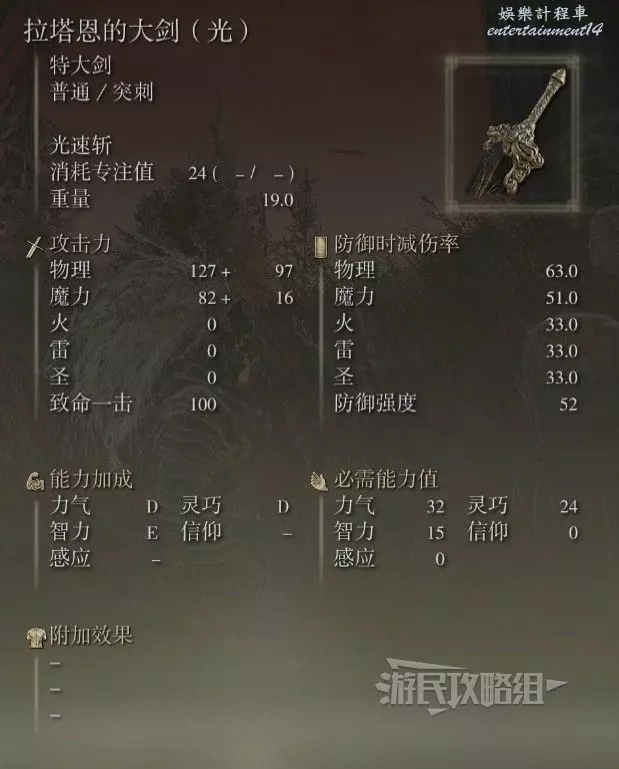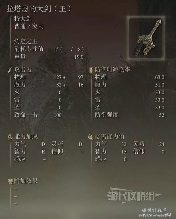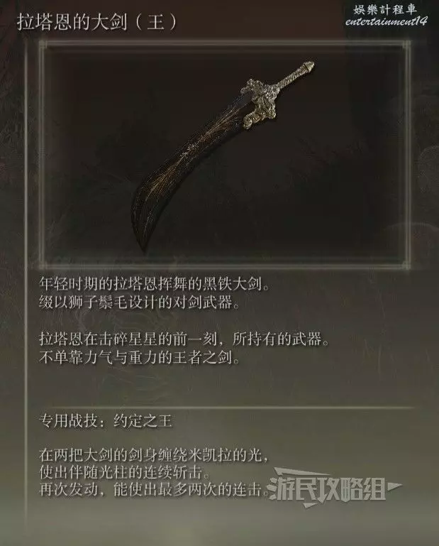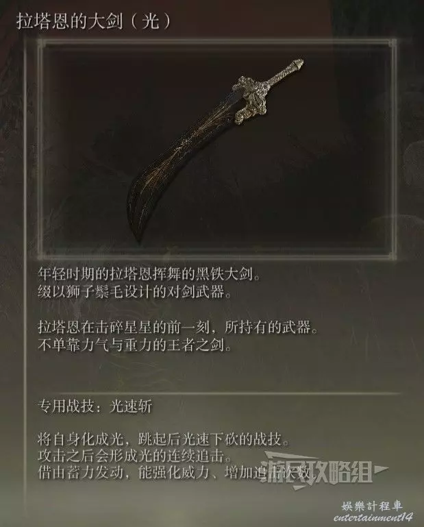 擊敗最終BOSS後,得到神祇與王的追憶。到大賜福找“解指”恩雅,用神祇與王的追憶可兌換【武器】拉塔恩的大劍(王)、【武器】拉塔恩的大劍(光)、【禱告】米凱拉的光。