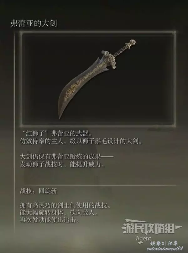戰鬥結束後得到武器【蕾妲的劍】。旁邊撿到莫爾、“紅獅子”弗蕾亞、“落葉”丹恩的裝備,其中包括【武器】弗蕾亞的大劍、【武器】丹恩流踢擊術。詳細攻略見全NPC任務攻略