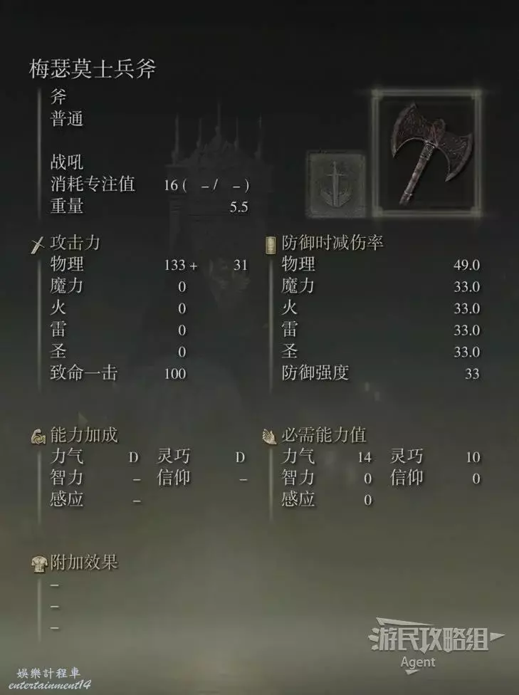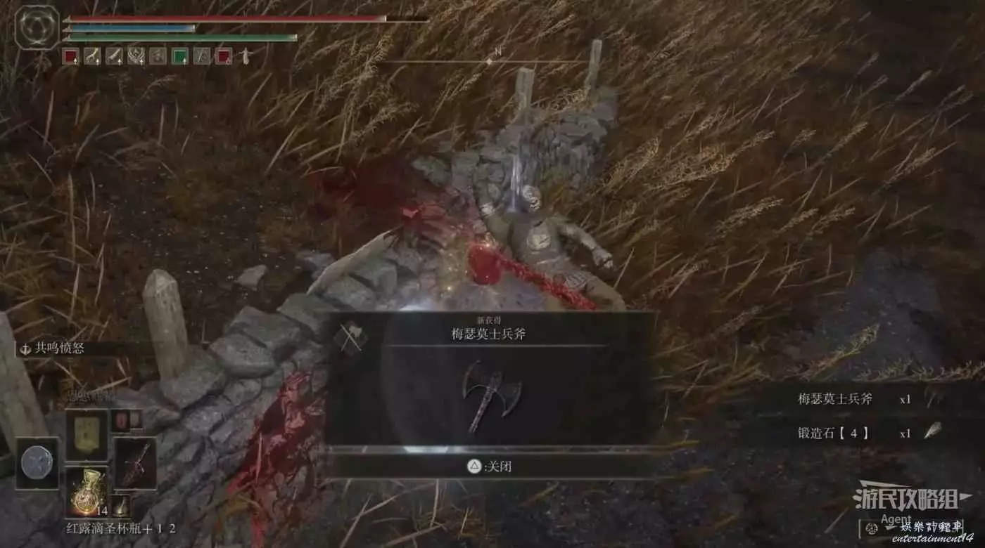墓地平原東面的慰借教堂附近,打小兵會掉落【武器】梅瑟莫士兵斧。在地圖上逛時,多打這種小兵還會掉落梅瑟莫士兵的護甲套裝。(在其他地方遇到的其他種類士兵,也會掉落相應種類的武器、護甲套裝)