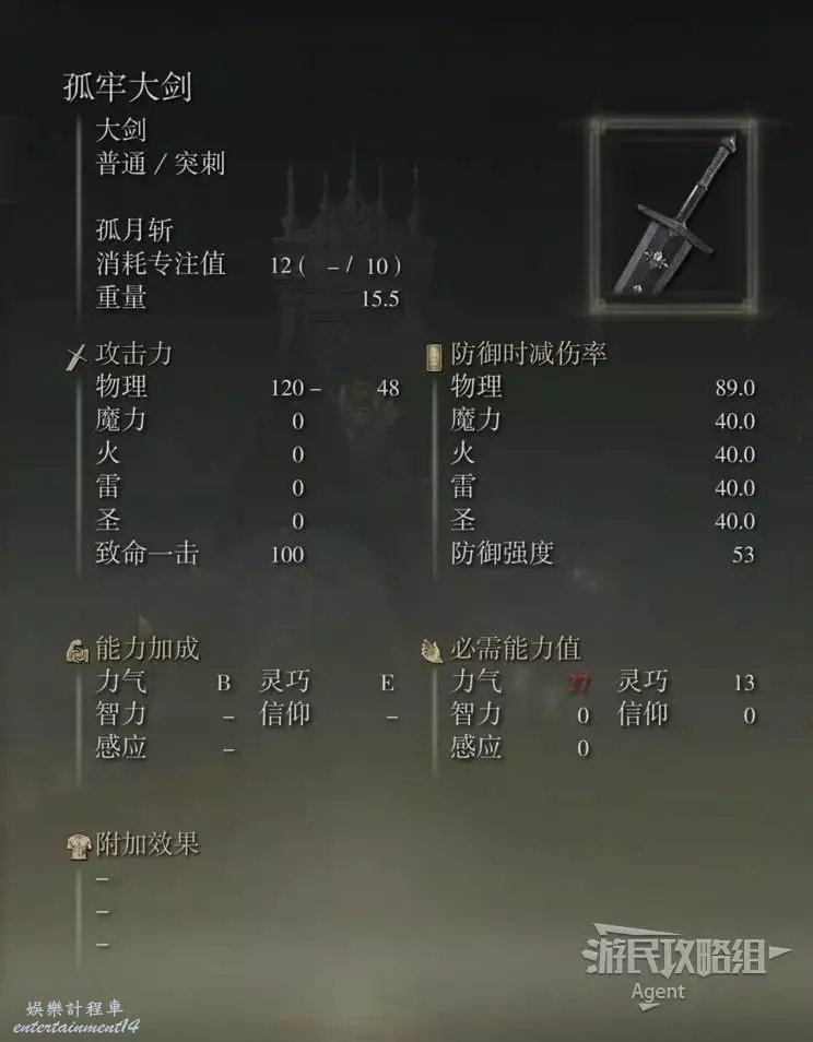 到墓地平原的西方無名靈廟,擊敗孤牢騎士得到【武器】孤牢大劍、【防具】孤牢套裝。