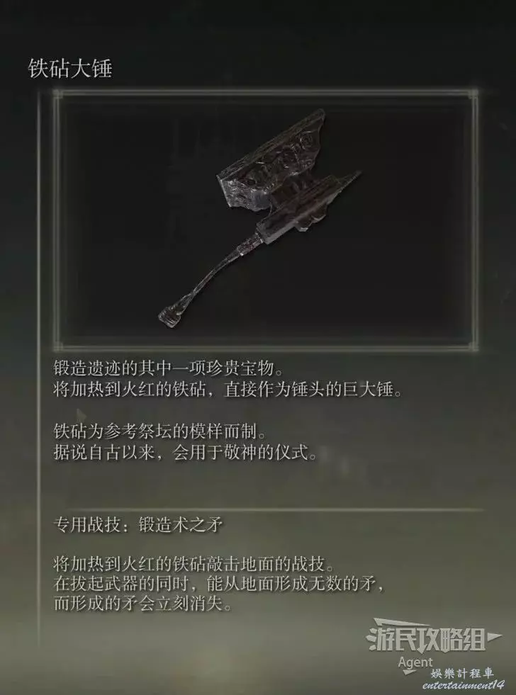 沿著大鐵棍往上走到頭,右拐走上樓梯調查祭壇,得到【武器】鐵砧大錘、【古龍岩鍛造石】。