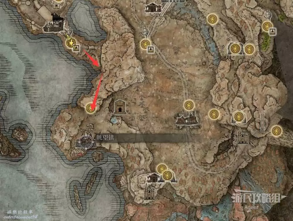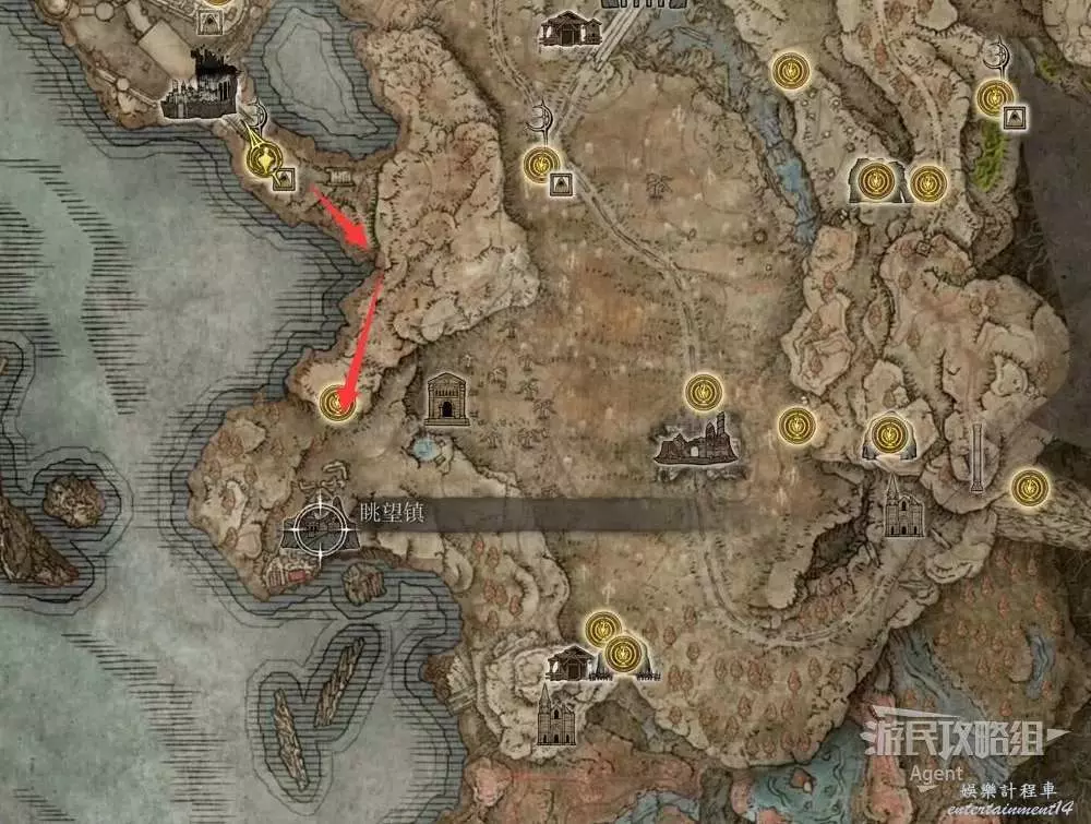 “塔之鎮”貝瑞特城外,沿下圖的隱蔽路線可抵達高處的眺望鎮。