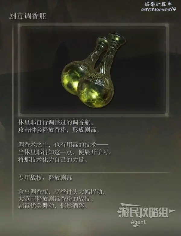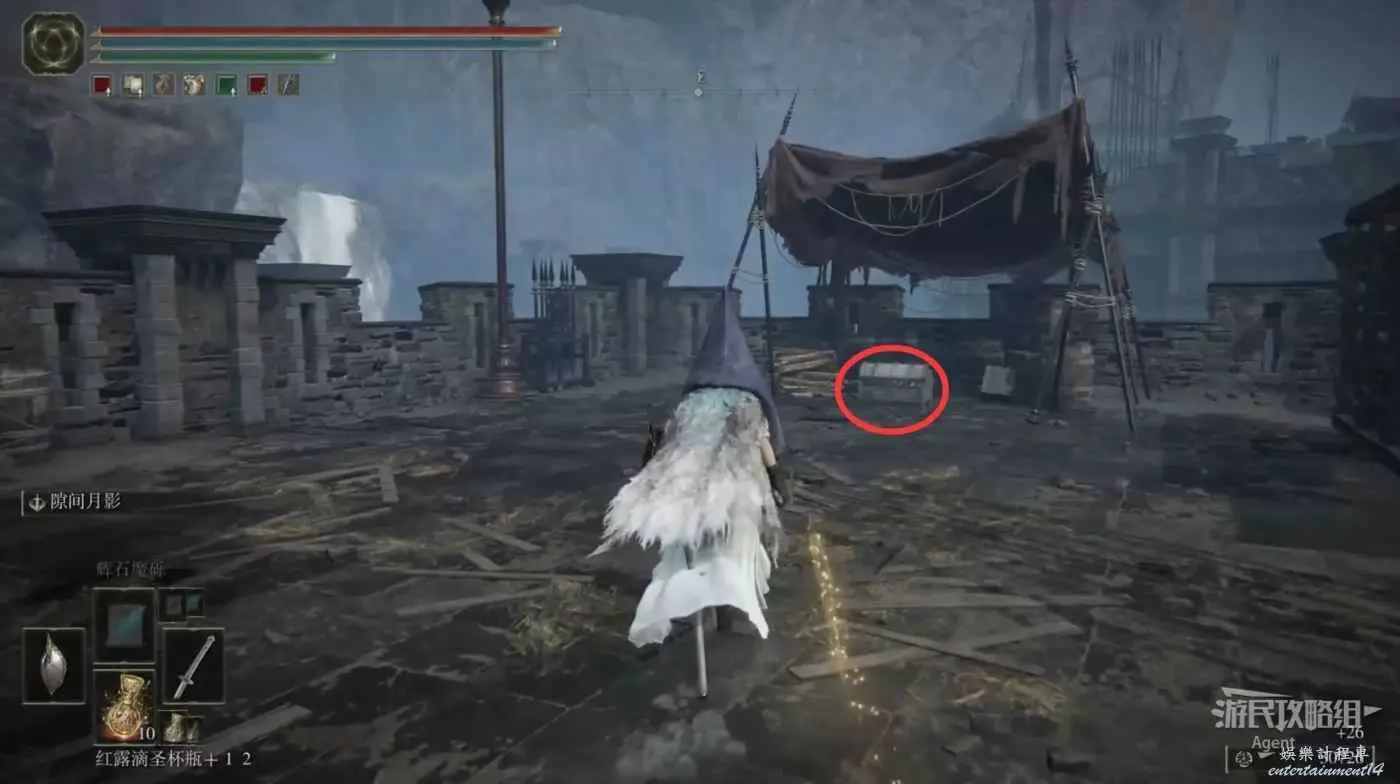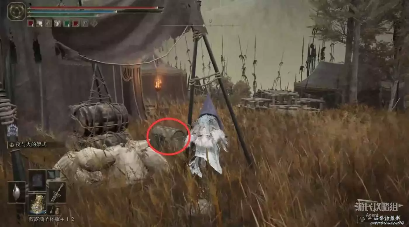 走過艾拉克大橋後,搜刮下橋頭附近的營地,在下圖位置開寶箱得到【武器】火花調香瓶。