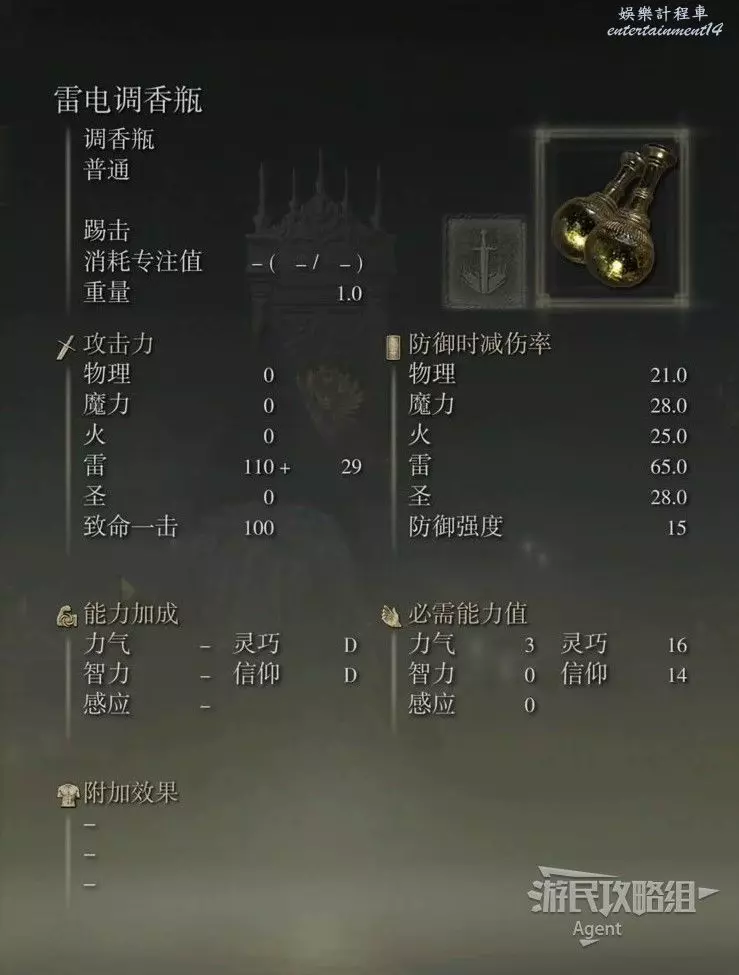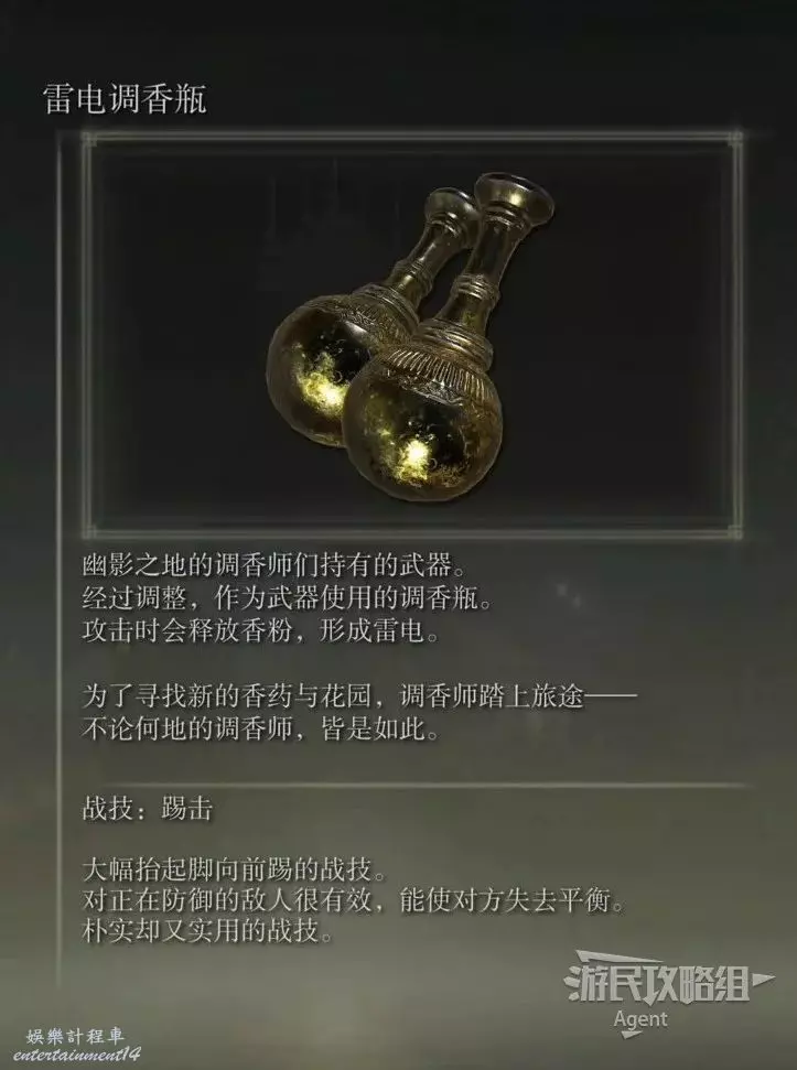 在帶電的樹林裡,小水池裡撿到【武器】雷電調香瓶。