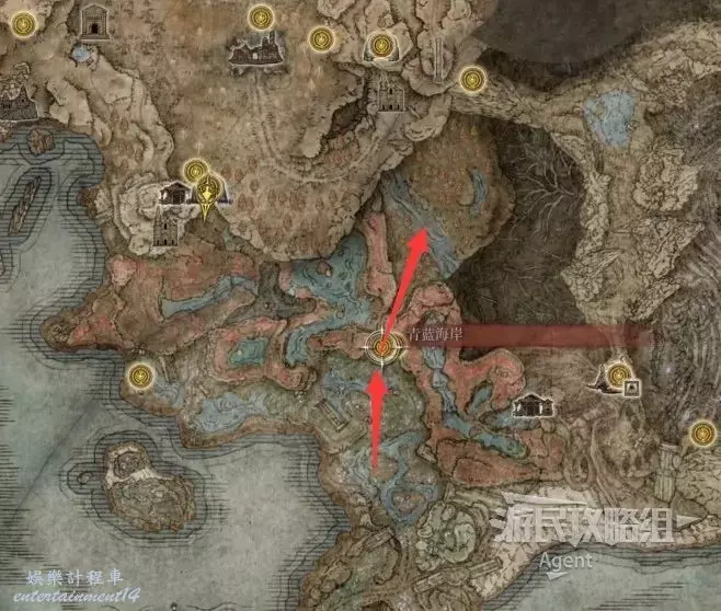 穿過龍洞來到南方海岸後,到紅色草地的下層藍色草地,從“青藍海岸”賜福點穿過洞,到北面有個火巨人。