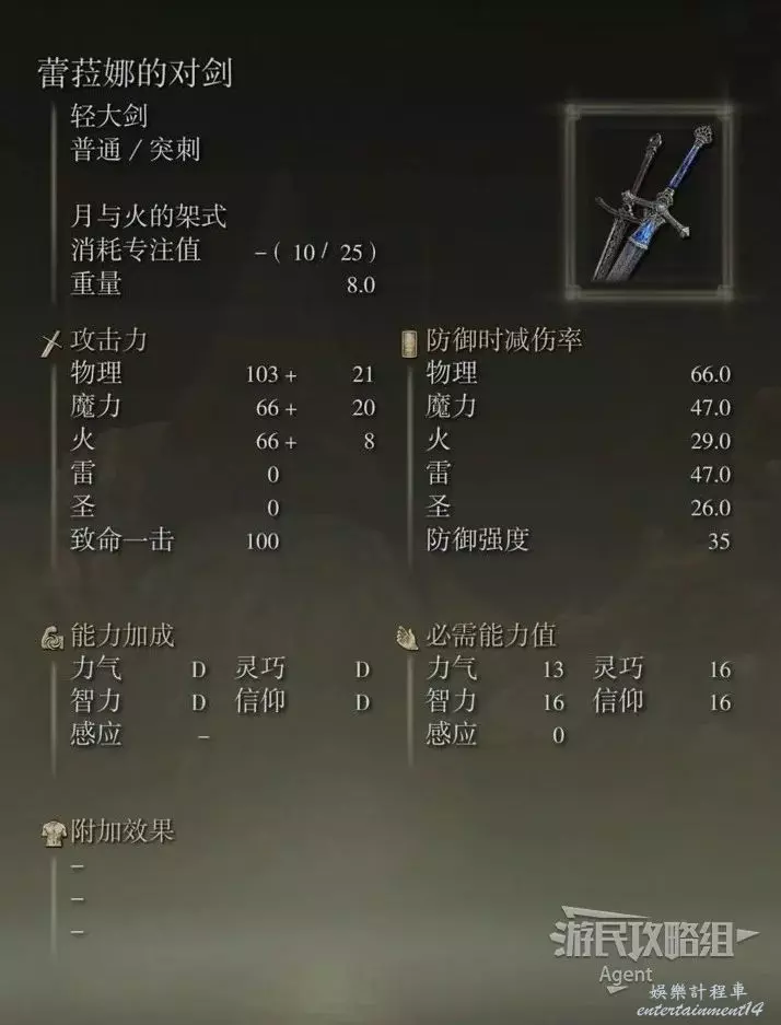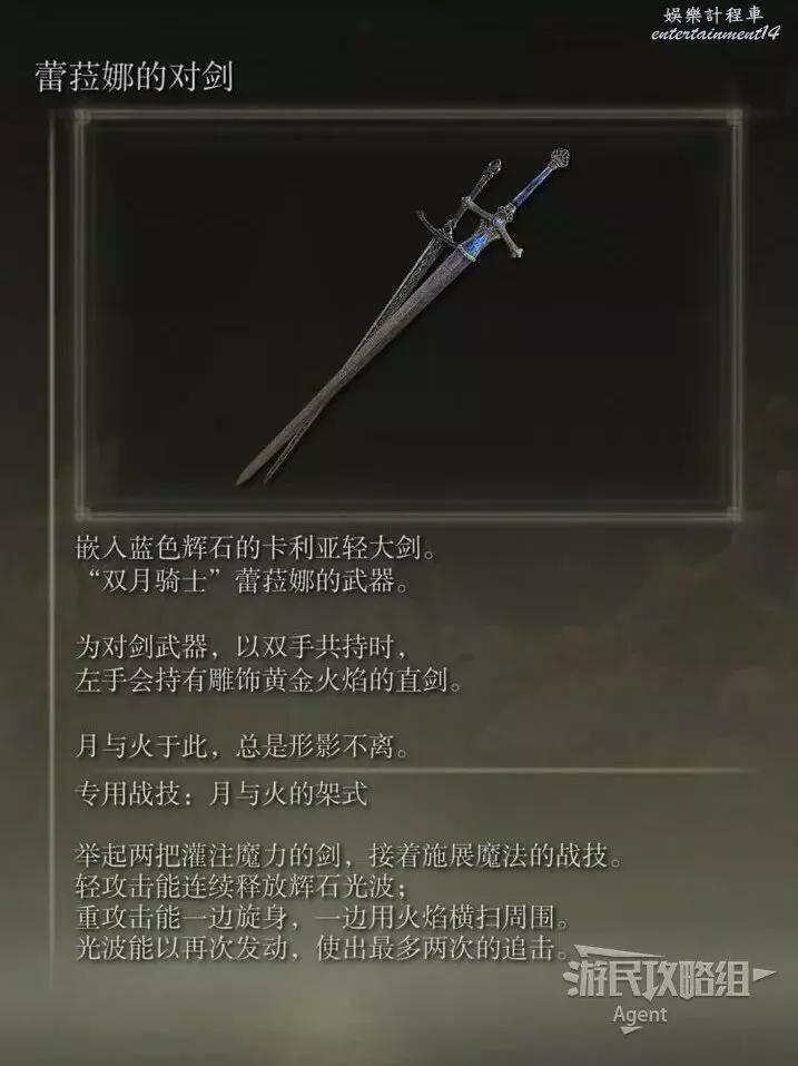 到大賜福找“解指”恩雅,用雙月騎士的追憶可兌換【武器】蕾菈娜的對劍或【魔法】蕾菈娜的雙月。