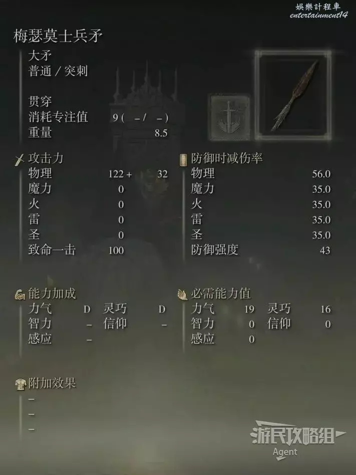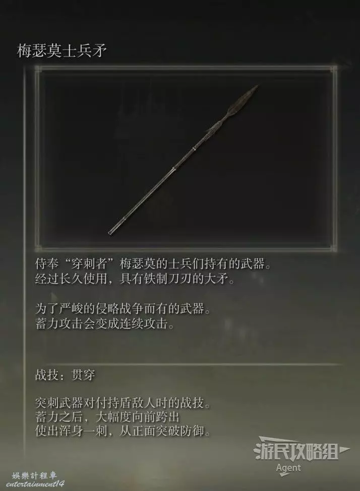 打梅瑟莫士兵幾率掉落【武器】梅瑟莫士兵矛。我是在恩希斯城的城牆上打梅瑟莫士兵掉落的。