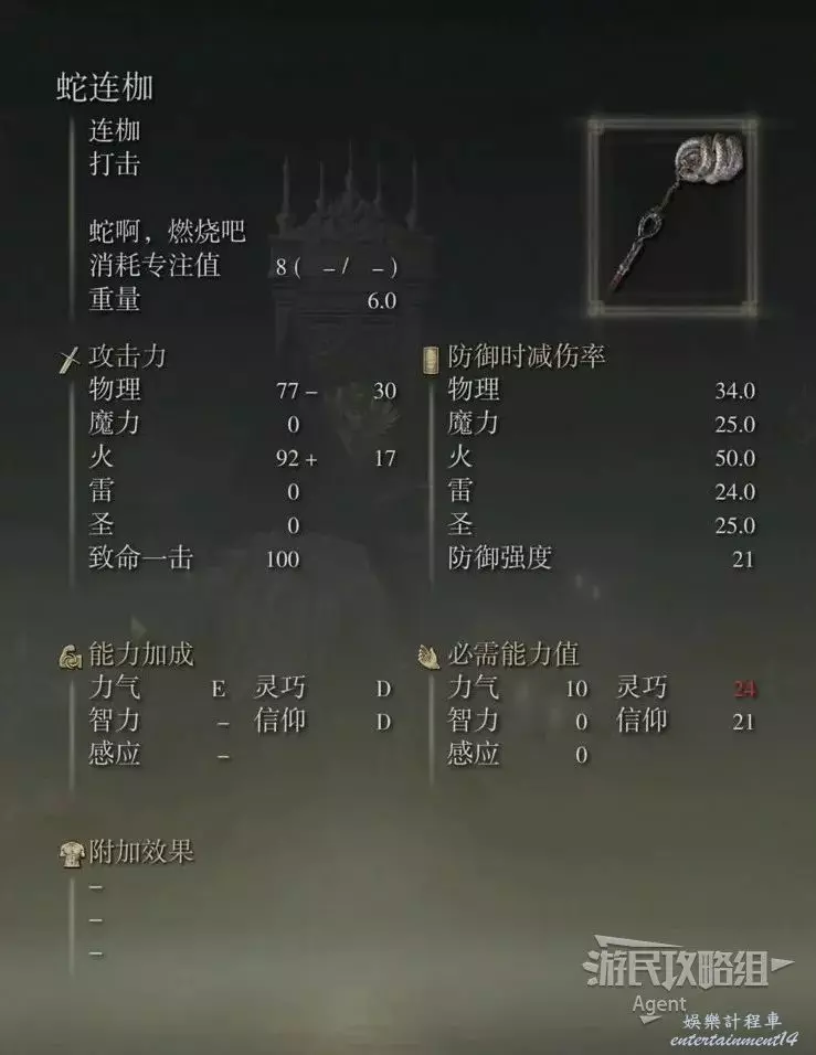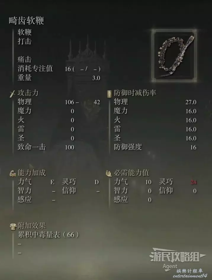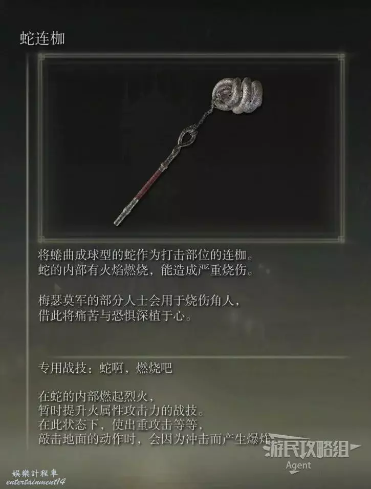 進入霧谷要塞後,沿城牆往前走,找到梯子爬下去到底層,經過許多敵人和炮塔,開寶箱得到【武器】蛇連枷。