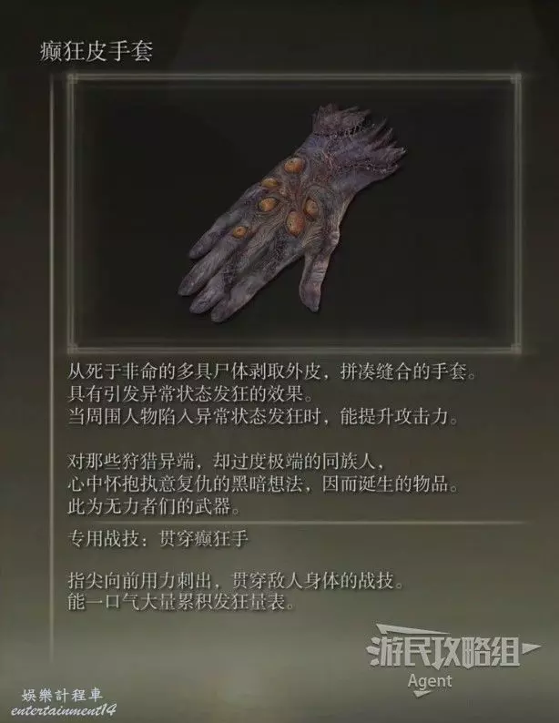 林中獸徑到廢棄教堂的路上,擊敗癲狂之手得到【武器】癲狂皮手套。