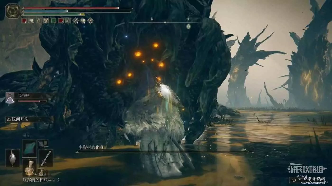 最後利用“隱者河下游”賜福點旁懸崖邊的多個石碑跳下去,到下圖大圈位置的水池打兩隻河馬,得到兩個【幽影樹碎片】。
