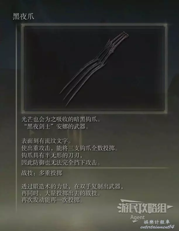 做大祭司尤彌爾的任務時,調查大祭司的座位發現密道,爬下梯子來到密亞指頭遺跡,會被“黑夜劍士”安娜入侵,擊敗得到【武器】黑夜爪。詳細攻略見全NPC任務攻略