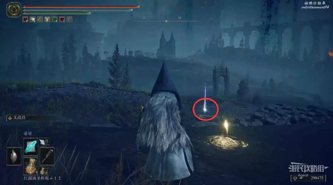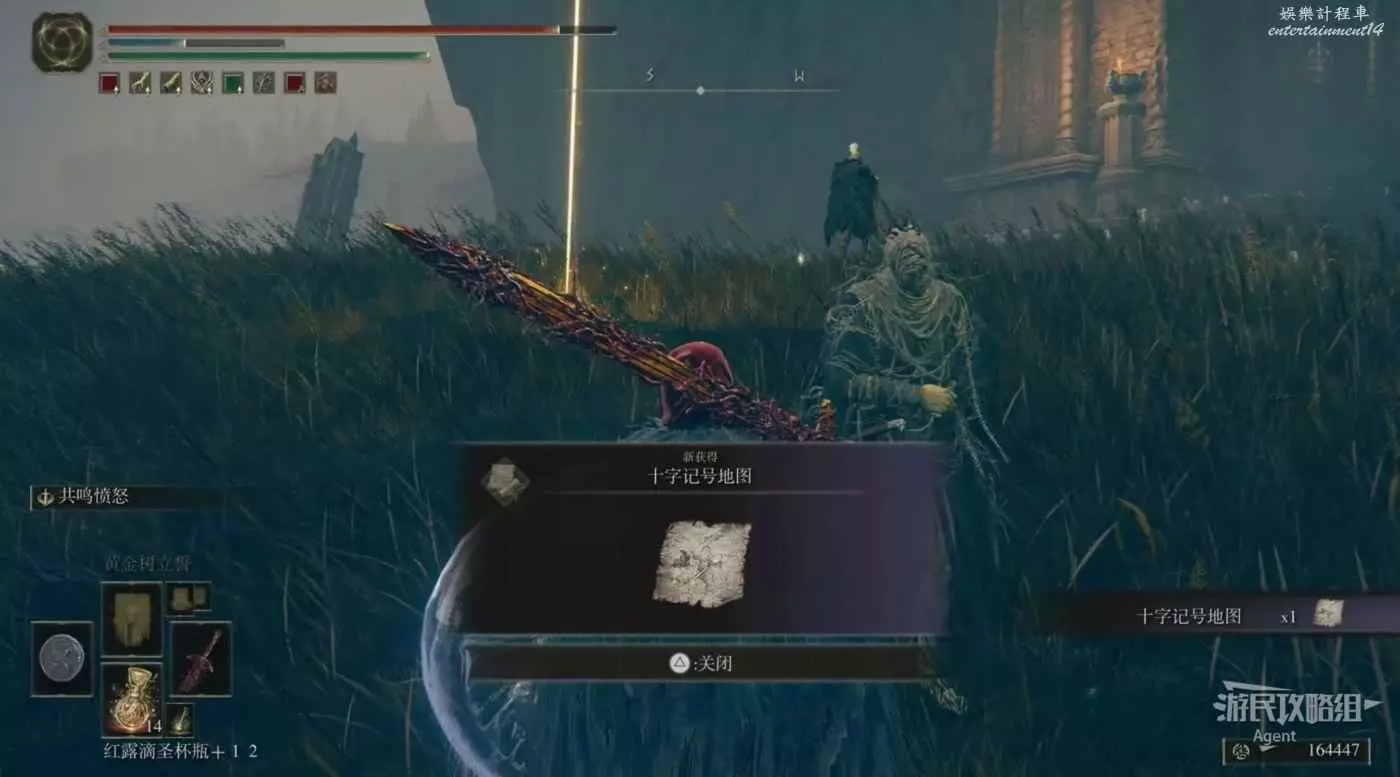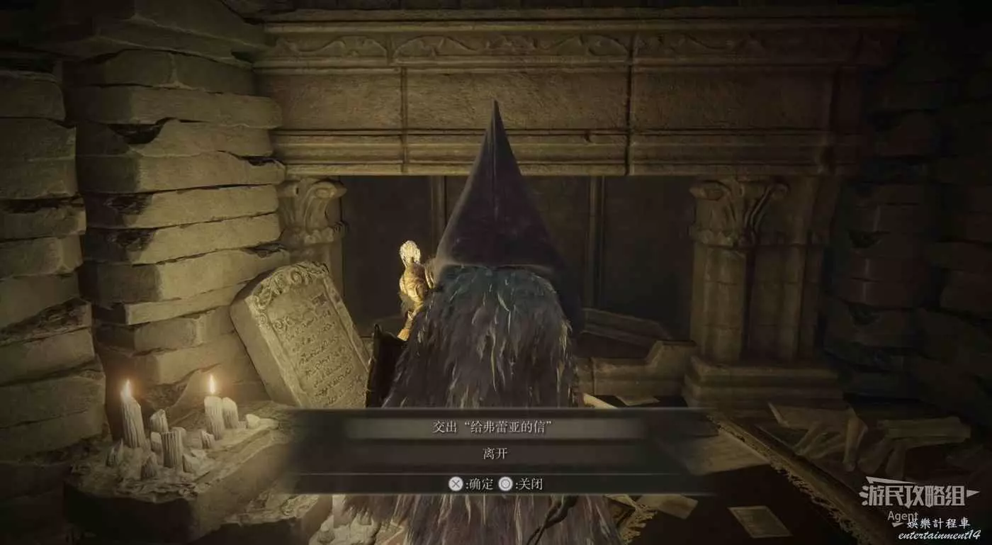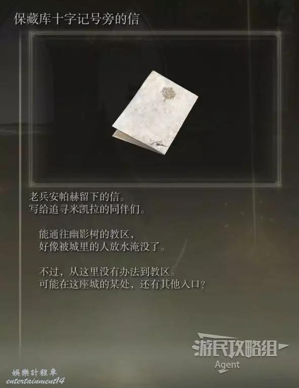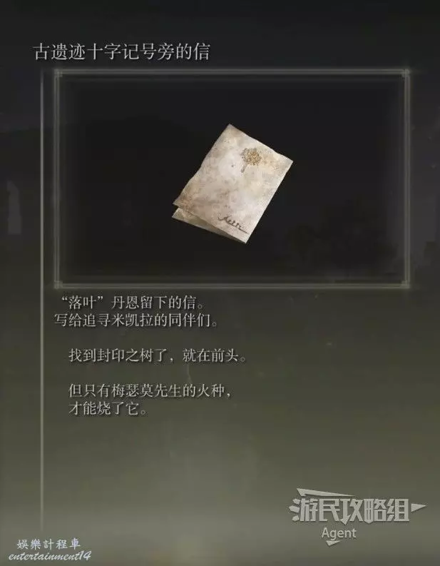 穿過迷宮出來後,來到“勞弗古遺跡(東方)”賜福點,十字記號旁撿到“古遺跡十字記號旁的信”。