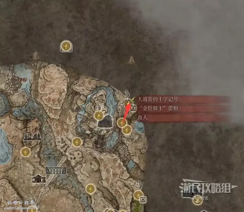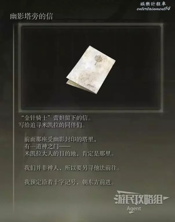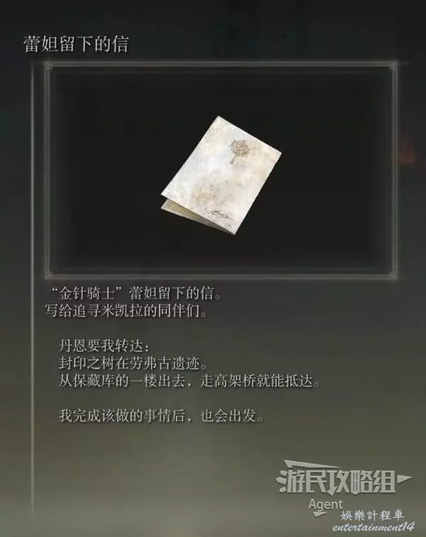 回到大道旁的十字記號,“金針騎士”蕾妲之前所在的地方,撿到“蕾妲留下的信”,她要你去勞弗古遺跡。