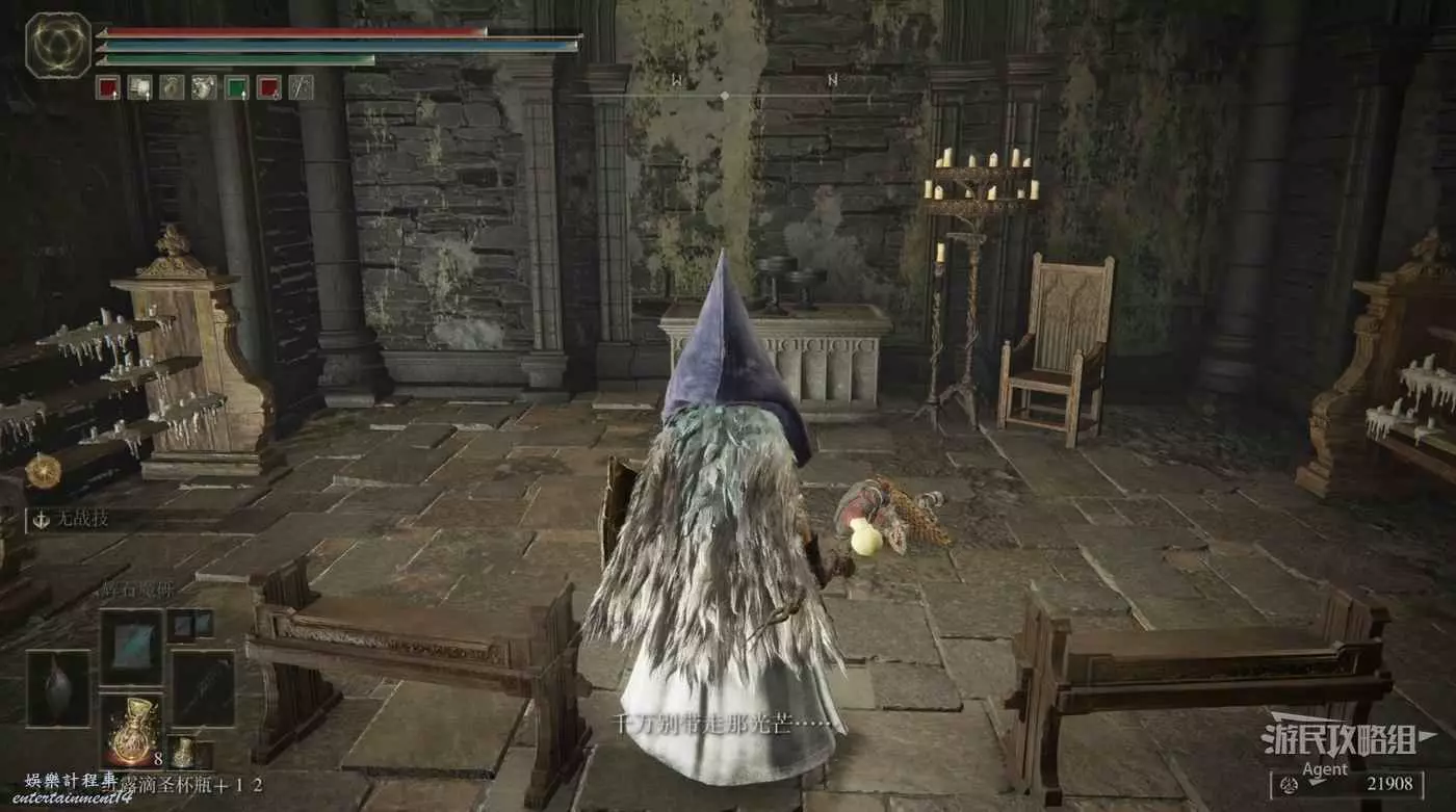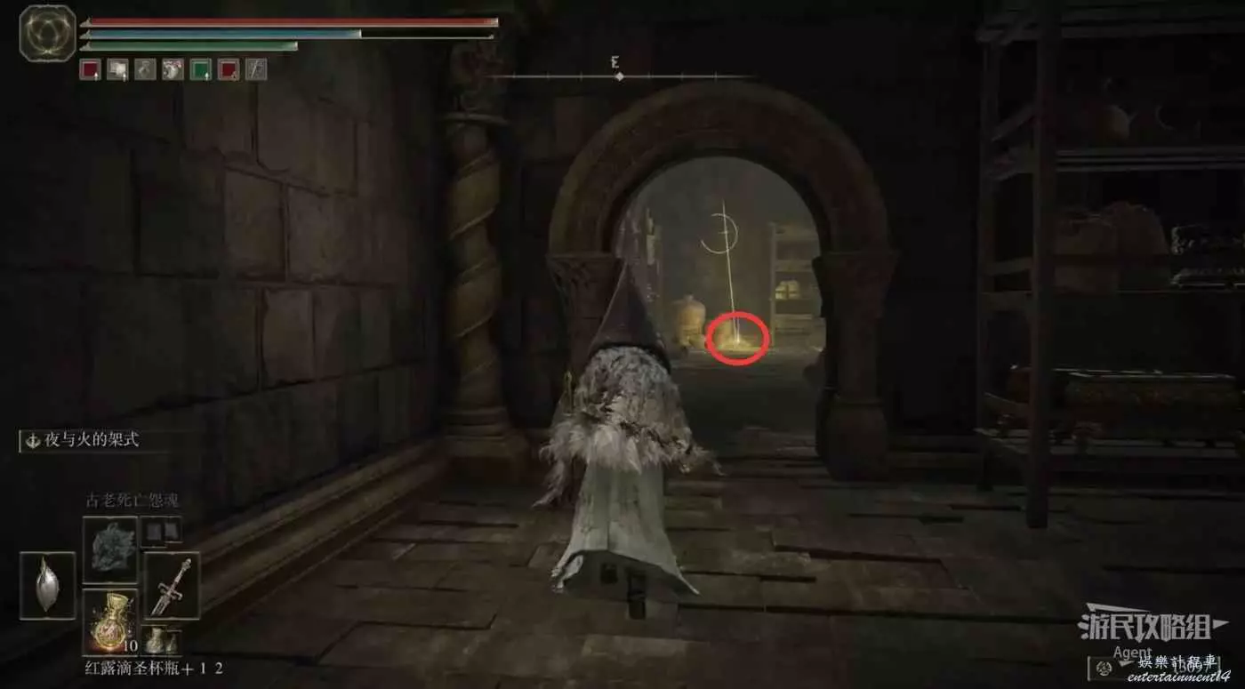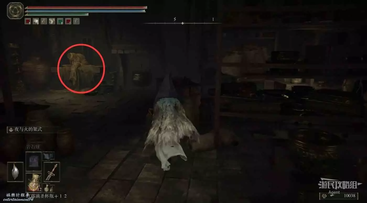 在“塔之鎮”貝瑞特拿到倉庫鑰匙後,回到“民宅小祭壇”賜福點,用鑰匙開倉庫,和角人老嫗對話。