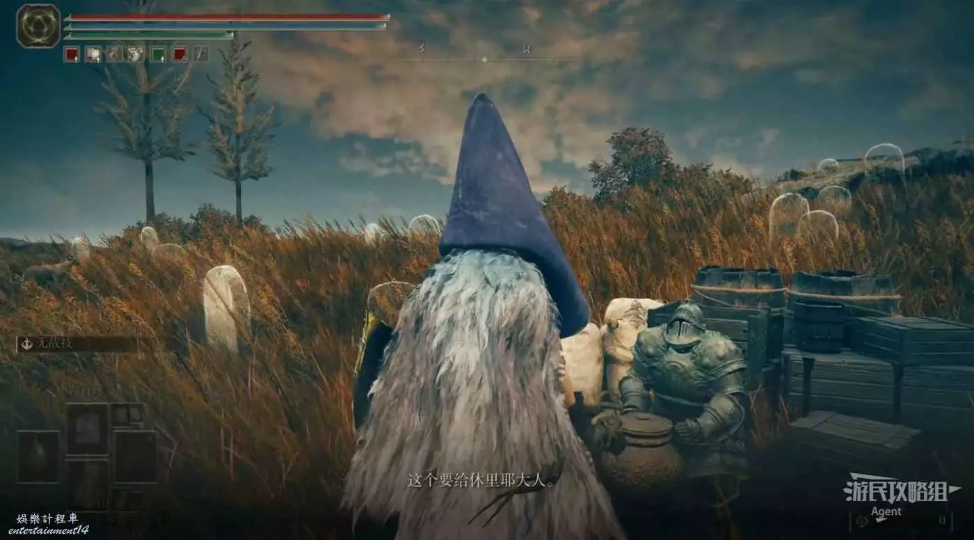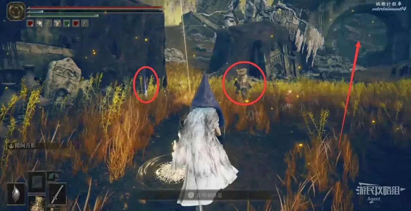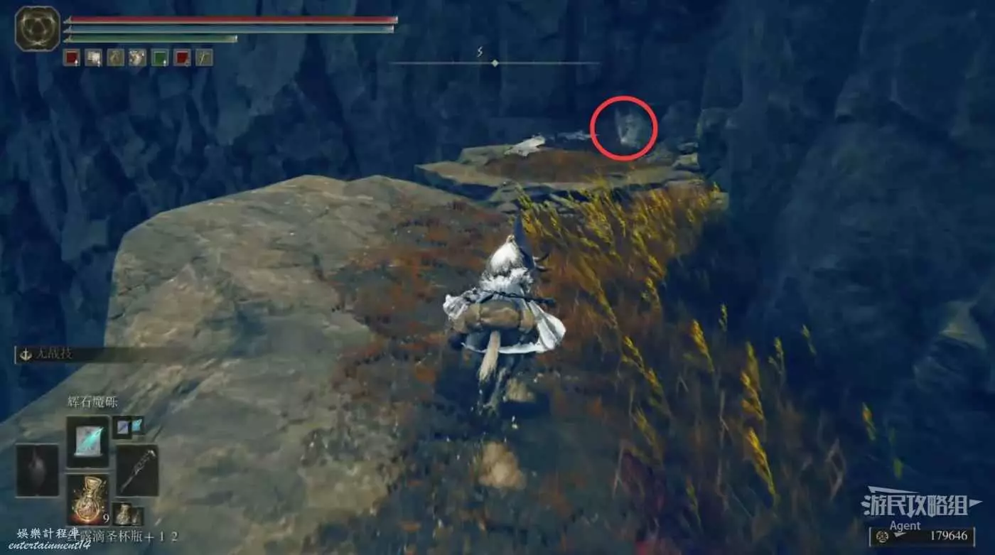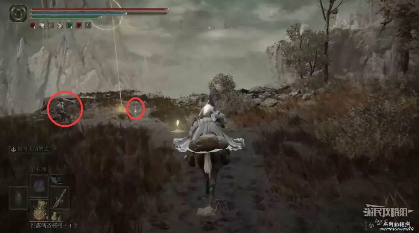 前方地上看到“金針騎士”蕾妲、角人的召喚符,如果幫角人可獲得【戰灰】迅斬、蕾妲的盧恩,如果幫蕾妲可獲得角人的套裝。也可以兩不相幫。(建議幫角人,他會幫你打梅瑟莫,角人的套裝後面還有別的途徑獲得)