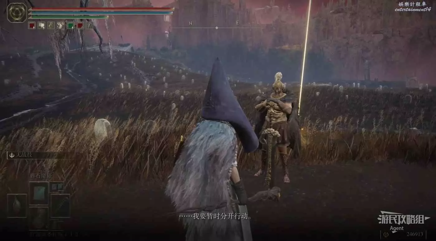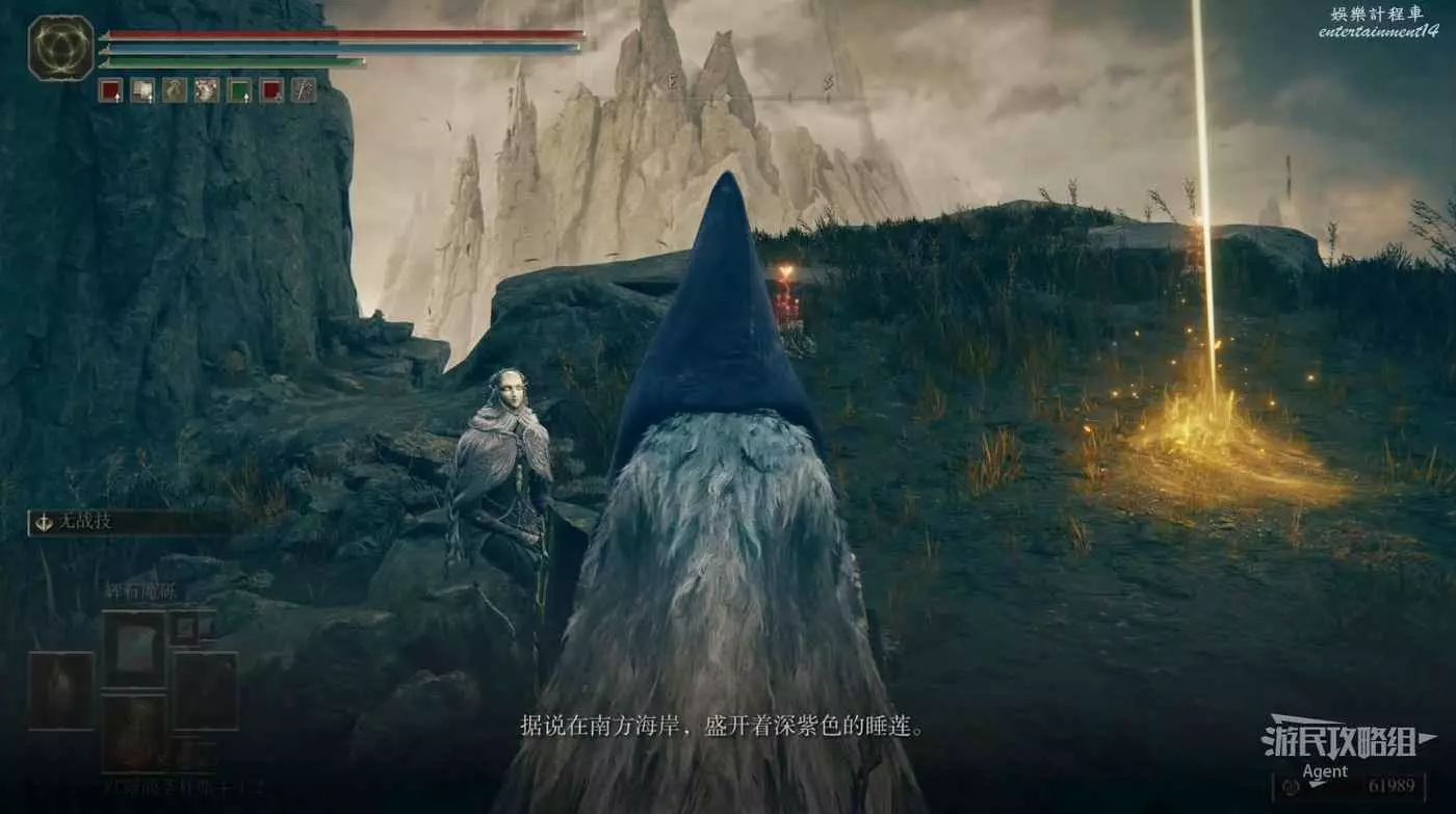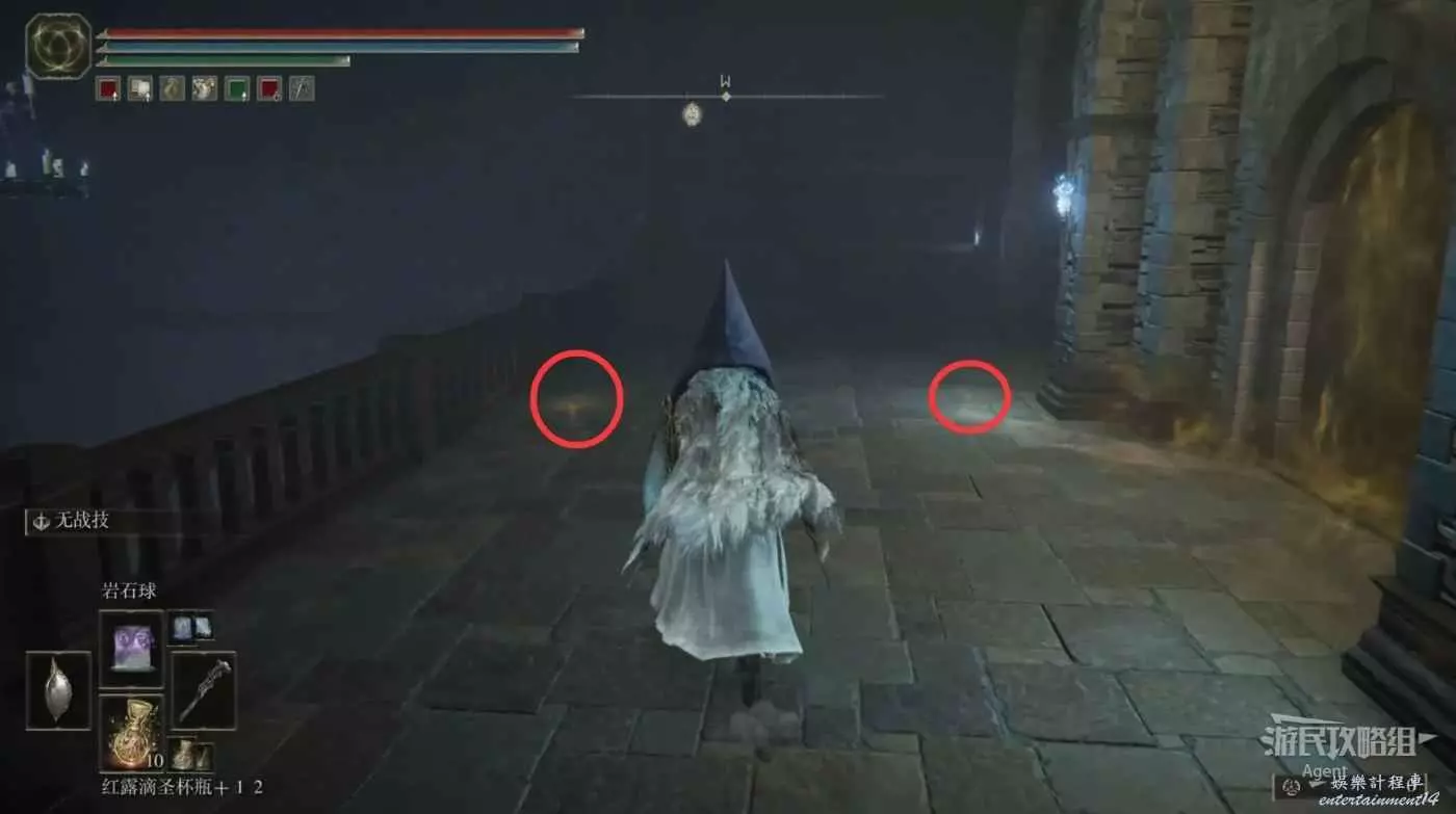 前方地上看到“金針騎士”蕾妲、角人的召喚符,如果幫角人可獲得【戰灰】迅斬、蕾妲的盧恩,如果幫蕾妲可獲得角人的套裝。也可以兩不相幫。(建議幫角人,他會幫你打梅瑟莫,角人的套裝後面還有別的途徑獲得)