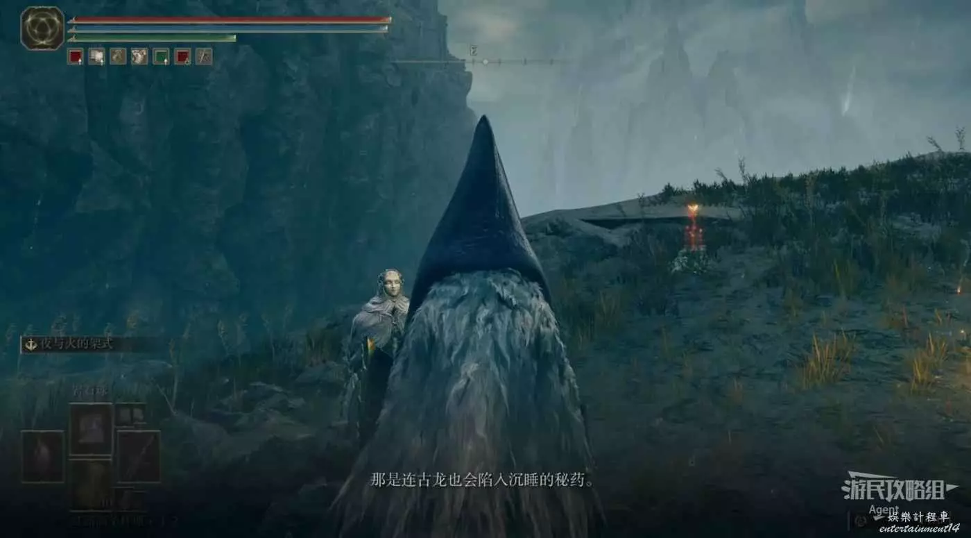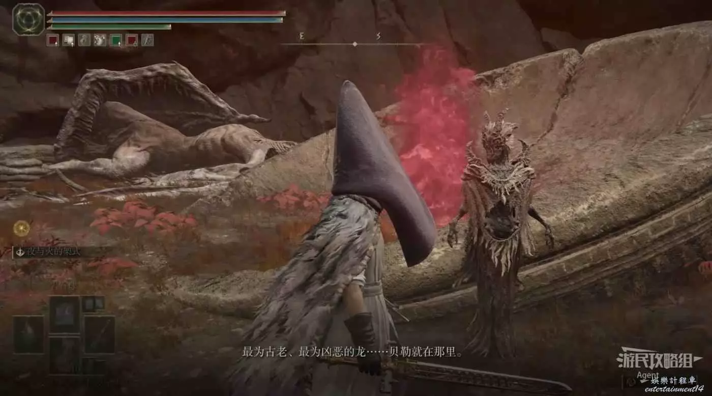 繼續往南走,“通柱坡中段”賜福點旁邊岔路上遇到正在哀嚎的“龍戰士”埃貢,他口中喊的貝勒是一頭他想去屠的狂龍。
