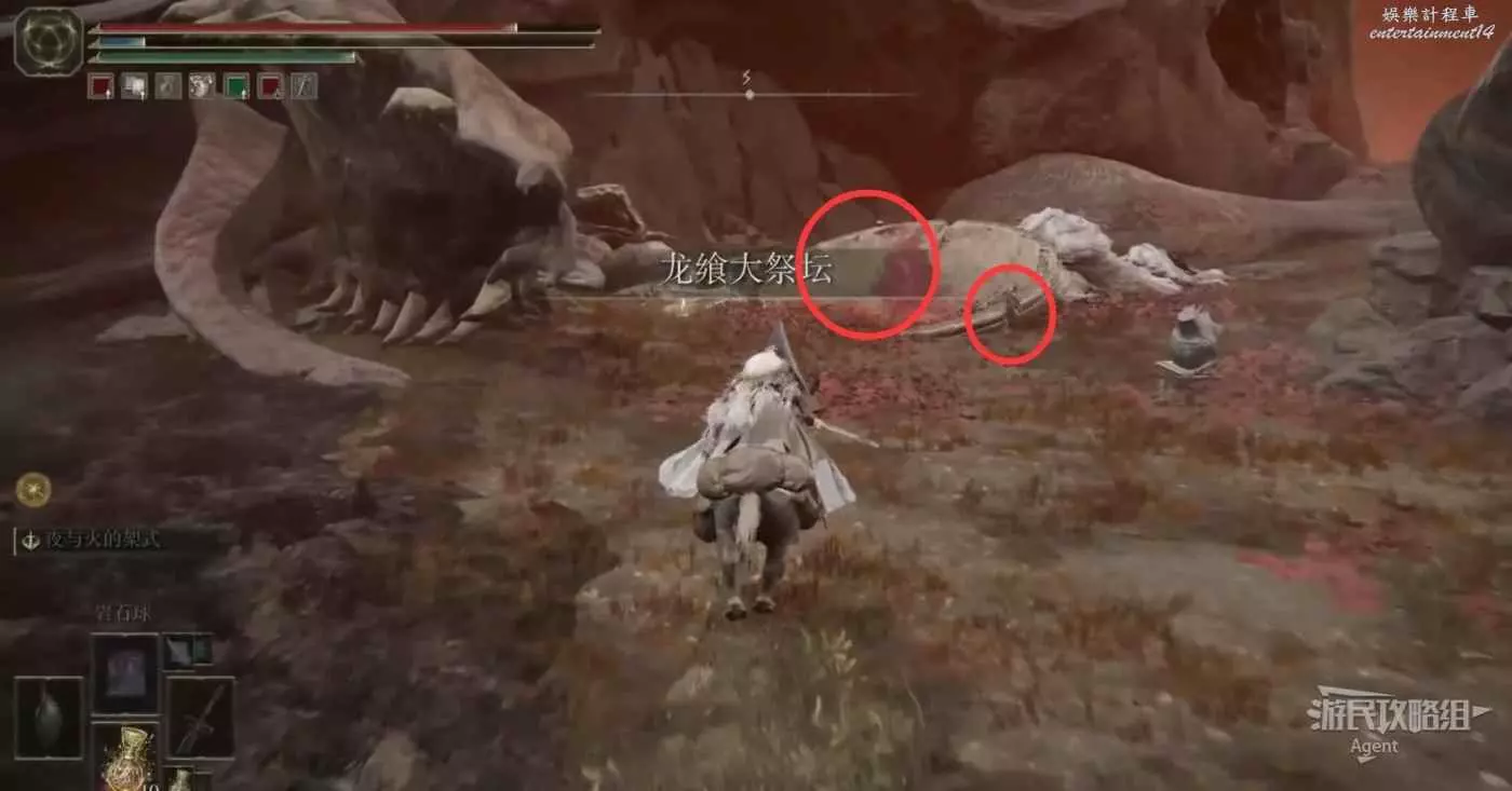 擊敗尖刺山的飛龍後,沿路往南走,來到龍饗大祭壇看到個巨龍骸骨,在祭壇處可以用龍心臟、貝勒的心臟兌換禱告。