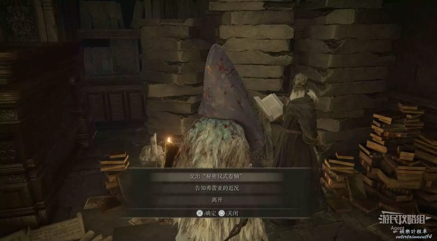 在七樓和弗蕾亞對話後,回到一樓找安帕赫,交出秘密儀式卷軸並告知弗蕾亞的近況,得到“給弗蕾亞的信”。如果他不給你信,就刷新再來。