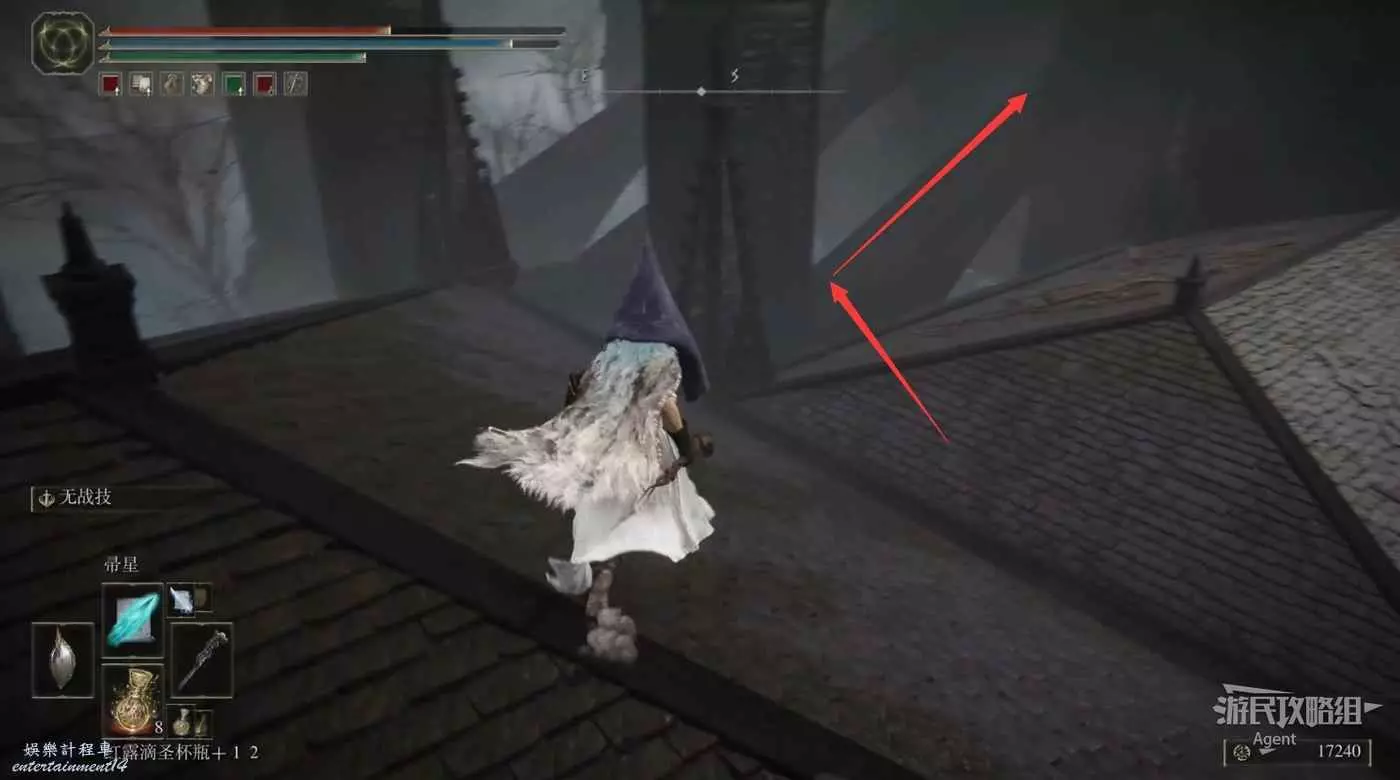 按下圖路線穿過各個房頂,抵達大教堂的房頂。