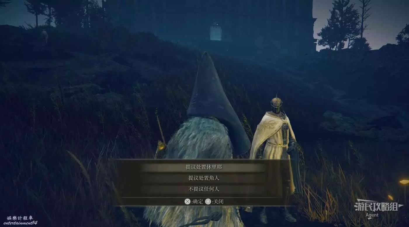 到大道旁的十字記號找角人、“金針騎士”蕾妲,蕾妲會問你“誰不配服侍米凱拉大人”。我心善選擇了“不提議任何人”,但是沒用,刷新後她還是會自己決定選擇角人(提議休裡耶應該沒有效果)。反復對話後,角人也會離開這裡。