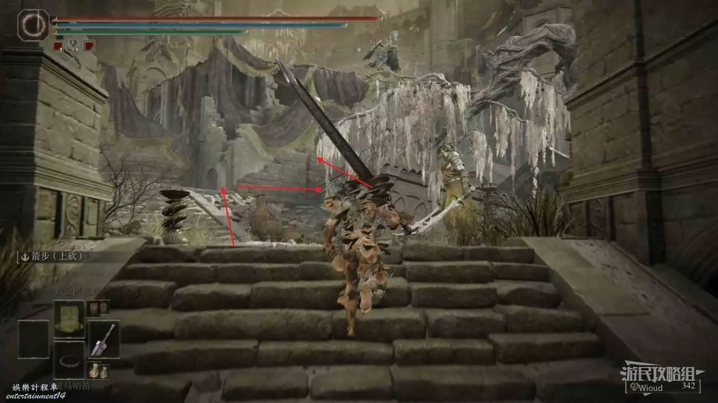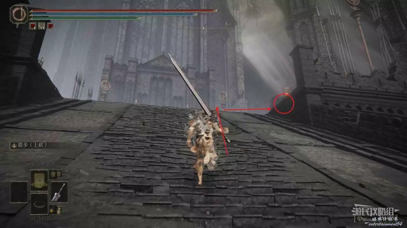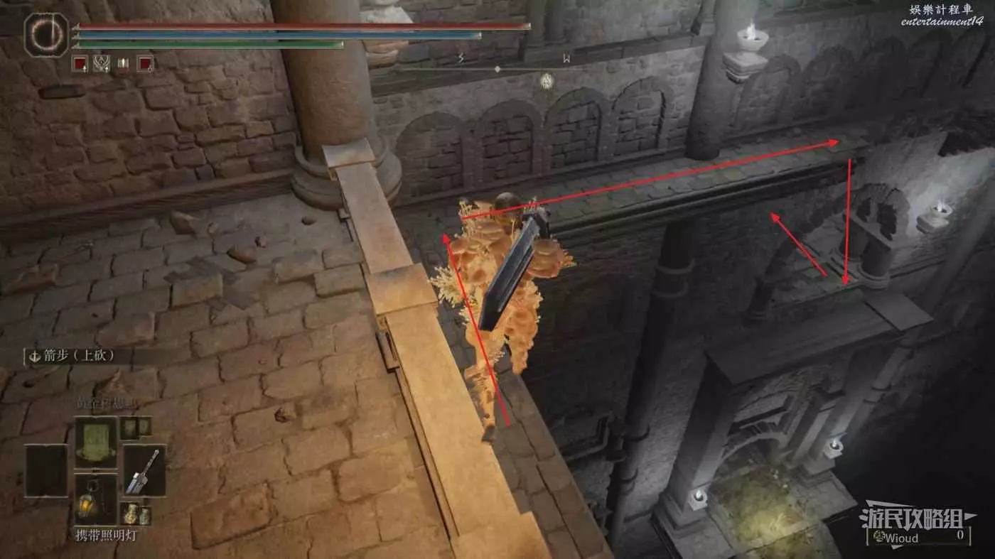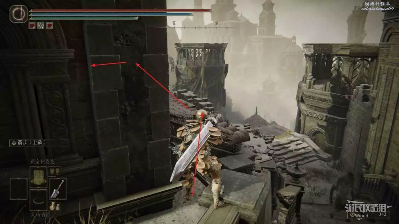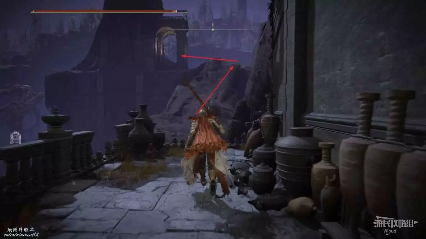 我們先連跳到第一個牆壁再跳到對面披著紅布的牆壁上,繼續往左前連跳到神殿鎮廢墟裡面。