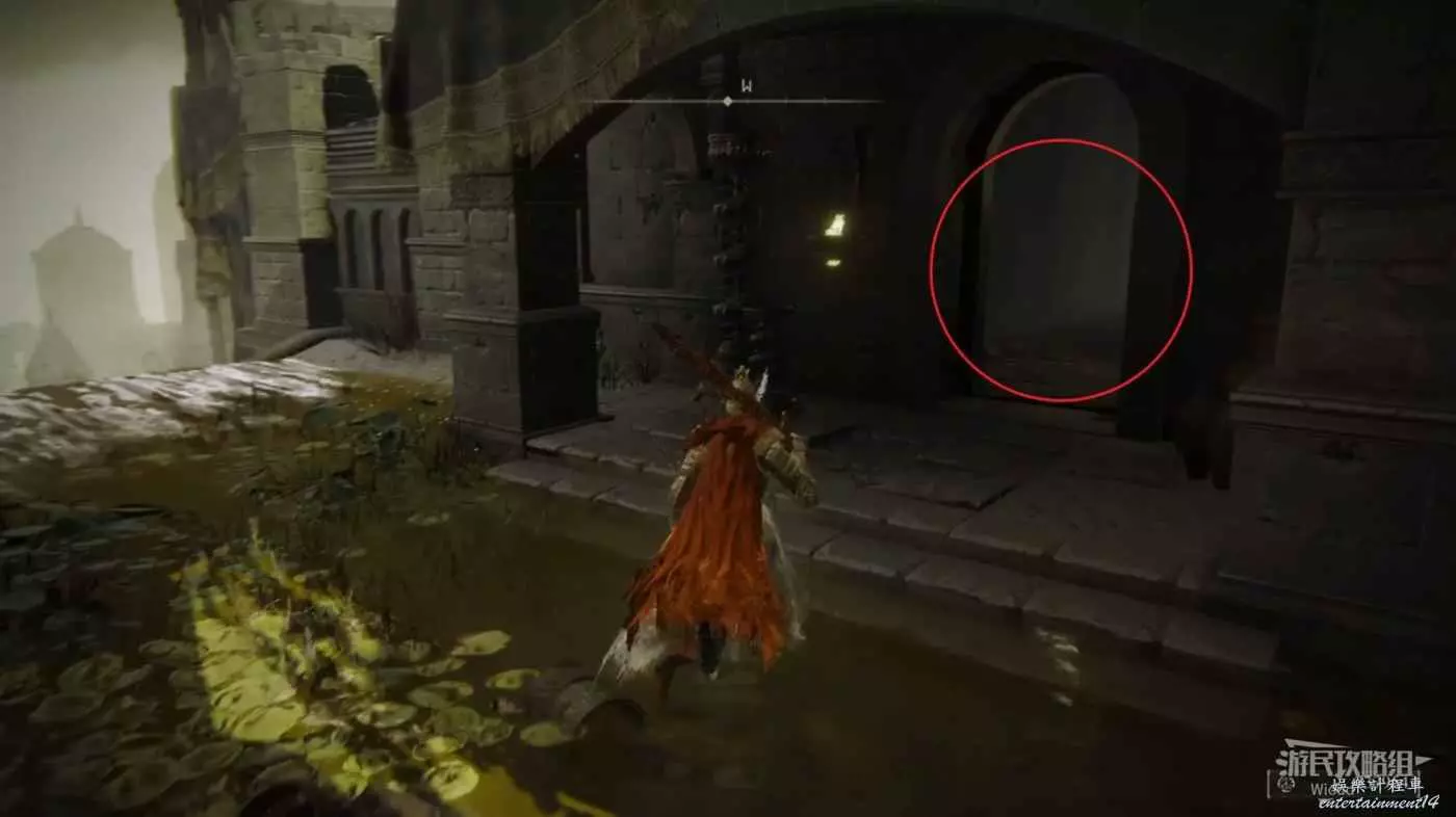 到達右側綠地平臺貼著左牆走,通過左牆的入口進入建築內。