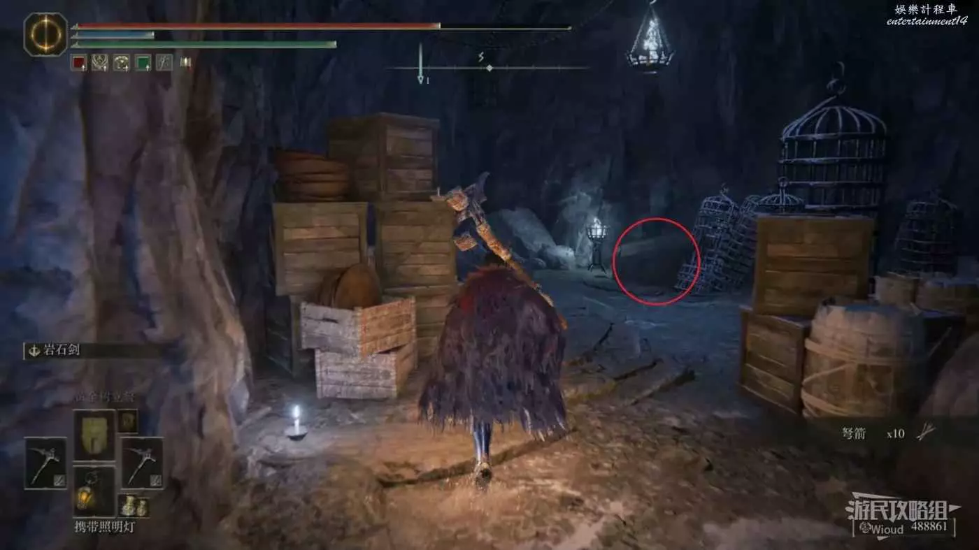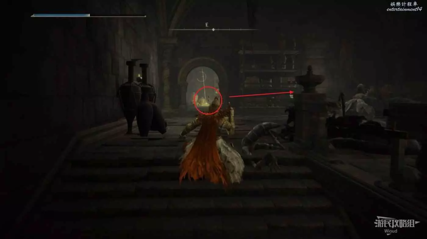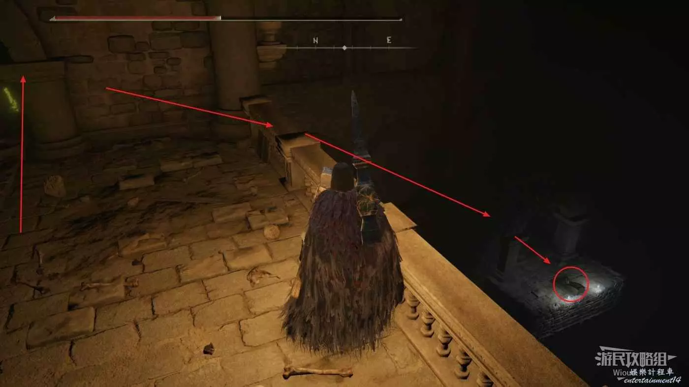 從剛才的柵欄位置進入左側的房間,從前方往下跳,接著往後方走就能到剛才機關的位置。