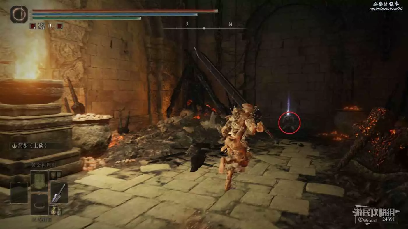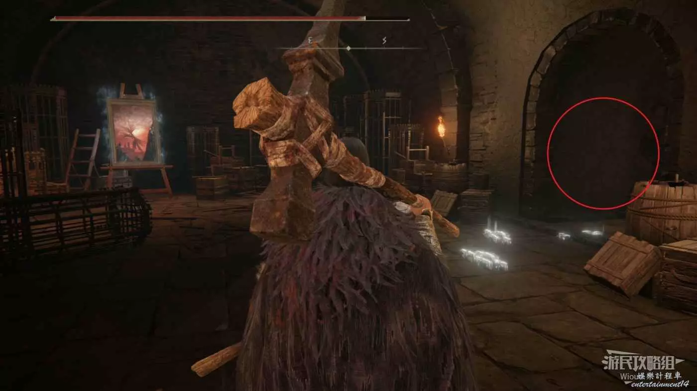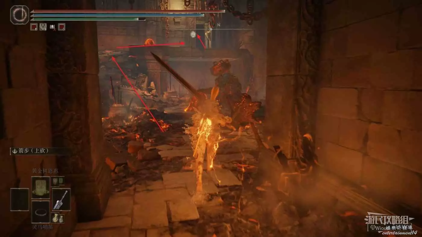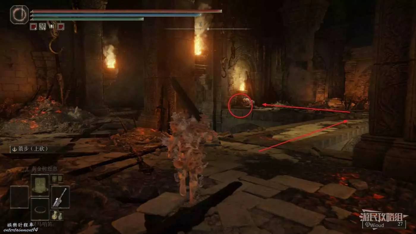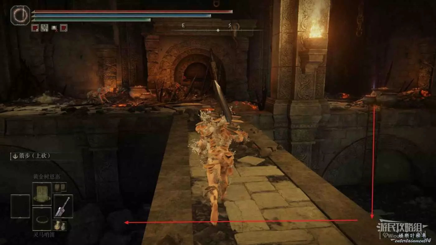 此時往右走到頭,沿著樓梯繼續往上爬,看到有一個火焰騎士的房間時不要繼續爬樓梯,往左後方走。