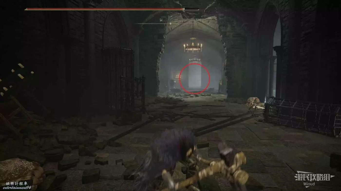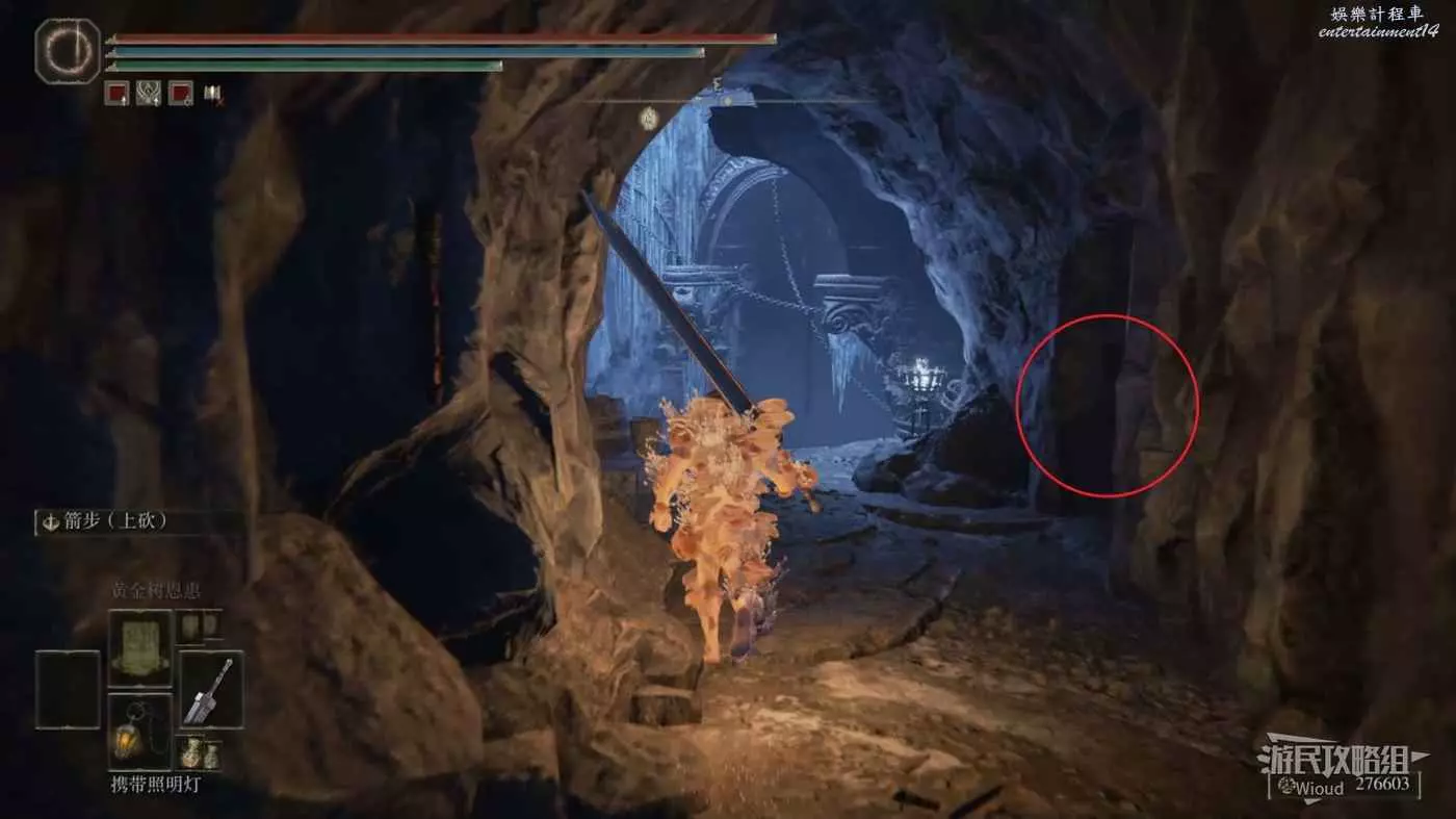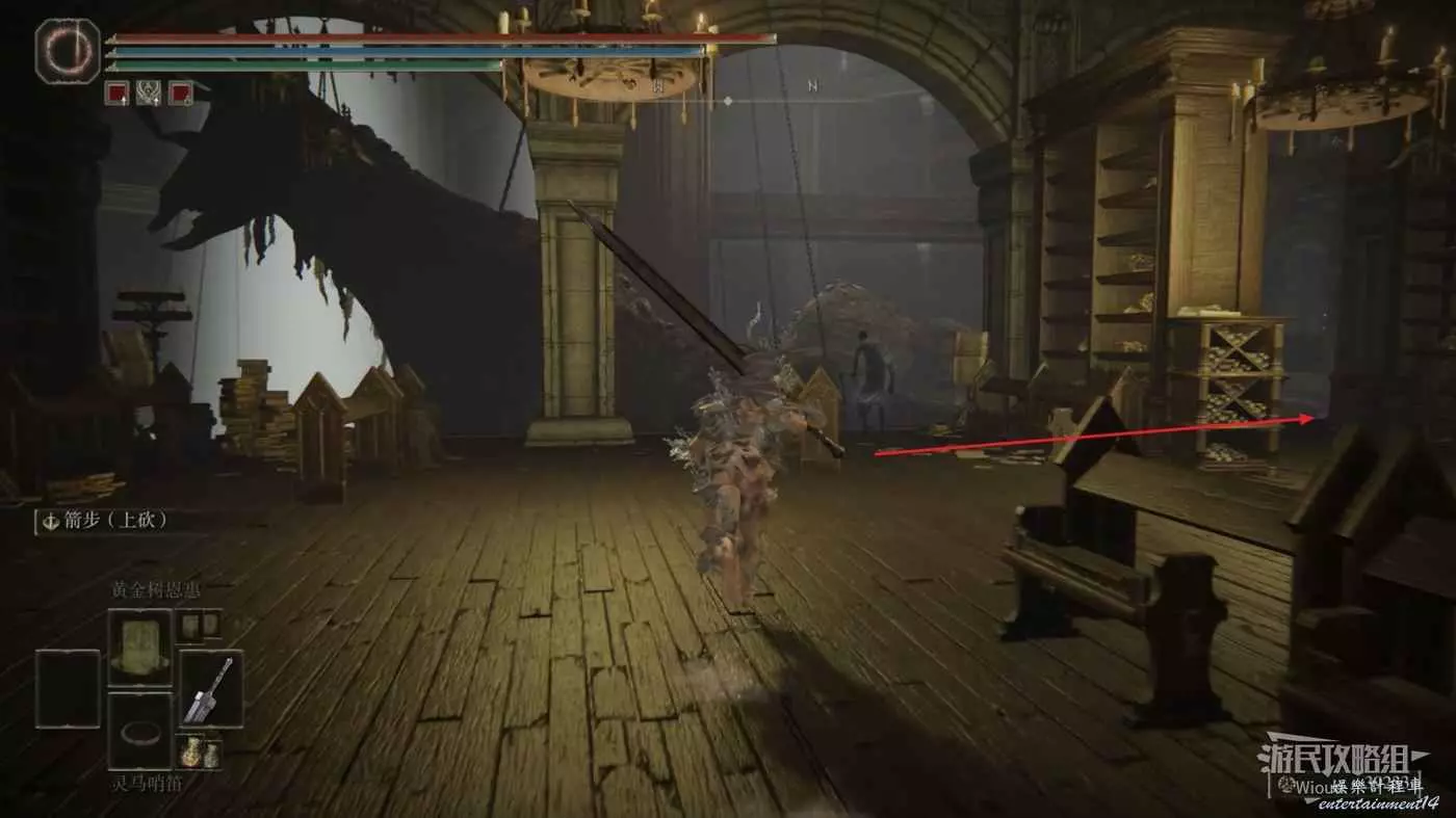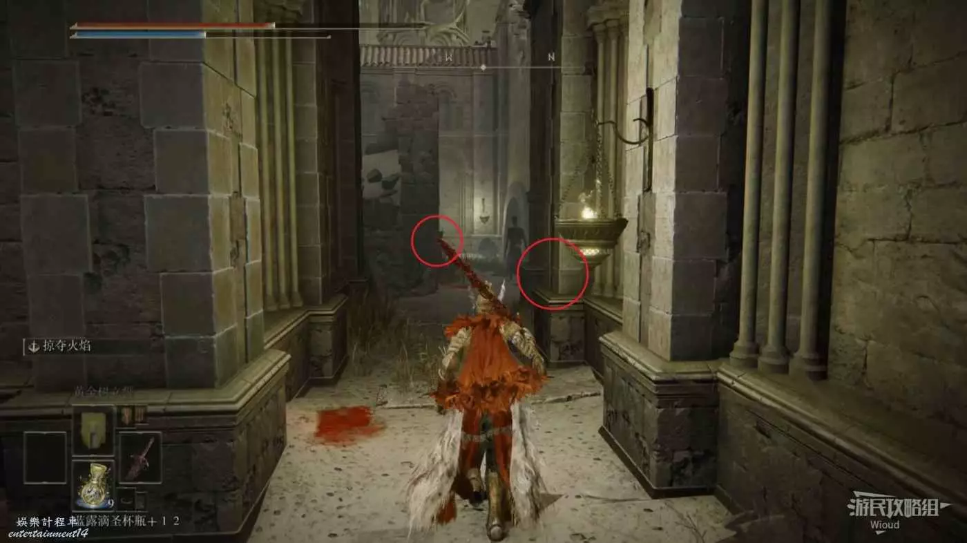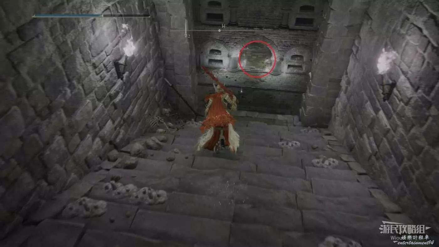 此時往右走到頭,沿著樓梯繼續往上爬,看到有一個火焰騎士的房間時不要繼續爬樓梯,往左後方走。