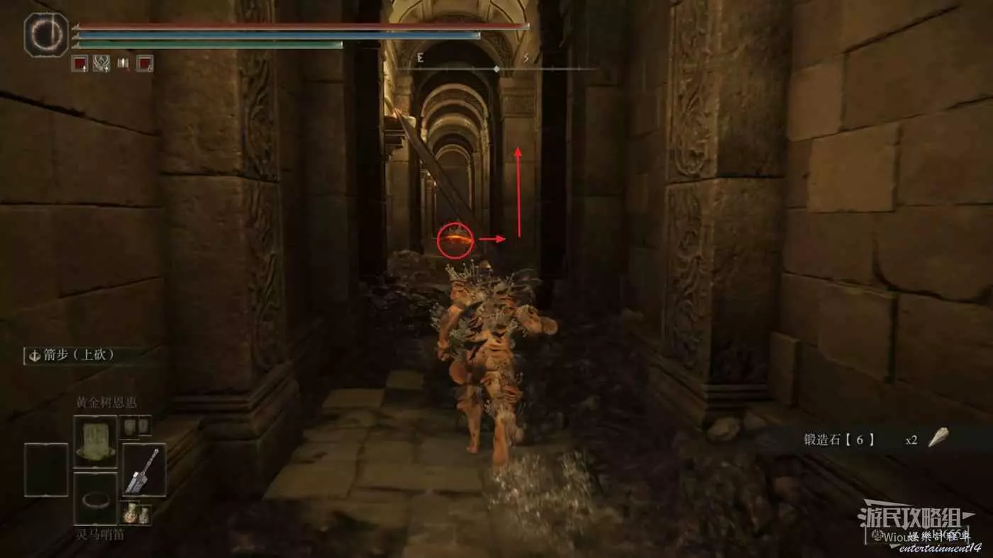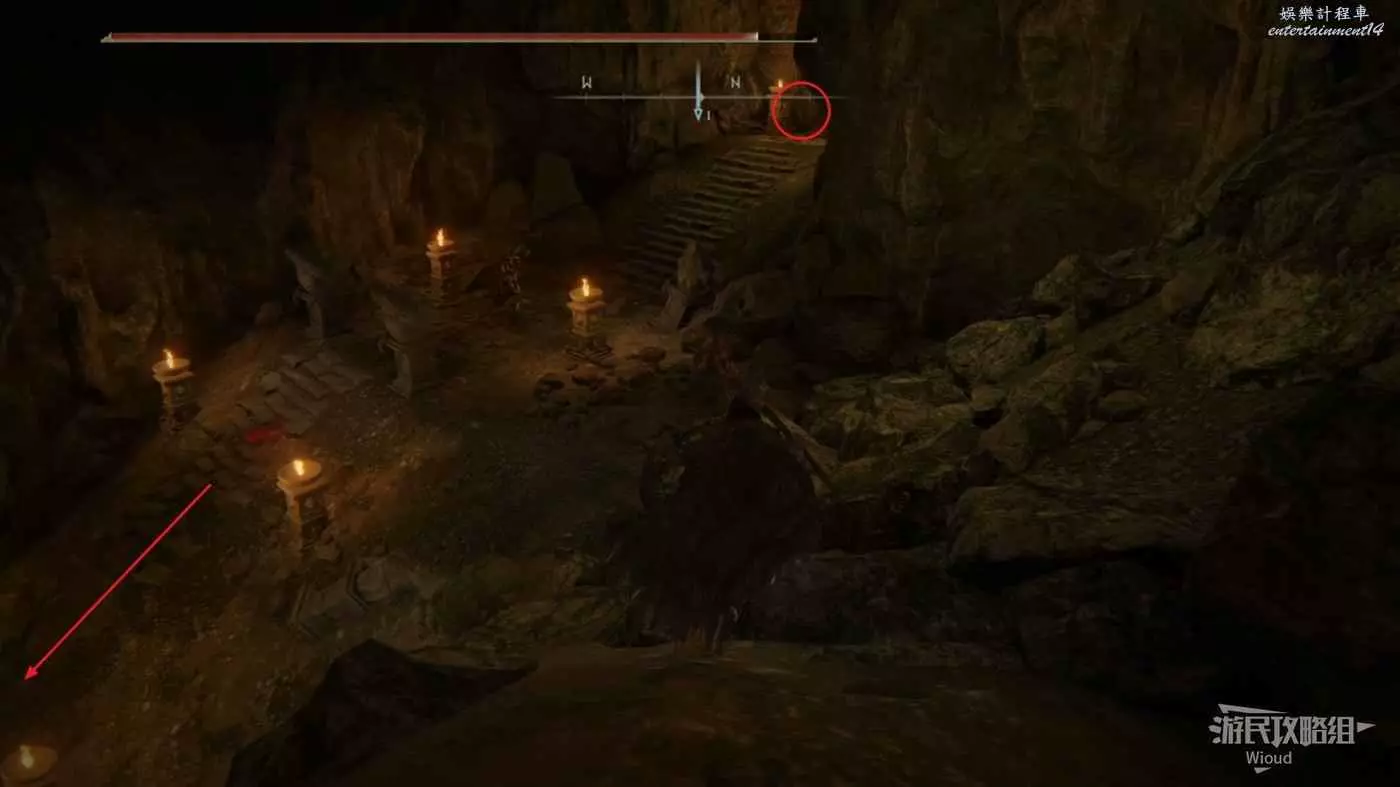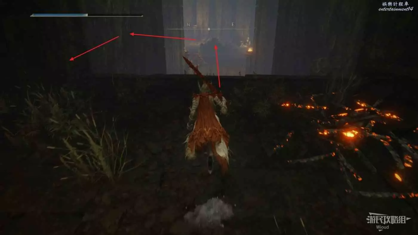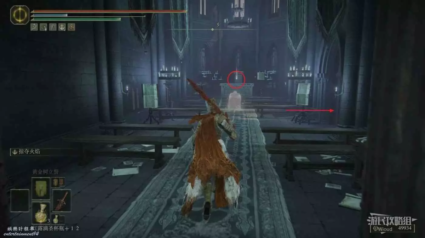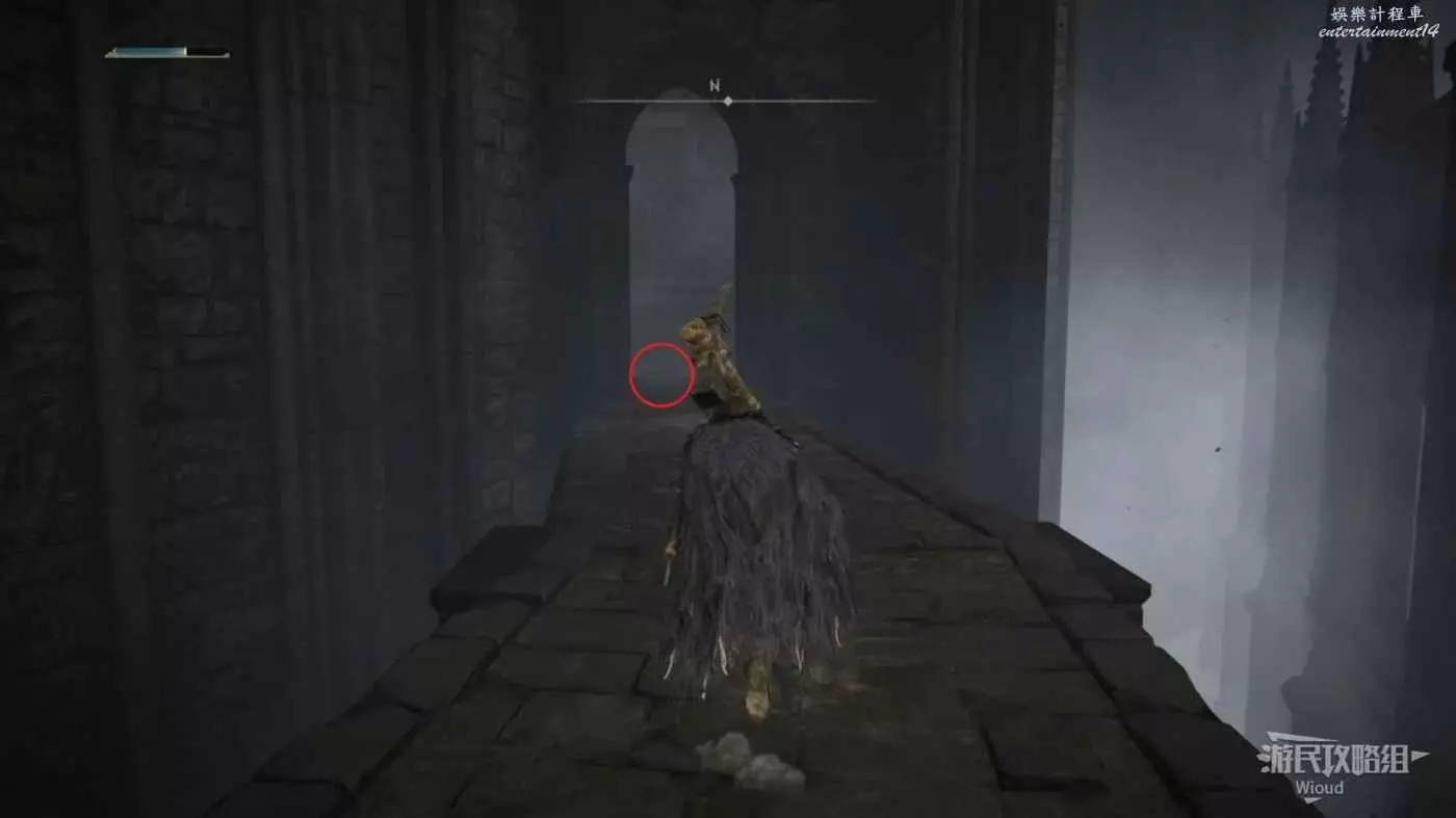此時往右走到頭,沿著樓梯繼續往上爬,看到有一個火焰騎士的房間時不要繼續爬樓梯,往左後方走。