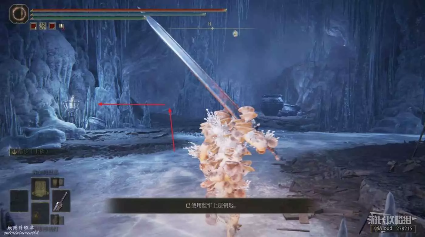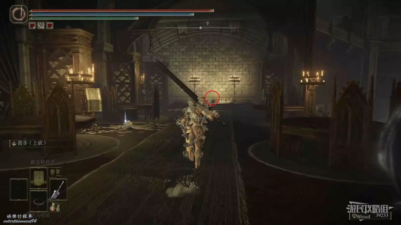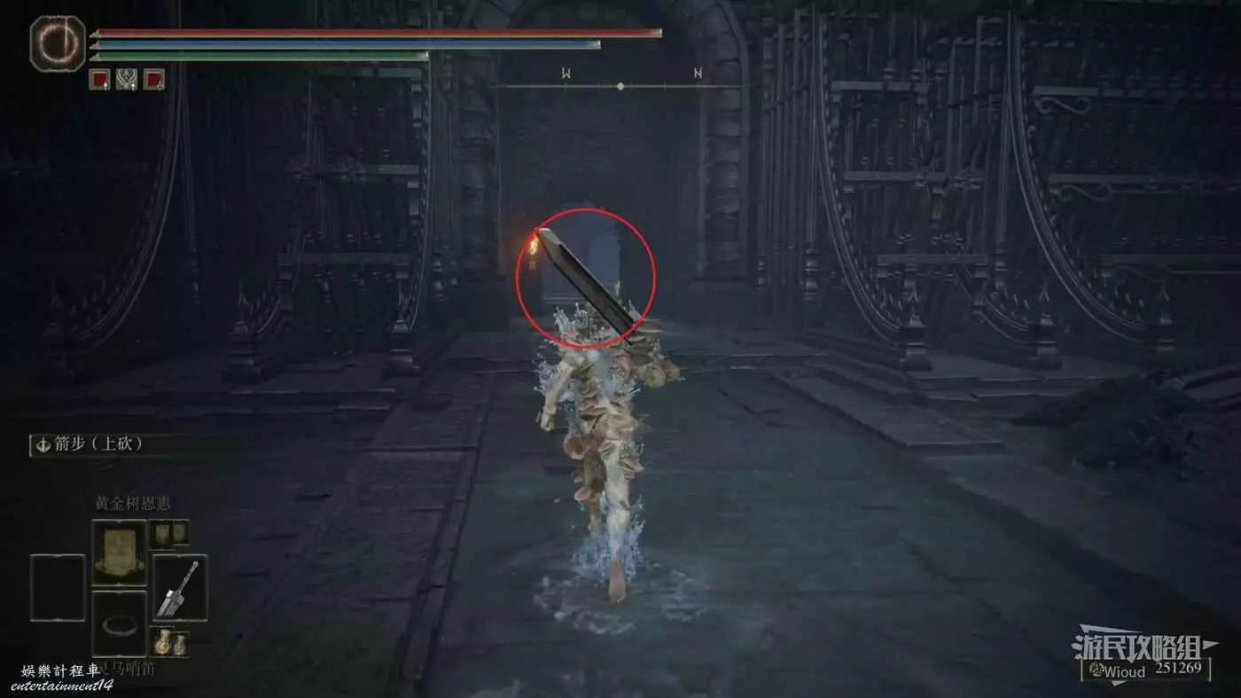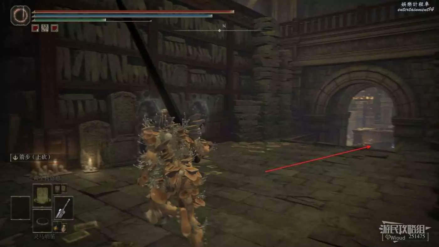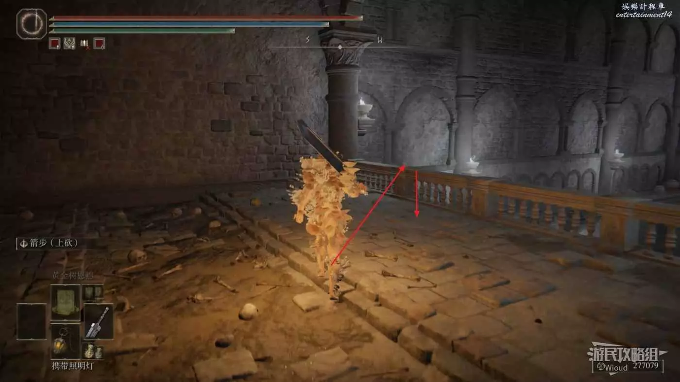 此時往右走到頭,沿著樓梯繼續往上爬,看到有一個火焰騎士的房間時不要繼續爬樓梯,往左後方走。