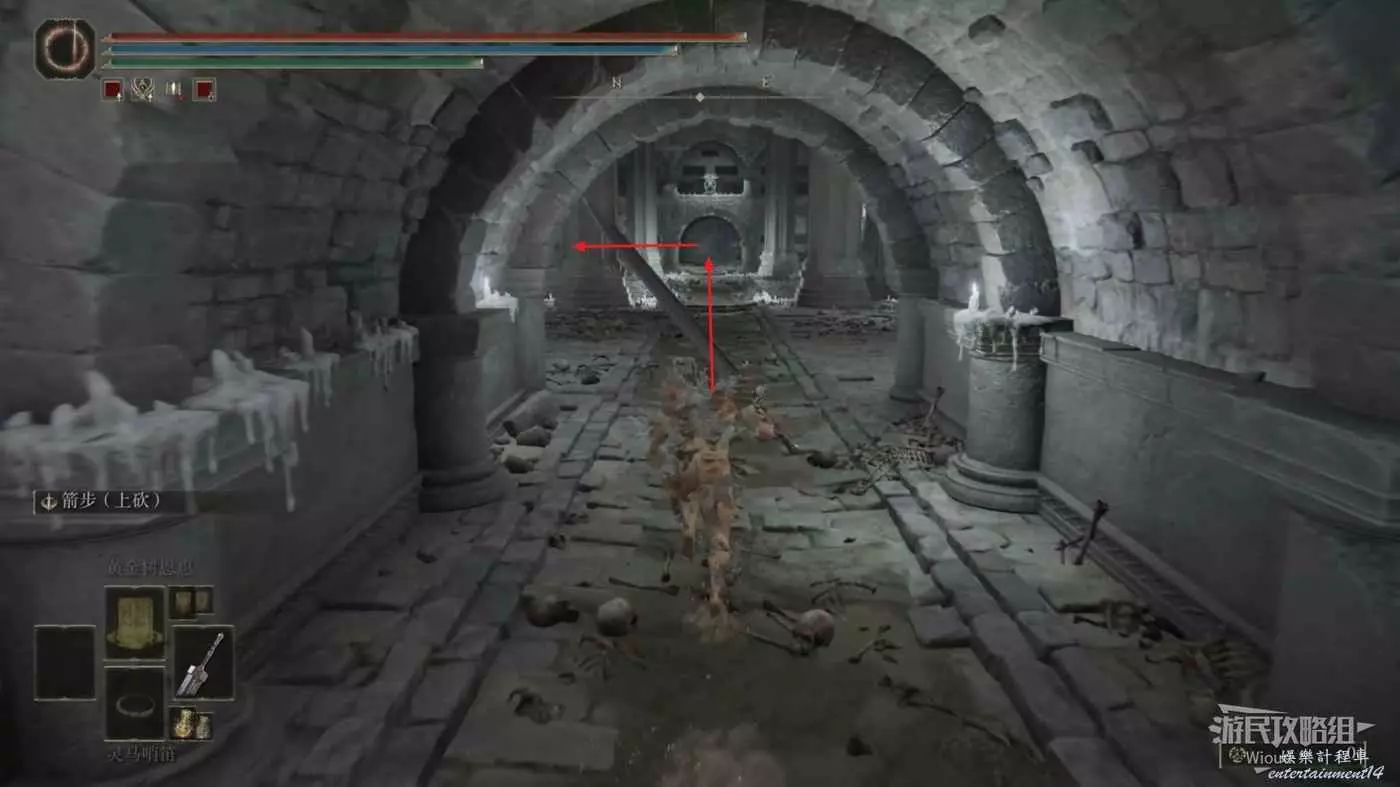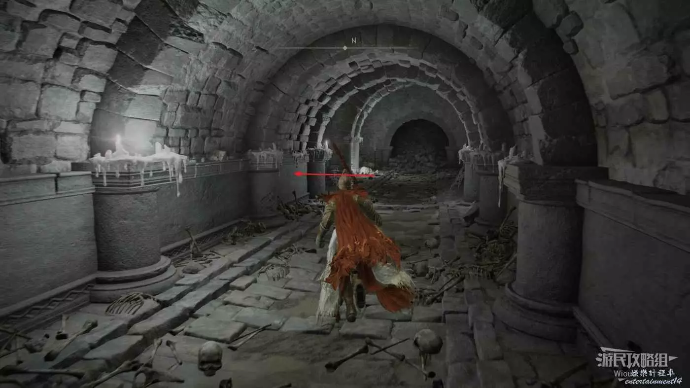 進入地下墓地先乘坐第一個升降梯往下走點亮賜福,接著往前走一段距離左轉來到一個大廳。