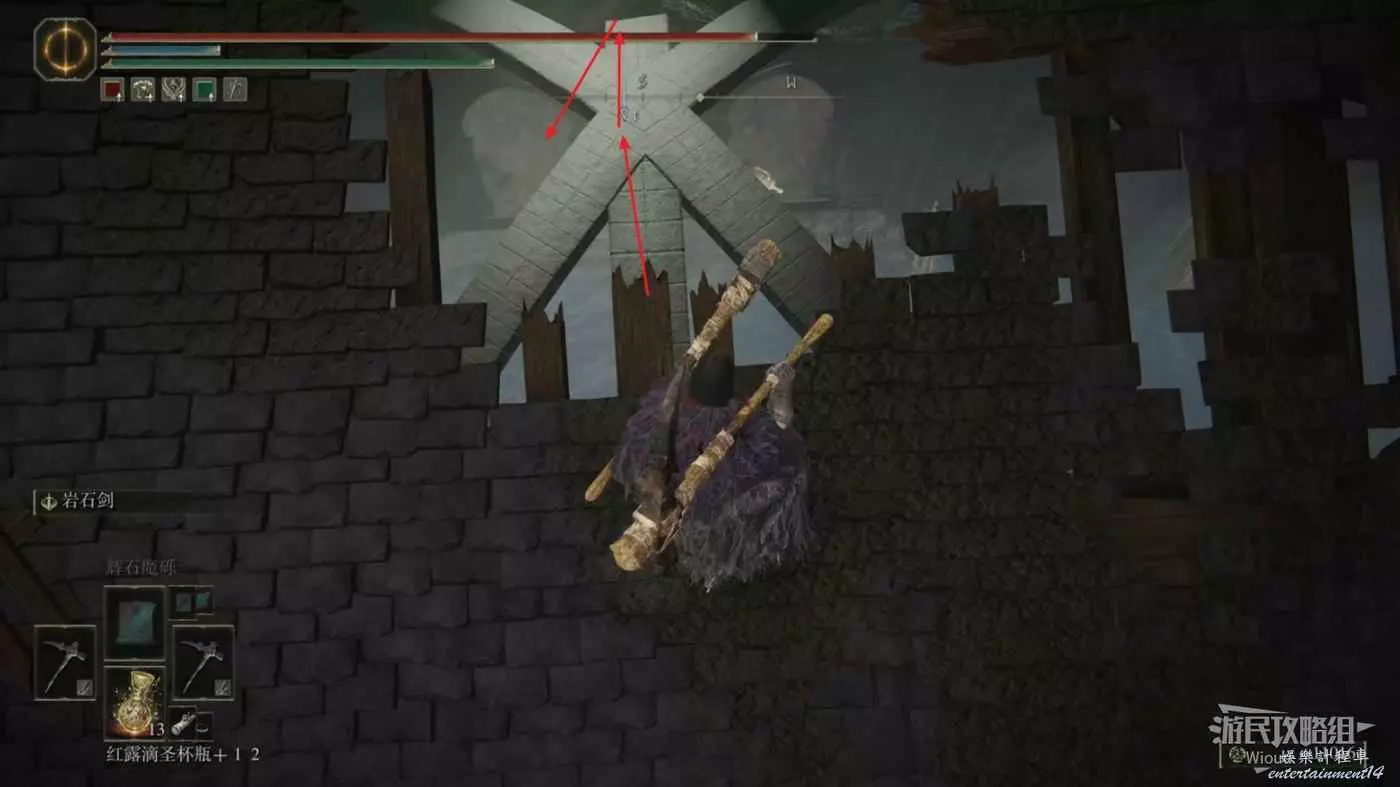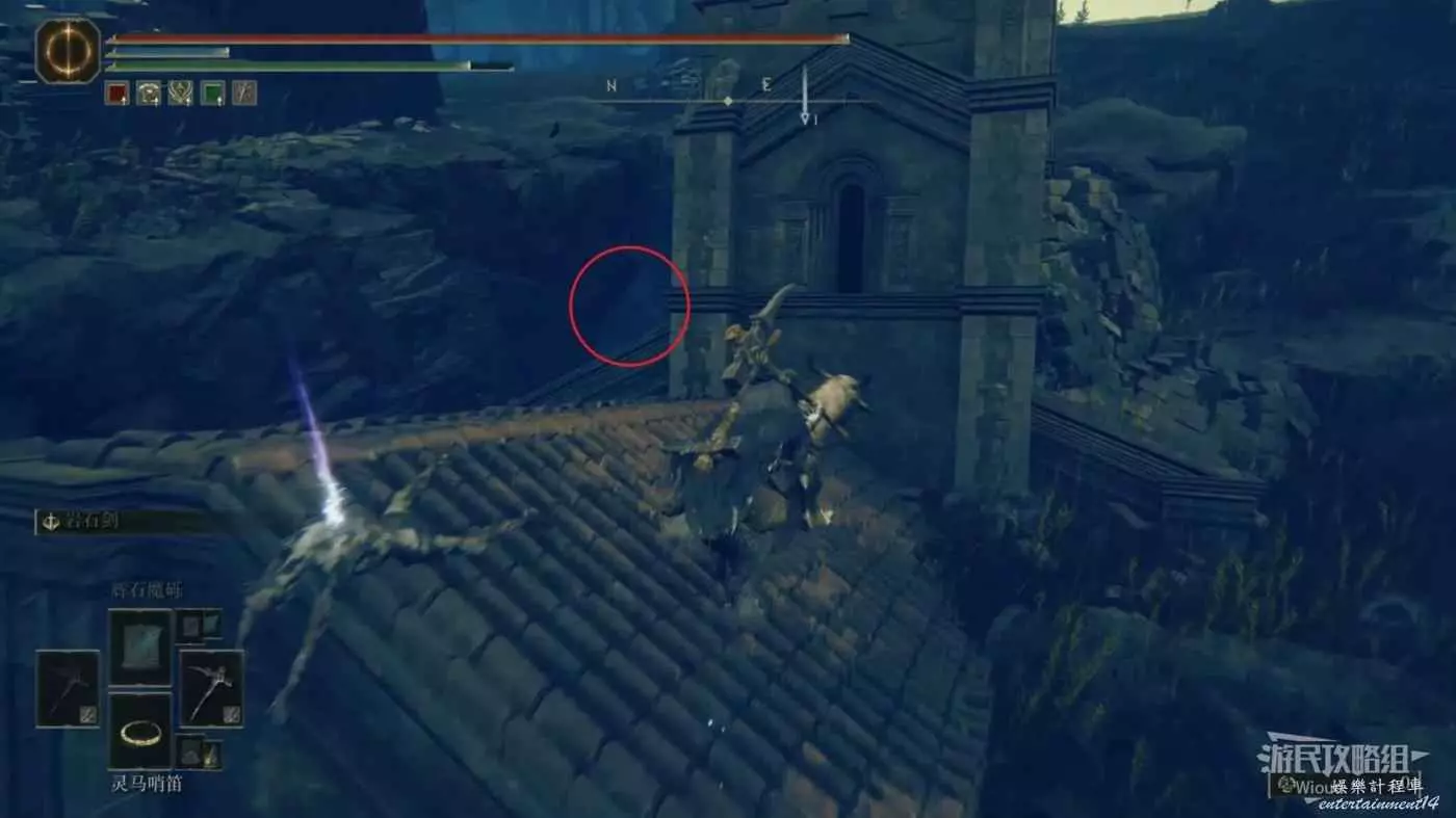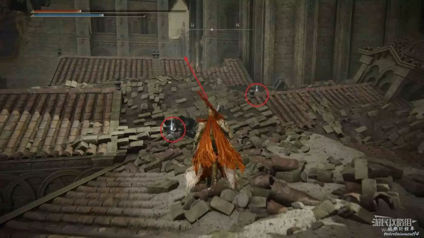 此時往左邊走,直接跳到右前方坍塌房屋的上面,可以直接看到右下方有一個房間的入口。